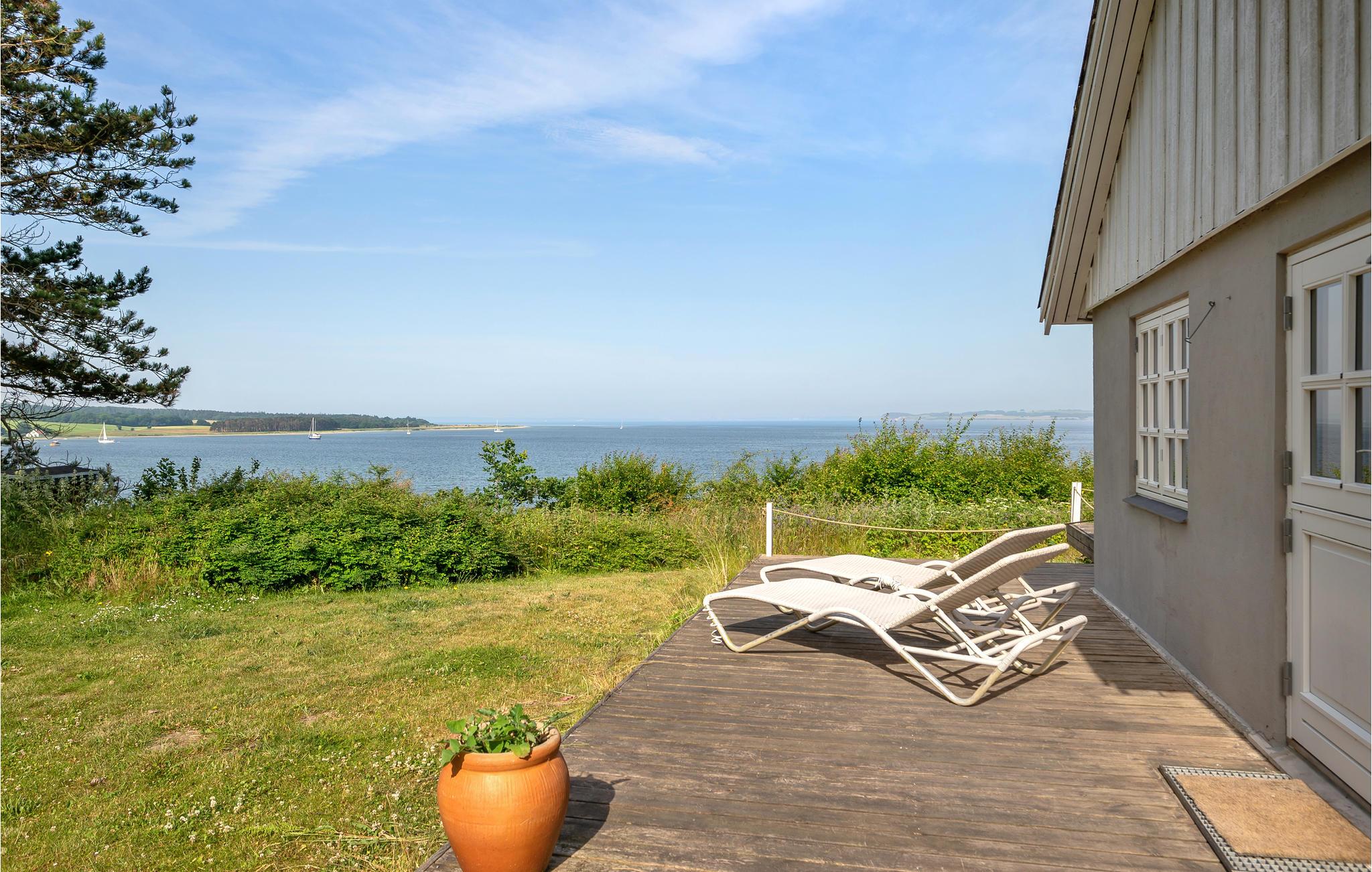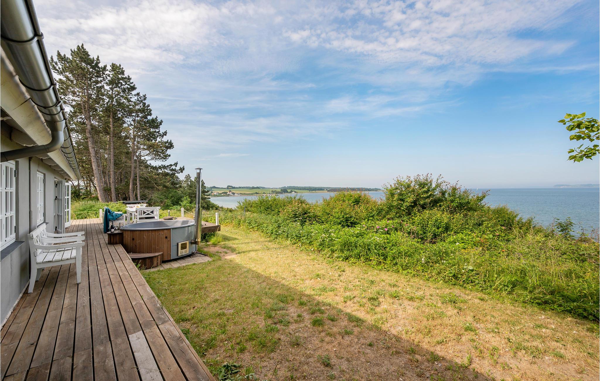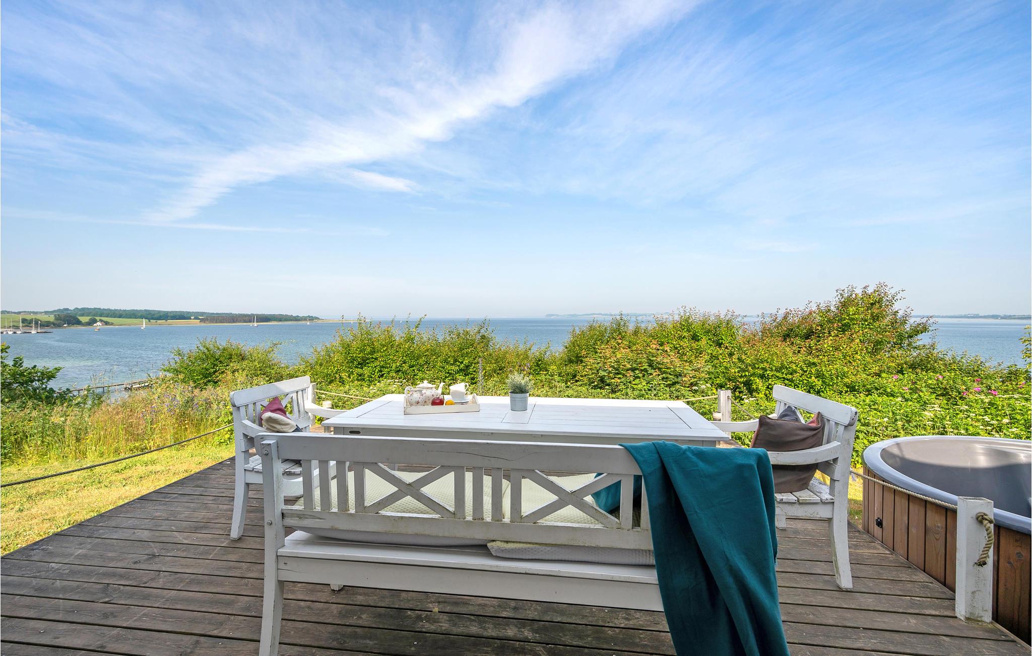 Nyd panoramaudsigten over havet fra dette moderne og nyrenoverede feriehus nær Helgenæs med unikke faciliteter.