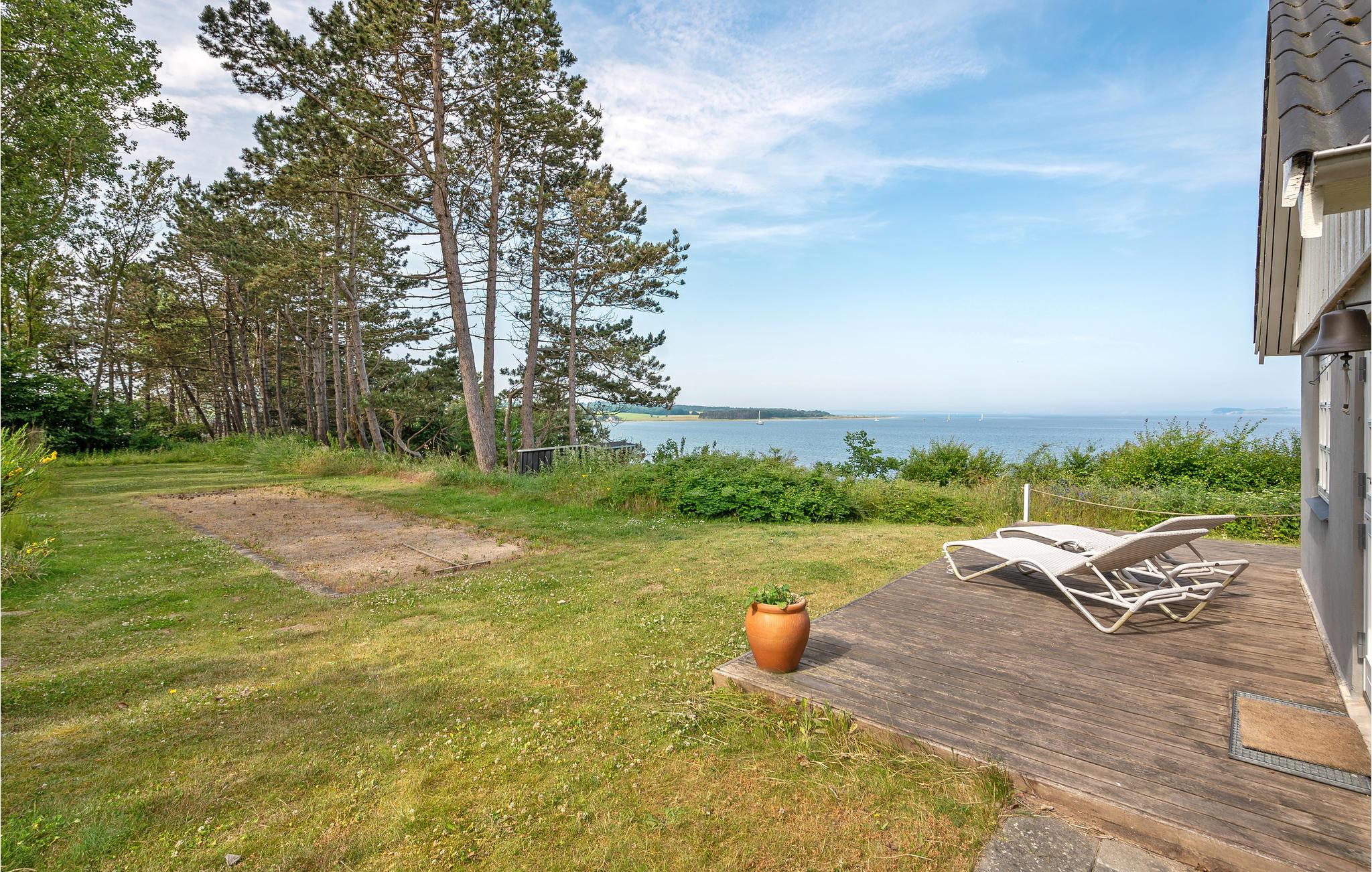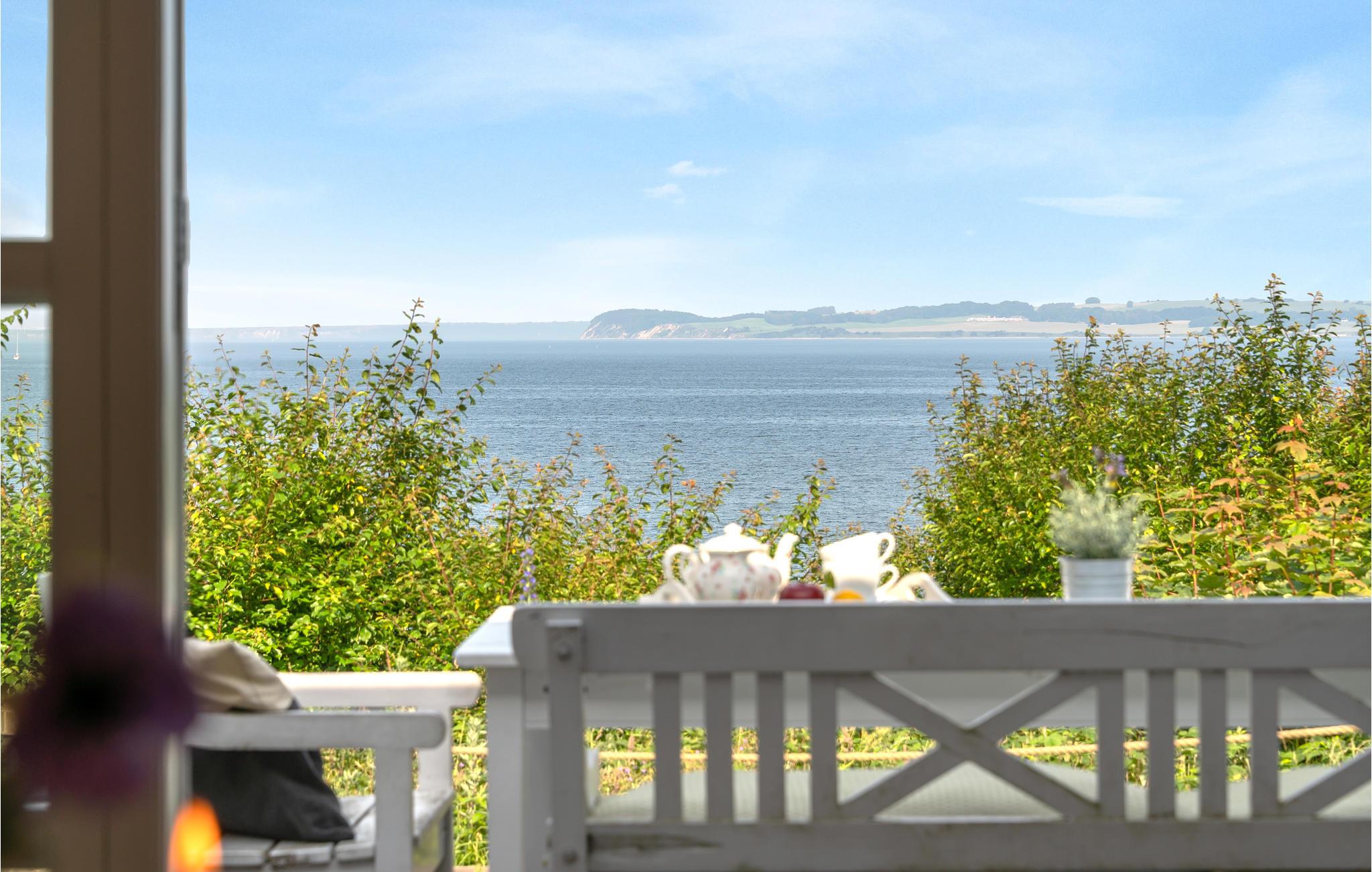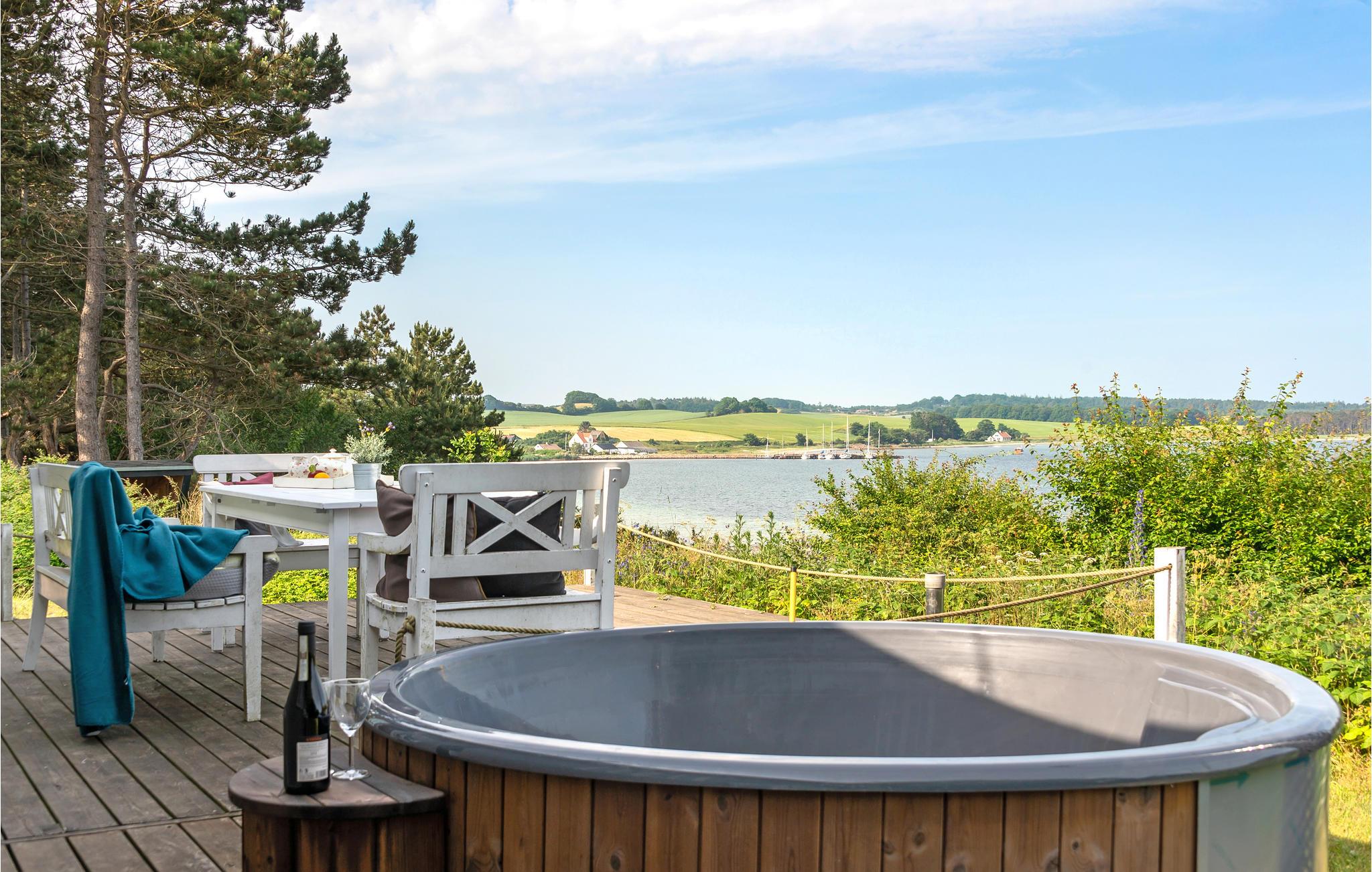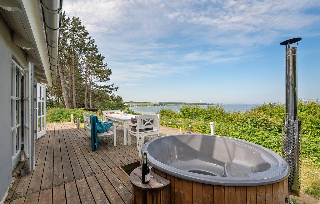Nyd panoramaudsigten over havet fra dette moderne og nyrenoverede feriehus nær Helgenæs med unikke faciliteter.