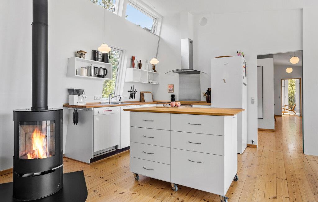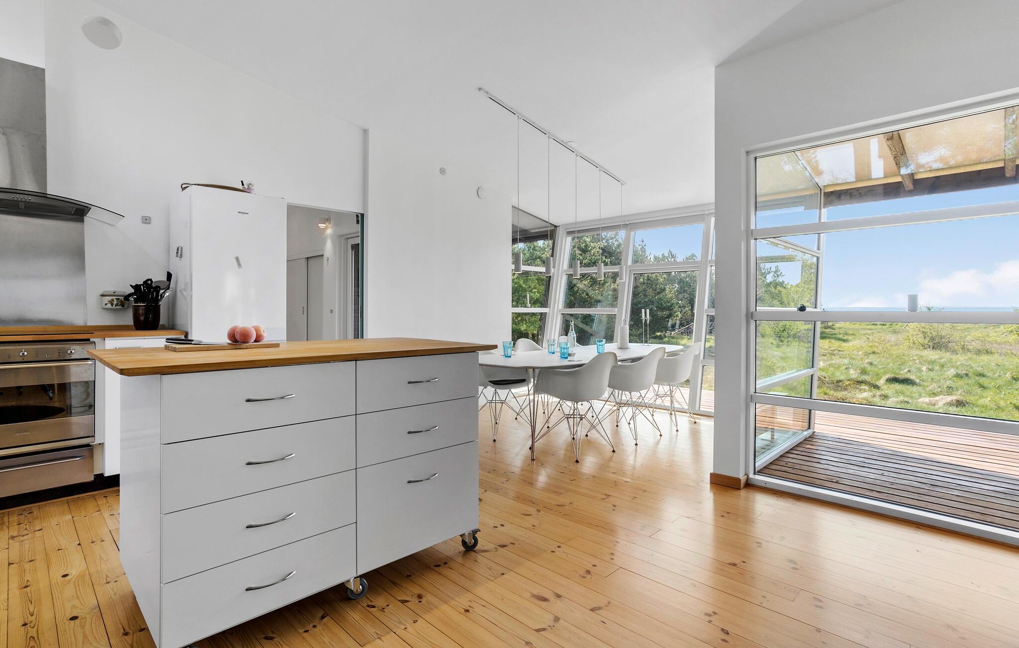 Velkommen til denne perle af et feriehus, der bliver jeres base på en vidunderlig ferie lige ved Limfjorden. Huset er flot og moderne indrettet med en åben planløsning. Køkken, spisestue og opholdsstue mødes i ét rum med et dejligt lysindfald og en smuk udsigt gennem de store vinduespartier. Indretningen er krydret med mange, fine ting på væggene og små, sjove detaljer, der giver rummene en hyggelig atmosfære. Fyr op i brændeovnen på de køligere dage og lad en herlig dag gå på hæld med brætspil eller en god film til flammernes stille knitren.