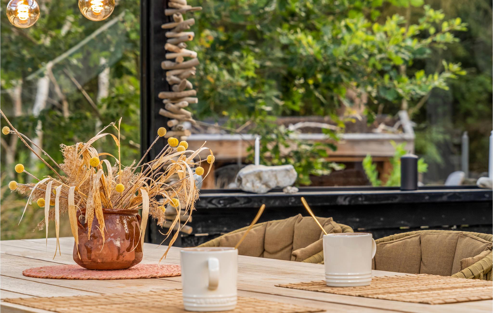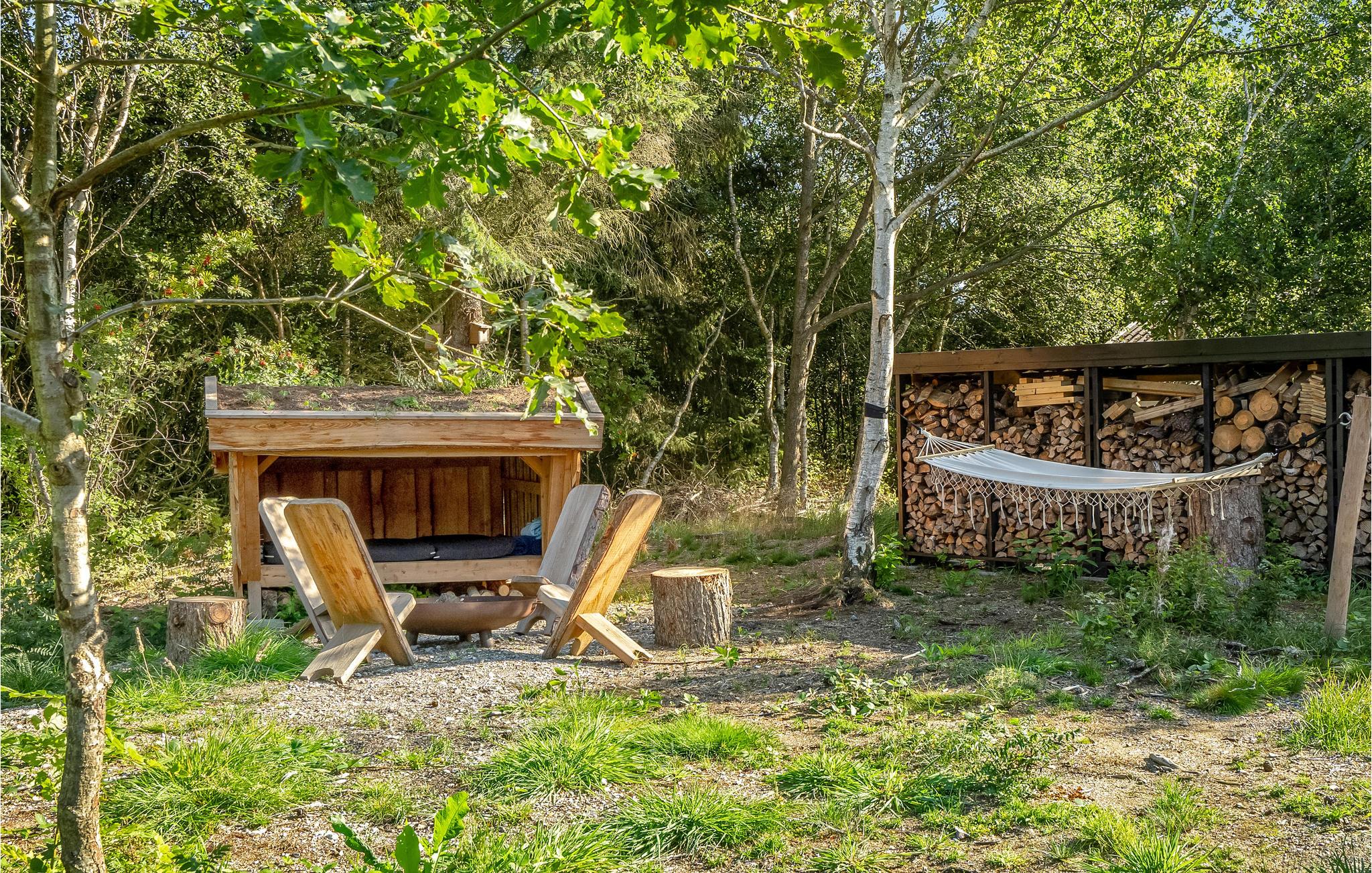 Sommerhuset ligger på en flot naturgrund med masser af plads til at lege. Slap af på terrassen med både åbne og overdækkede områder eller nyd solen på liggestolene med en spændende bog. Efter en aktiv feriedag inviterer vildmarksbadet og saunaen jer til at slappe af med lidt wellness. I kan også hygge jer omkring bålpladsen foran shelteret, hvor der også er madrasser, så I kan overnatte i den friske luft.