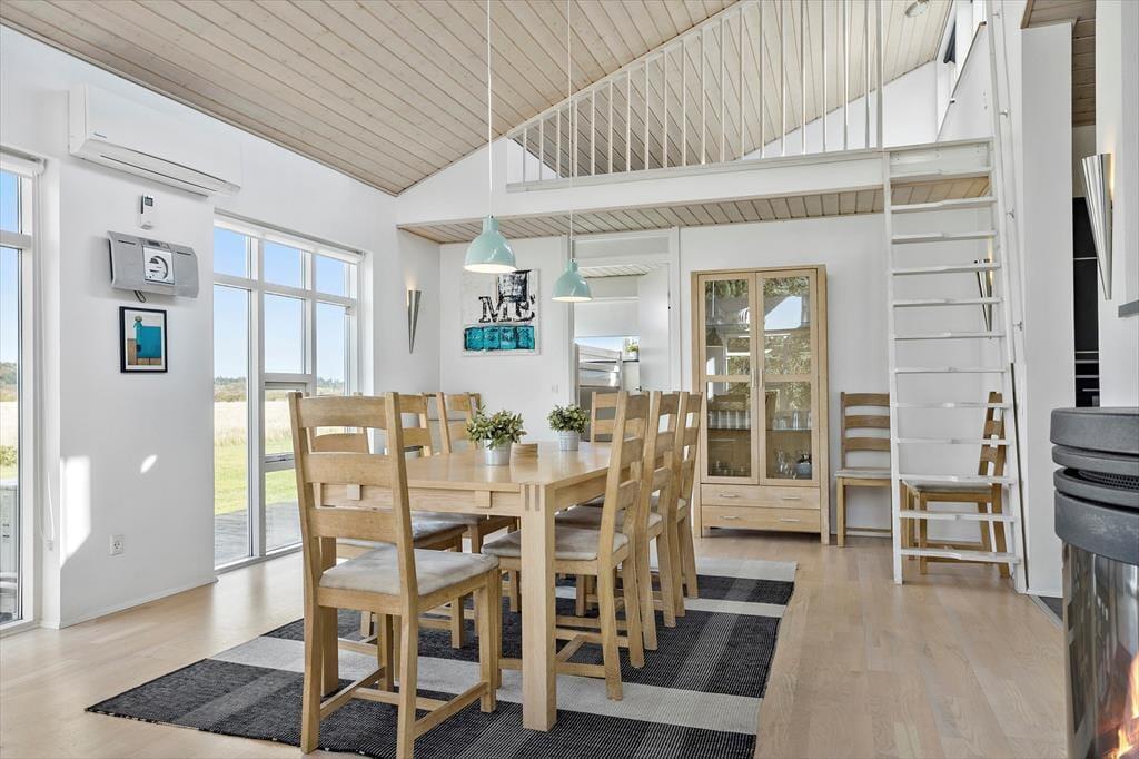 Når du træder ind i dette rummelige sommerhus, mødes du af en varm og indbydende atmosfære. Huset er udstyret med energibesparende varmepumpe og en hyggelig brændeovn, der sørger for en behagelig stemning året rundt. Uanset om du samles med familien til brætspil i den lyse stue eller nyder et glas vin foran brændeovnens knitren, byder huset på rig mulighed for afslapning. De to badeværelser, hvor det ene er udstyret med spabad og sauna, fuldender wellness-oplevelsen. Her kan du forkæle dig selv med et afslappende bad efter en dag ude i naturen og lade roen sænke sig.
