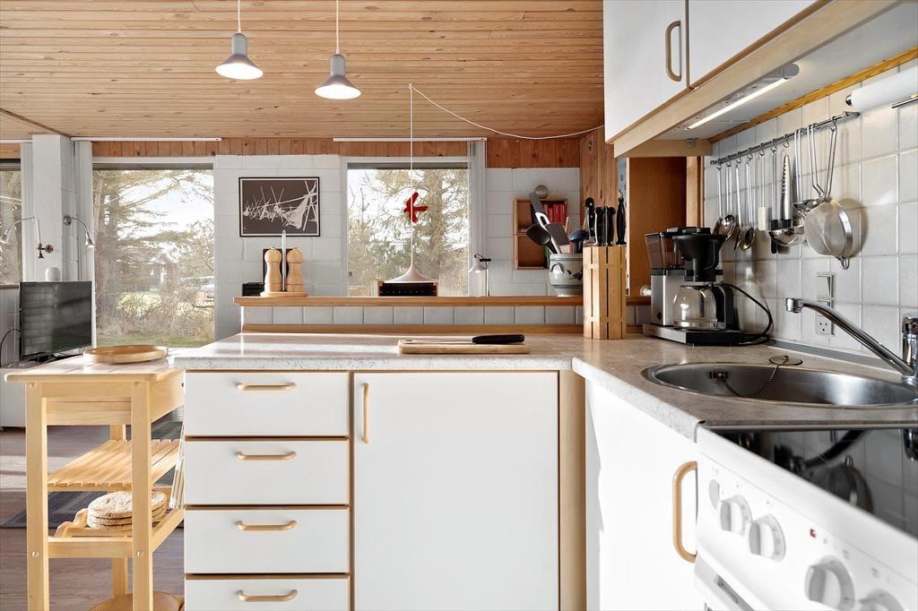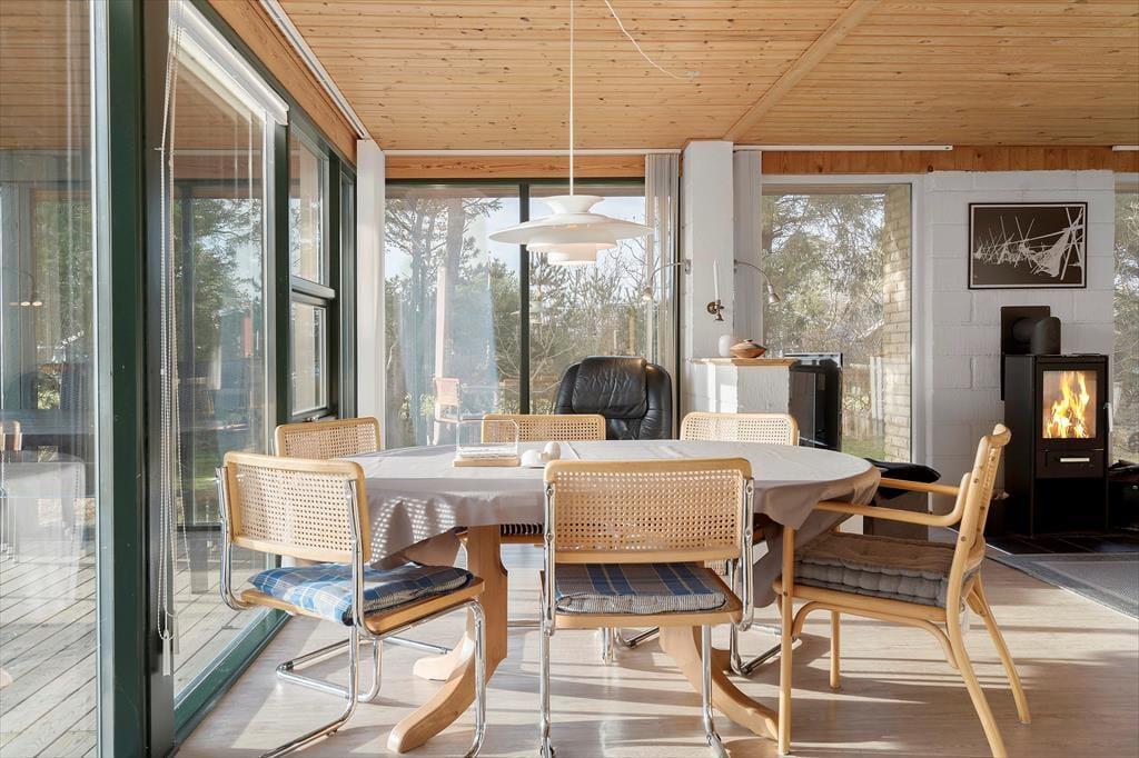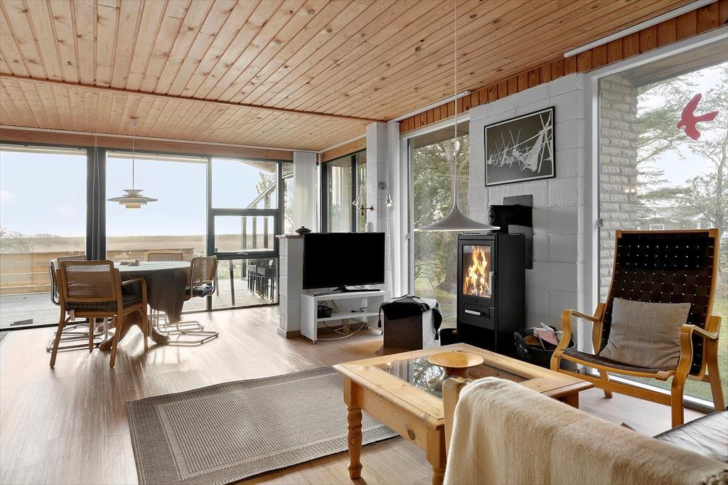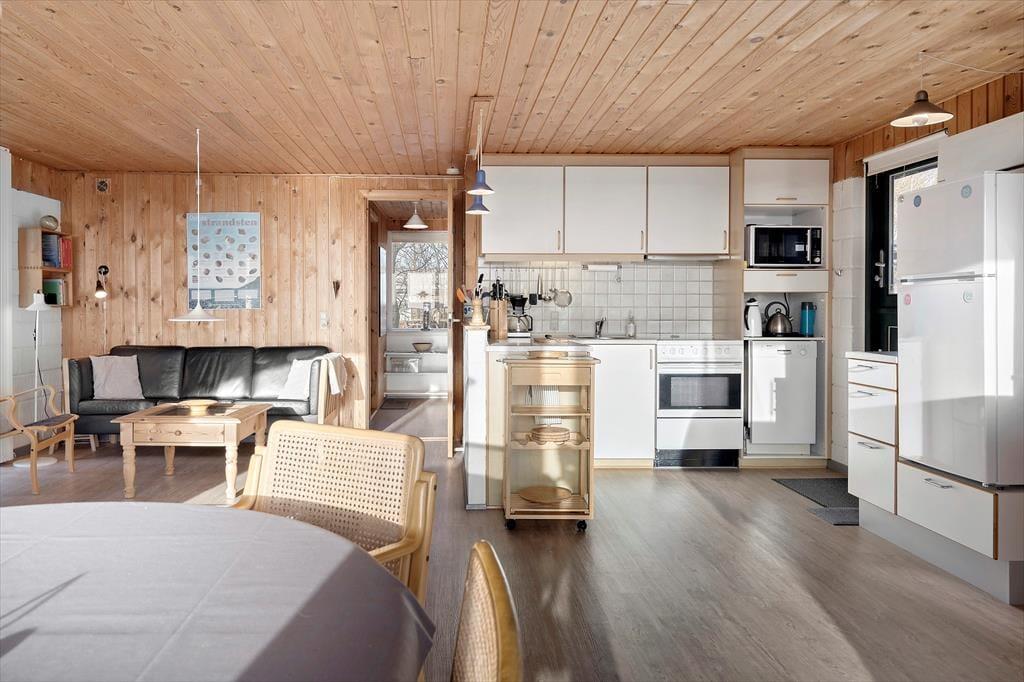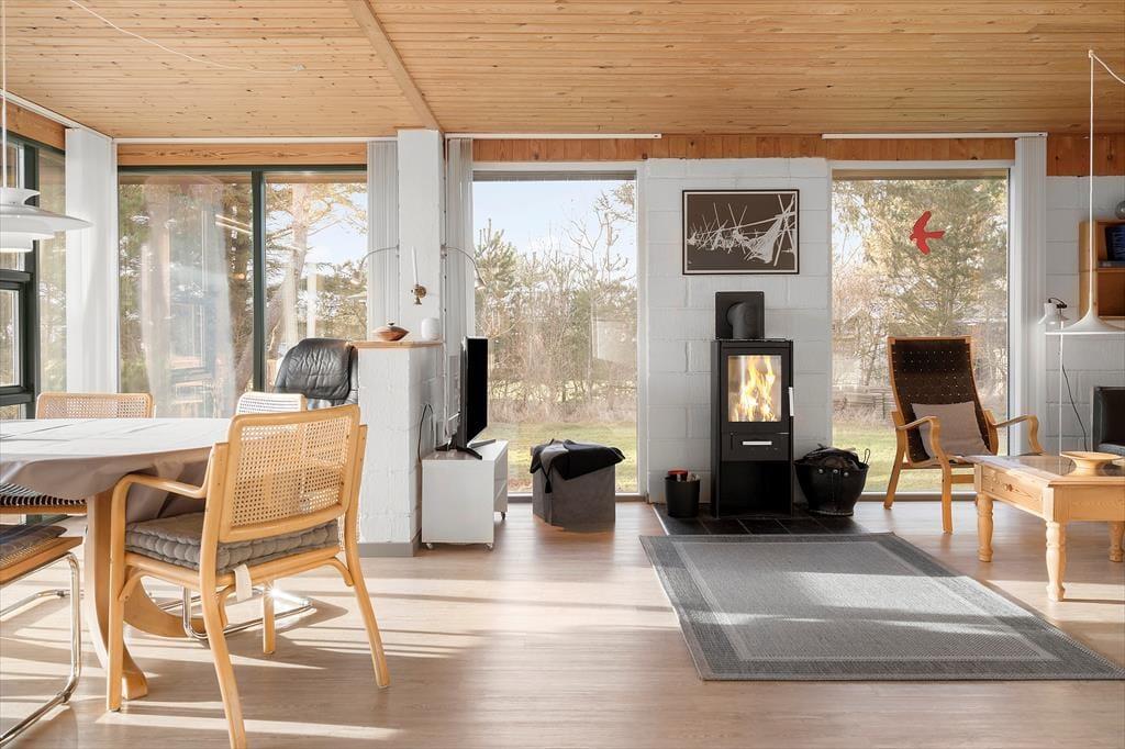 Når du træder ind i sommerhuset, mødes du af et lyst og venligt rum, hvor hyggen straks breder sig. Her kan familien samles omkring brændeovnen, der med sine levende flammer spreder varme og stemning på kølige aftener. Det åbne og lyse indretning giver plads til både nærvær og afslapning – uanset om du vil fordybe dig i en god bog, nyde en stille stund med kaffe eller spille spil sammen. Sommerhuset er møbleret med komfort og charme, så du let kan finde ro og velvære. Her er plads til både familie og venner, der kan nyde at være sammen i et hjemligt og indbydende miljø, hvor fjordens rolige udsigt også kan skimtes indefra.