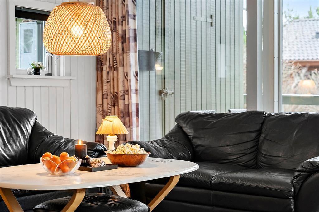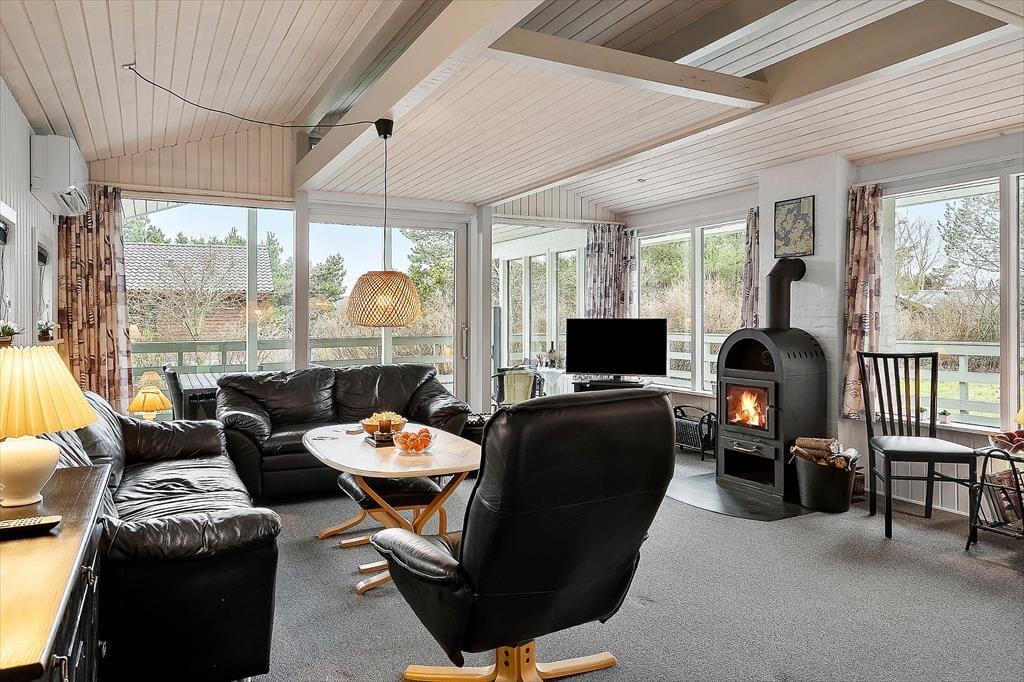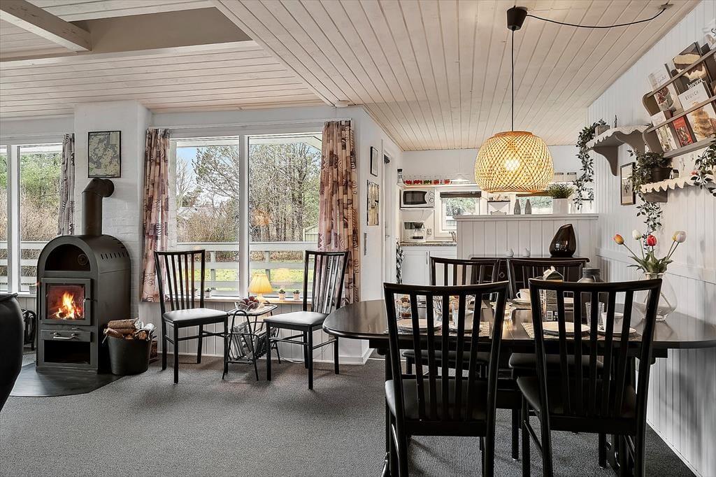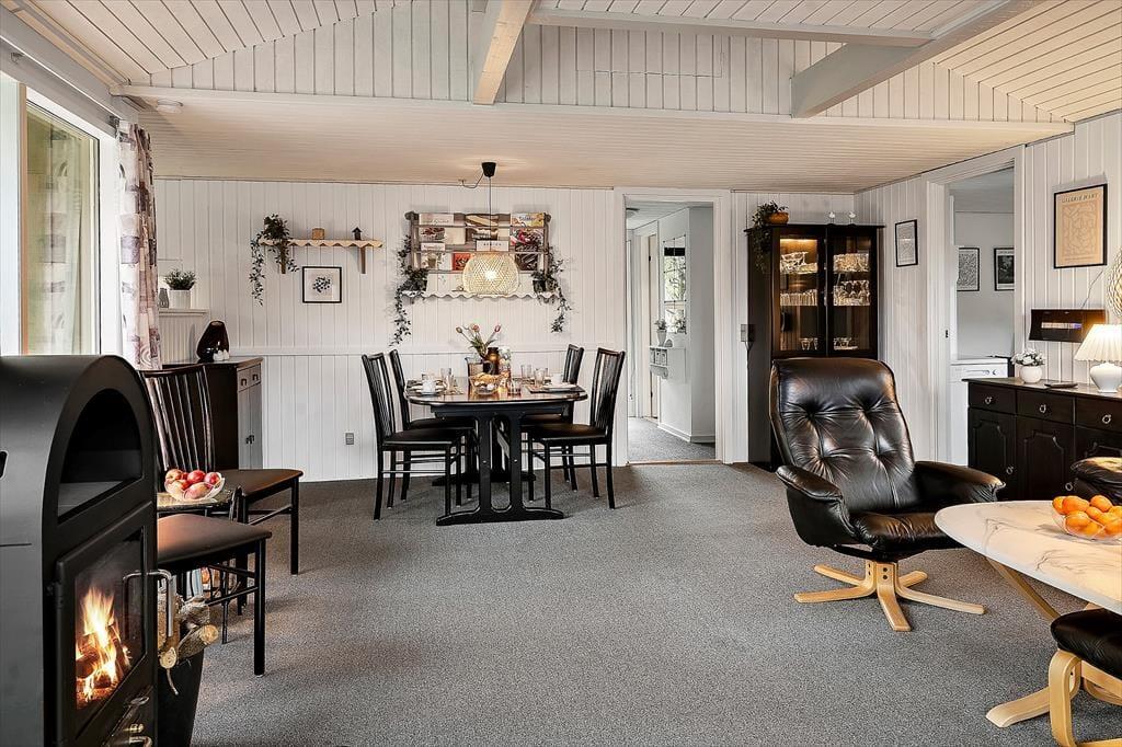 Indenfor mødes du af en lys og indbydende indretning, hvor hyggen straks mærkes. Sommerhuset er indrettet med fokus på afslapning og samvær, og de lyse farvetoner understøtter den rolige feriestemning. I opholdsrummet kan du samle familien til lange aftener med spil og snak, mens brændeovnen knitrer i baggrunden og spreder varme på køligere dage. Det er let at forestille sig en stille morgen med kaffe i hånden, mens dagslyset strømmer ind gennem vinduerne, eller en rolig aften, hvor flammernes skær skaber en helt særlig stemning. Indretningen gør det nemt for både voksne og børn at finde sig til rette, og der er tænkt på, at alle kan være sammen – men også trække sig tilbage, når der er brug for ro.