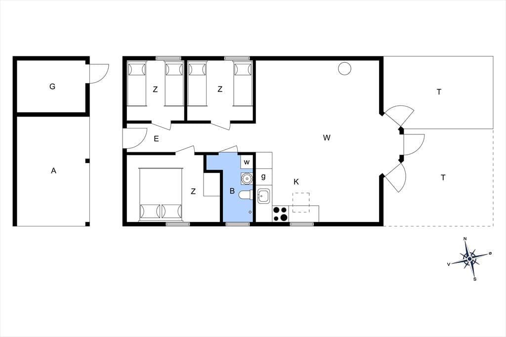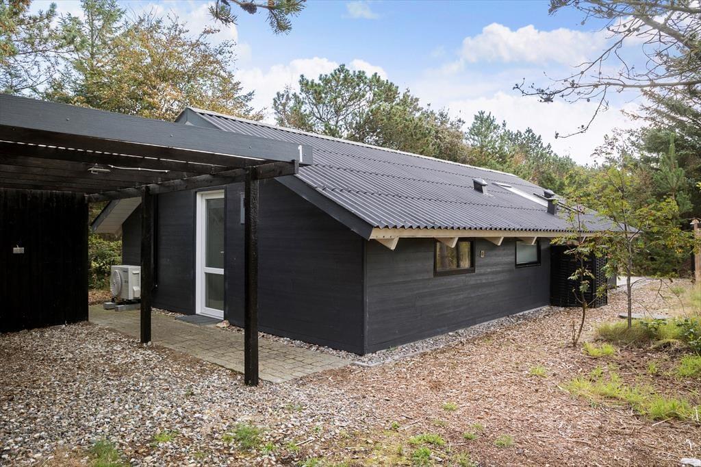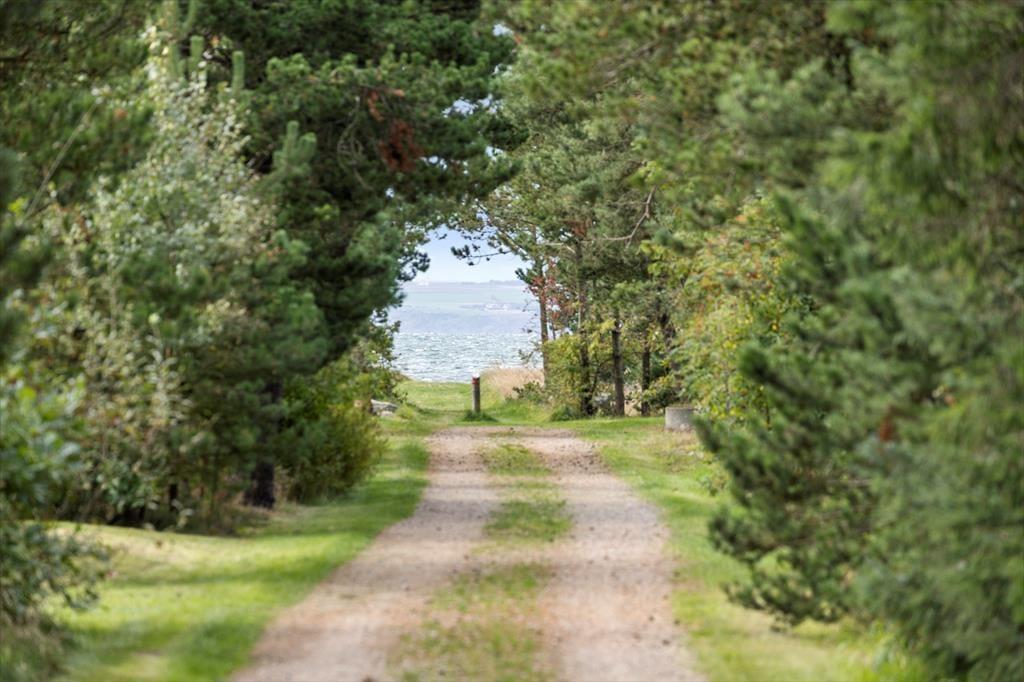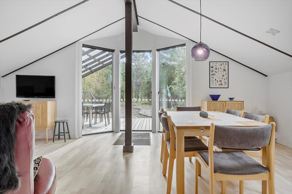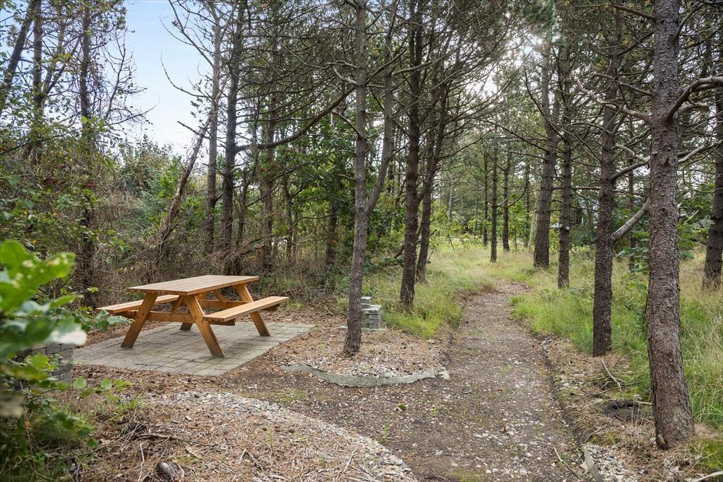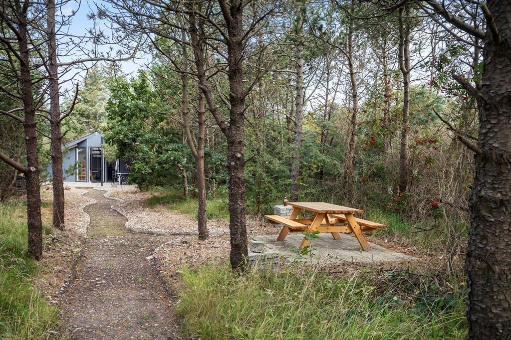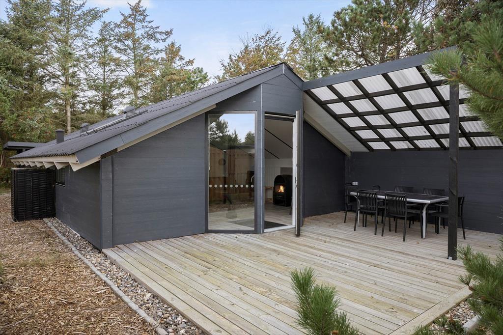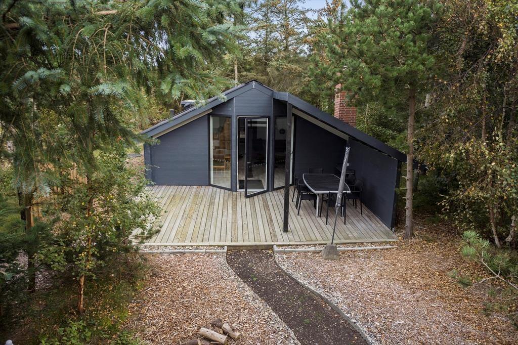 Fra sommerhusets stue har du direkte adgang til en stor og delvist overdækket træterrasse, der hurtigt kan blive din foretrukne opholdsplads, når vejret er lunt, og der er sommer i luften. Du og dine kære har gode havemøbler, en parasol og en grill til rådighed, så det er fristende at blive siddende og nyde driverlivet, lige fra dagens første kop kaffe og indtil tusmørket sænker sig efter et lækkert aftensmåltid. Naturgrundens høje træer giver dig fornemmelsen af at sidde midt i et skovbryn, og mon ikke der også er fuglesang fra oven til at forstærke den idylliske stemning.