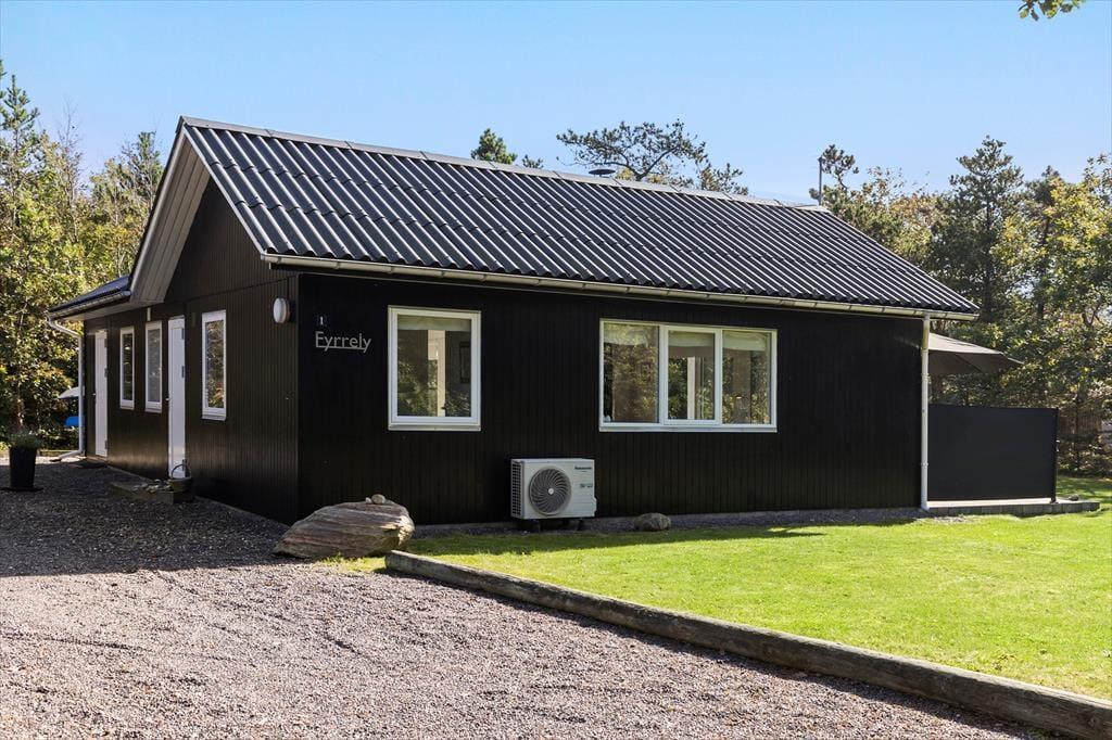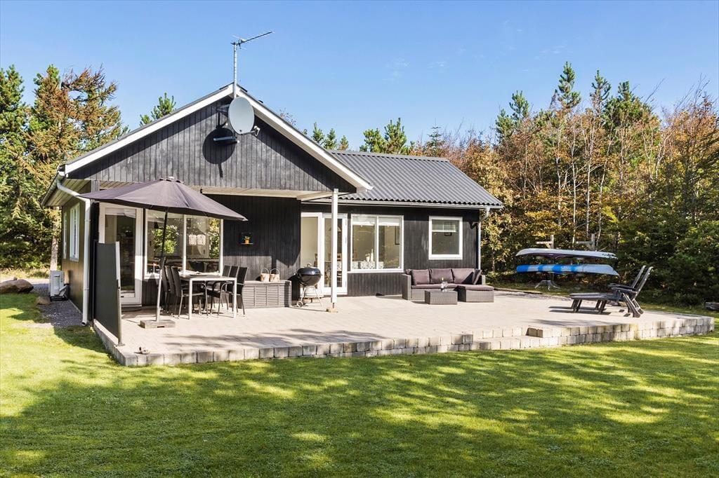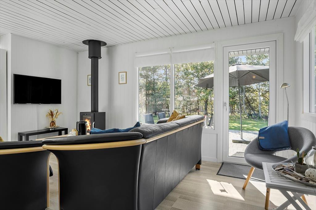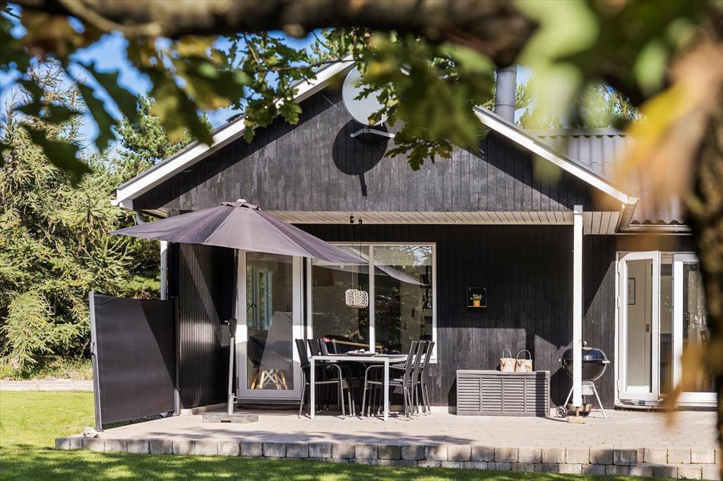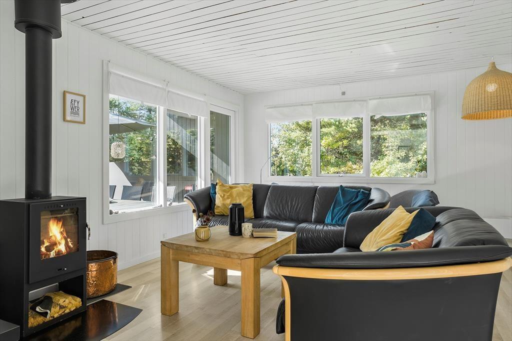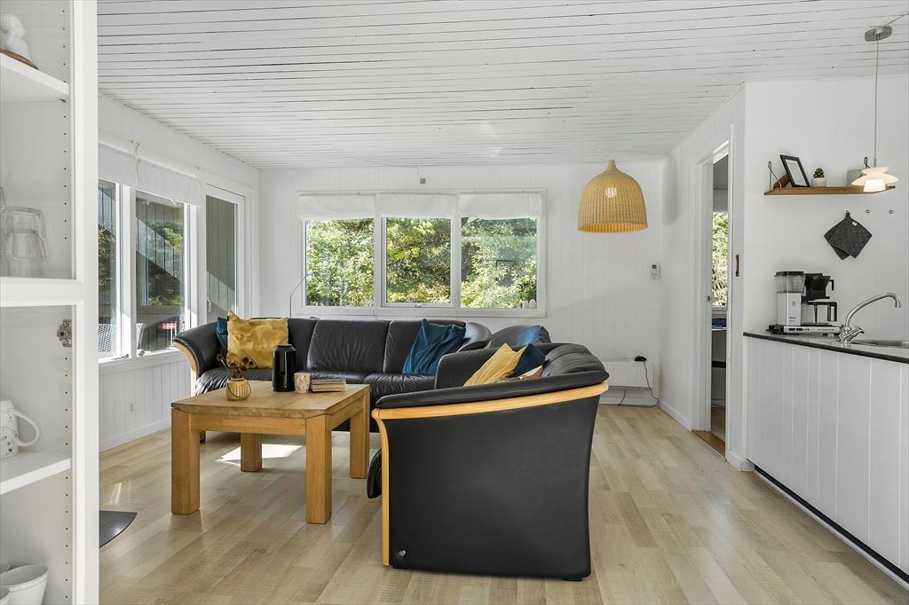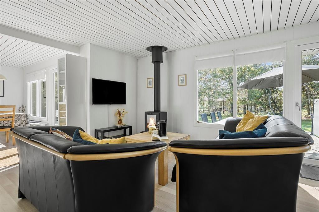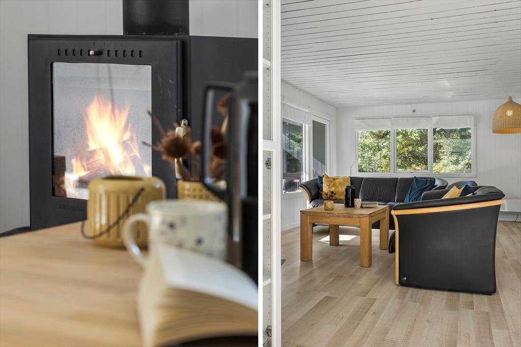 Bag den sorte træfacade emmer de lyse rum af hygge og afslapning. Når du sætter dig i sofaen med en spændende krimi eller finder et brætspil frem fra feriebagagen, kan du straks føle dig hjemme. Er det køligt udenfor, kan du tænde op i brændeovnen i stuen og lave varm kakao i det åbne køkken. Hvis vejret derimod er lunt og sommerligt, kan du åbne havedørene på vid gab, så du og dine kære har direkte adgang til terrassen. Planløsningen byder på et godt badeværelse med brusebad og tre soveværelser med i alt fem sengepladser.