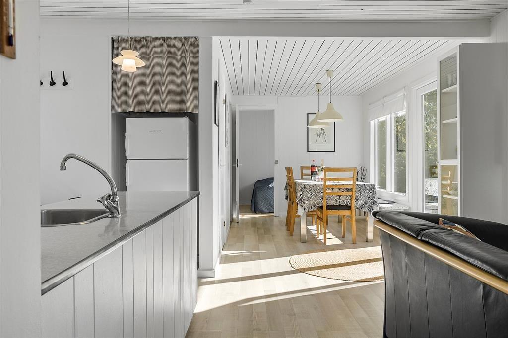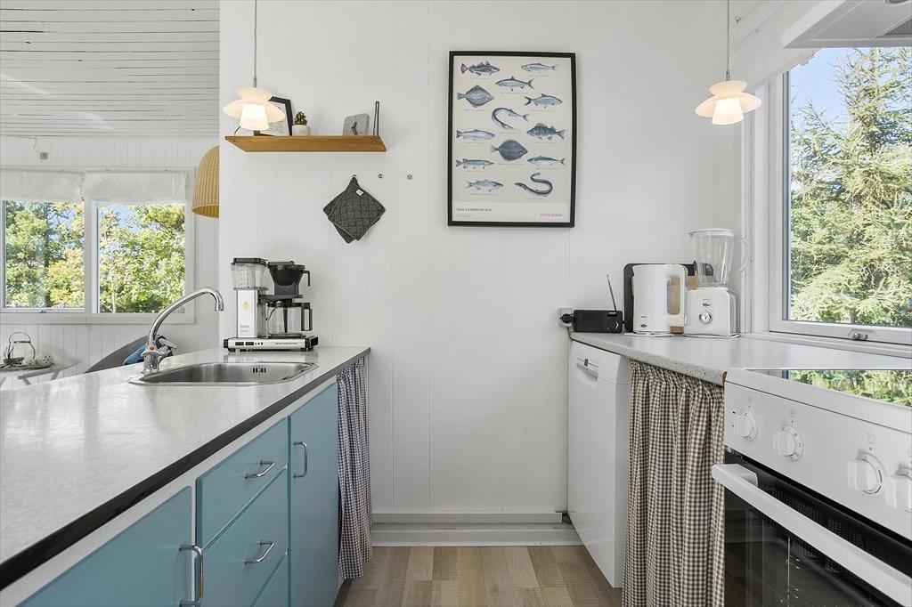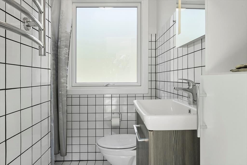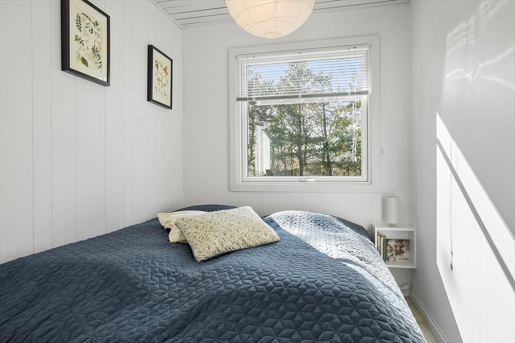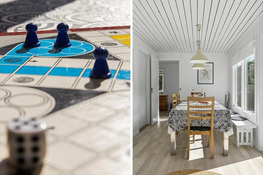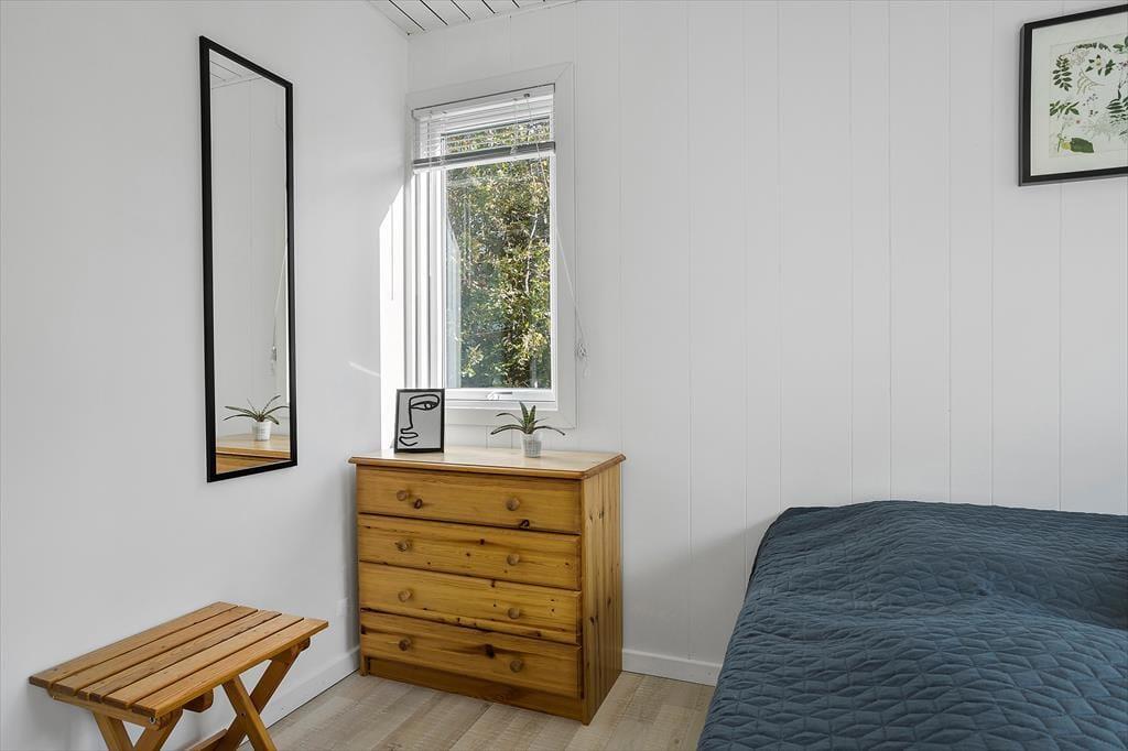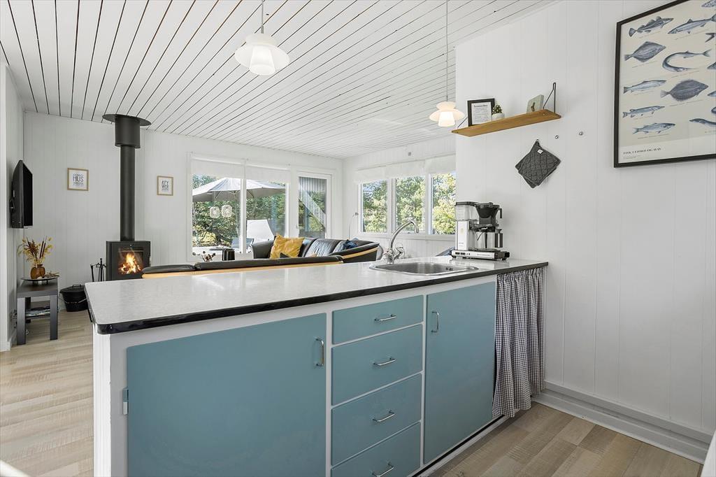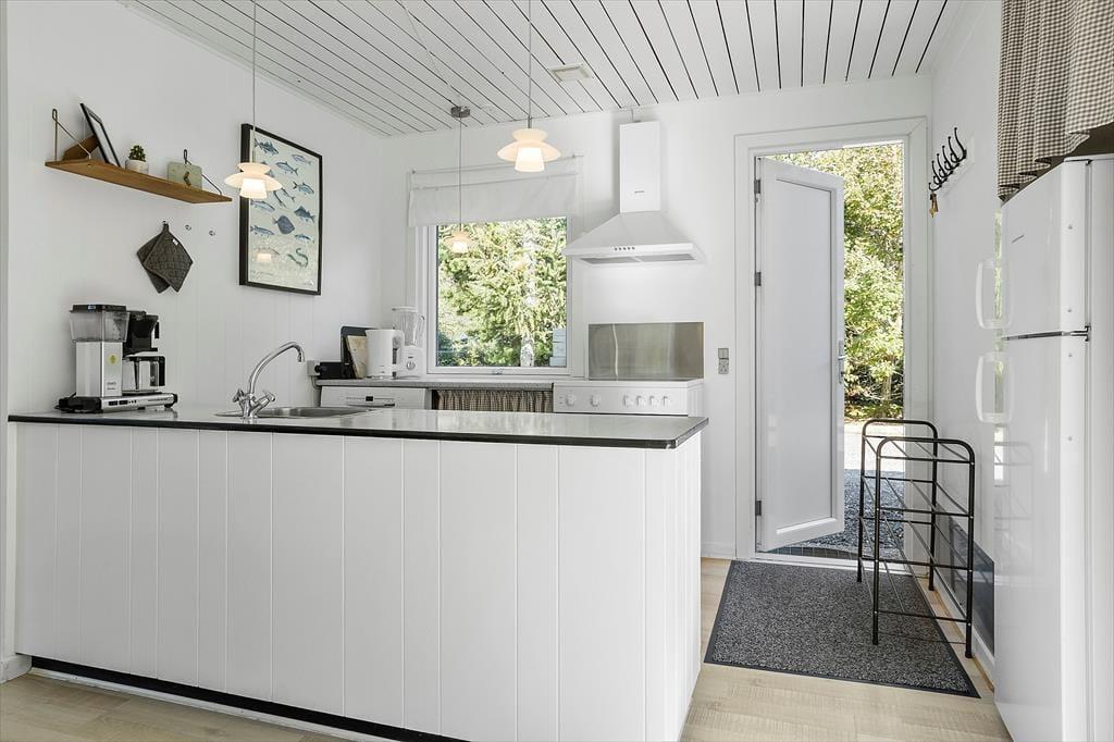 Bag den sorte træfacade emmer de lyse rum af hygge og afslapning. Når du sætter dig i sofaen med en spændende krimi eller finder et brætspil frem fra feriebagagen, kan du straks føle dig hjemme. Er det køligt udenfor, kan du tænde op i brændeovnen i stuen og lave varm kakao i det åbne køkken. Hvis vejret derimod er lunt og sommerligt, kan du åbne havedørene på vid gab, så du og dine kære har direkte adgang til terrassen. Planløsningen byder på et godt badeværelse med brusebad og tre soveværelser med i alt fem sengepladser.