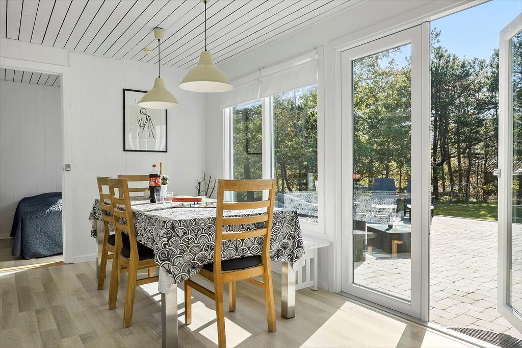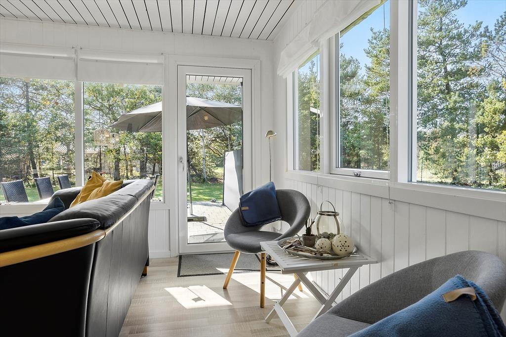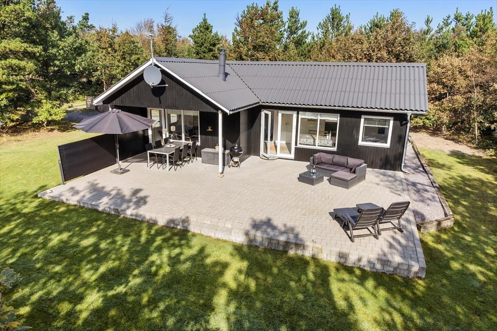 Udearealerne er en drøm for alle, der elsker terrassehygge, havespil og grønne, rolige omgivelser. Den sydvendte terrasse er udstyret med komfortable havemøbler, liggestole og en grill, så du og dine gæster kan nyde solskinstimerne i det fri. I kan selvfølgelig også blive siddende, efter solen er gået ned, hvis I vil have endnu mere af den friske luft og det søde ferieliv. På græsplænen har I god plads til at lege og spille bold, og hvis I har brug for mere plads at boltre jer på, er der kun 200 meter til stranden. Har du været nede for at tage en dukkert, kan du, takket være den korte afstand, hurtigt være tilbage i den ugenerede og læ fyldte have.