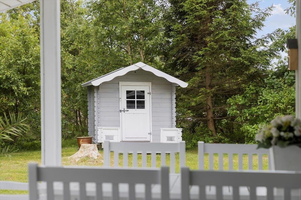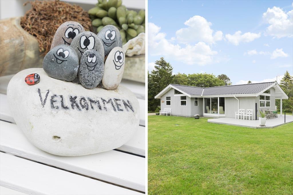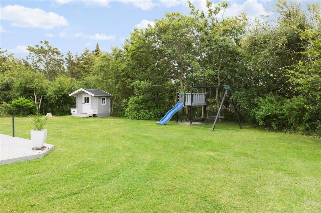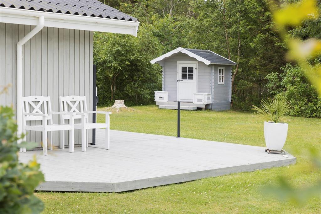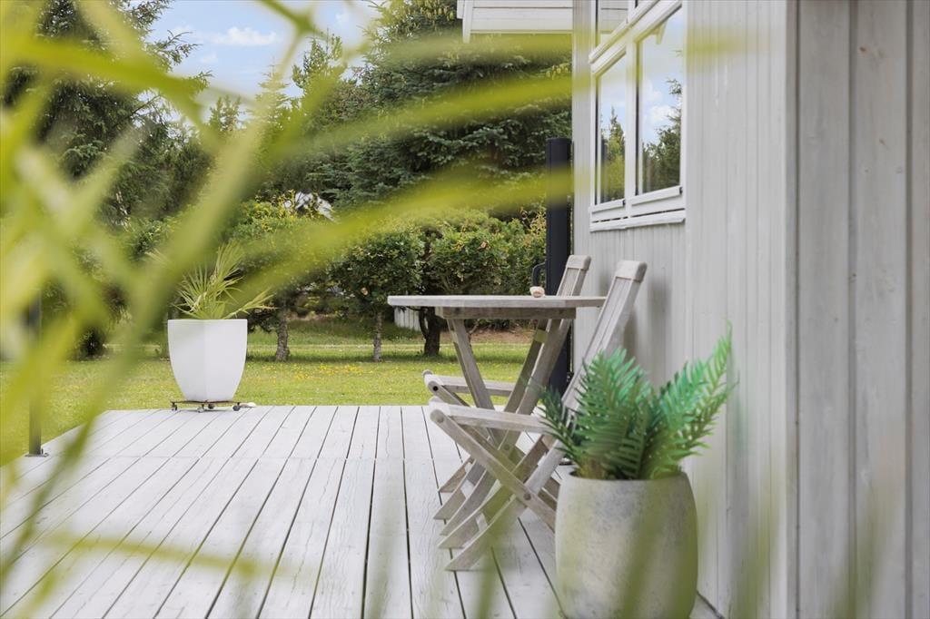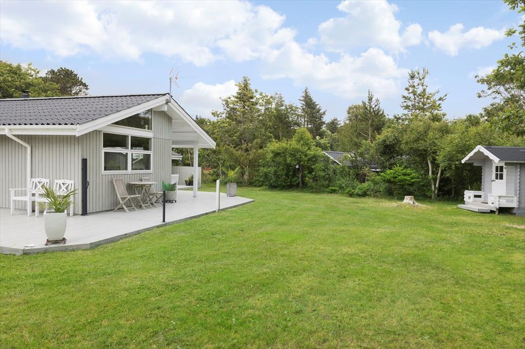 Huset ligger på en 1250 m² stor og grøn grund, og på grund af havens tætte randbeplantning kan I nyde livet på terrassen helt i fred. Terrassen smyger sig om flere af husets sider, så der er flere gode solkroge at vælge imellem, inklusiv et overdækket terrasseareal. Bilen kan I parkere i carporten, og er der små børn med på ferien, er der legehus, gyngestativ og en stor græsplæne, de kan boltre sig på.