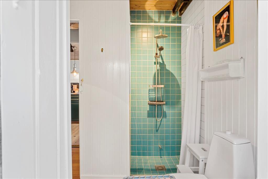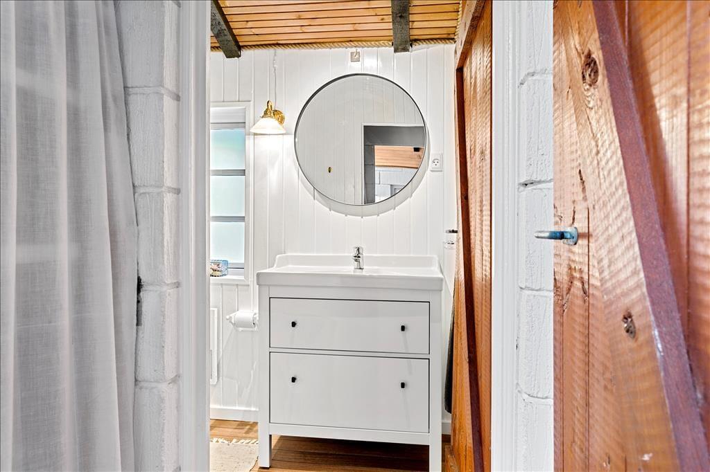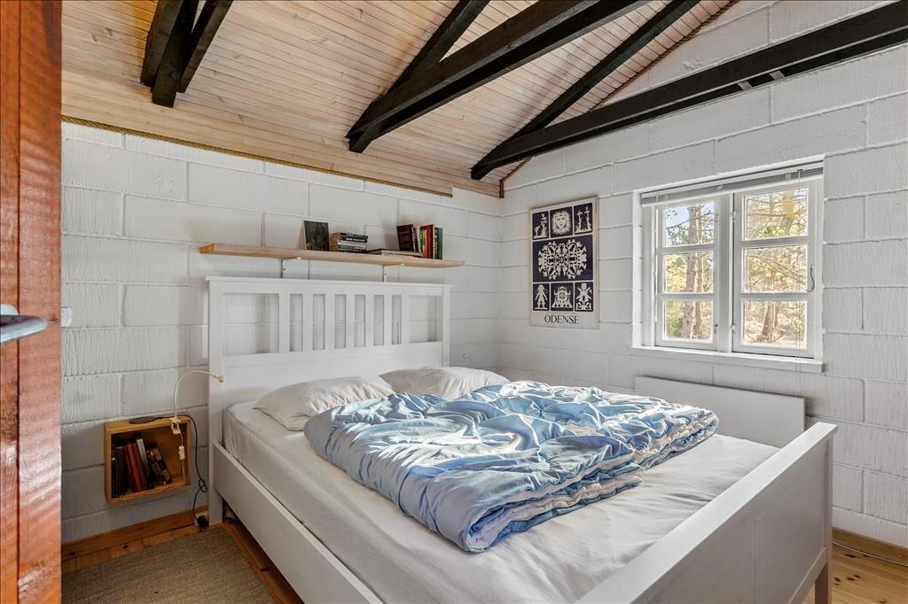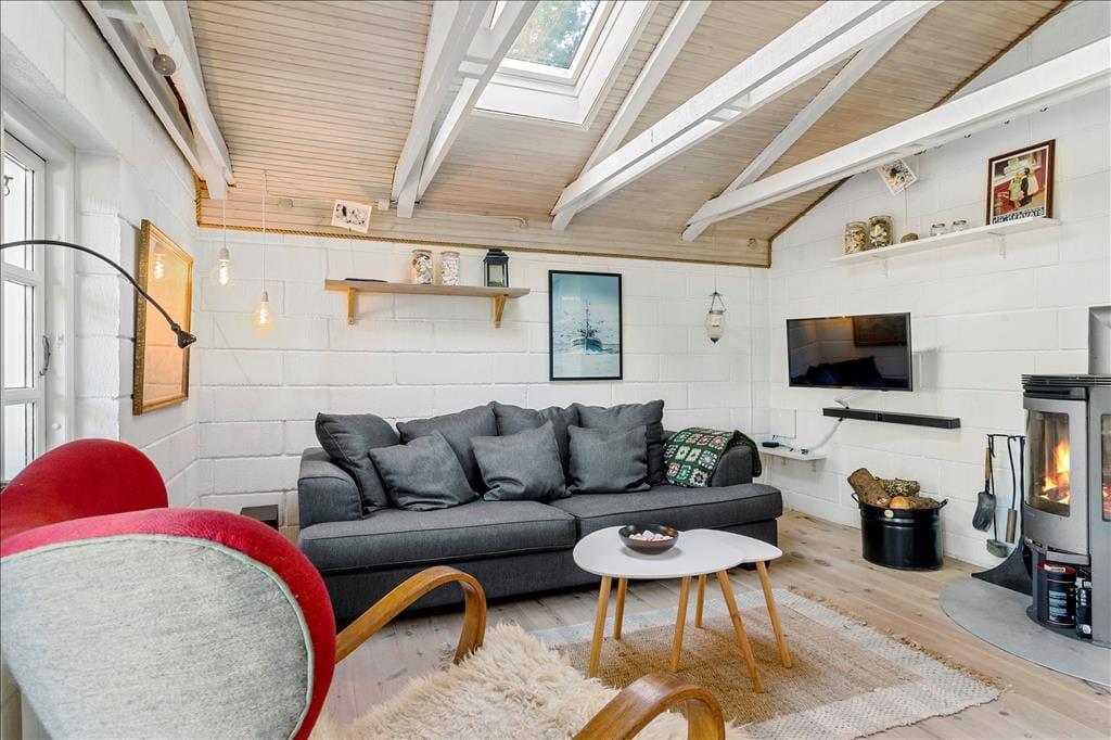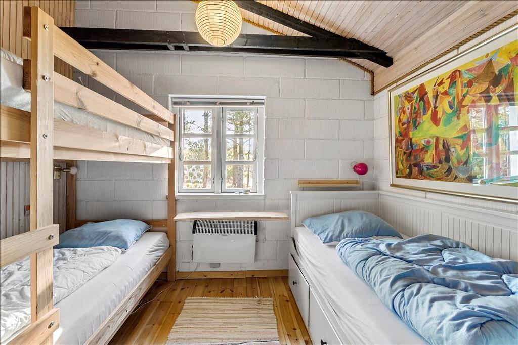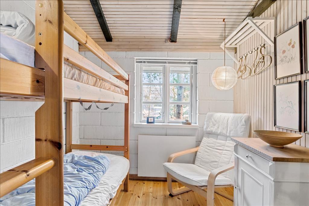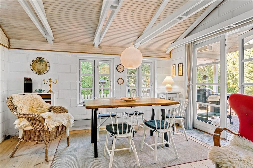 Dette robuste og regulære sommerhus emmer af hygge og charme. Med højt til loftet og synlige bjælker, komfortable møbler og et godt lysindfald fra de mange vinduer hersker der en rolig og afslappende stemning. Fra køkkenet er der direkte adgang til den kombinerede spisestue og stue, hvor man på de kølige dage kan tænde op i brændeovnen og krybe sammen i sofaen med en god bog. Om sommeren kan man åbne dørene til terrassen fra både køkkenet og stuen og lade den friske, nordjyske luft strømme ind. Derudover råder sommerhuset over et badeværelse med bruser og tre soveværelser, hvoraf de to værelser er udstyret med køjesenge, så børnene straks vil føle sig hjemme. Dette sommerhus er en velfungerende base for enhver ferie, med hyggelige rammer og den bedste beliggenhed.