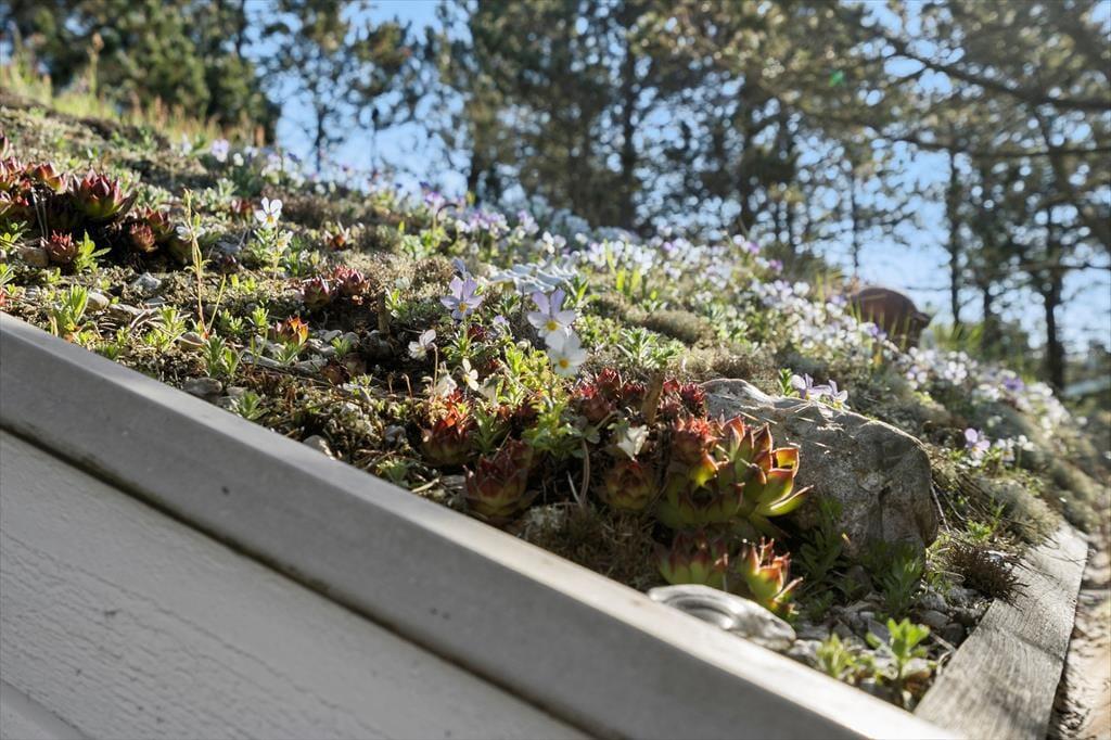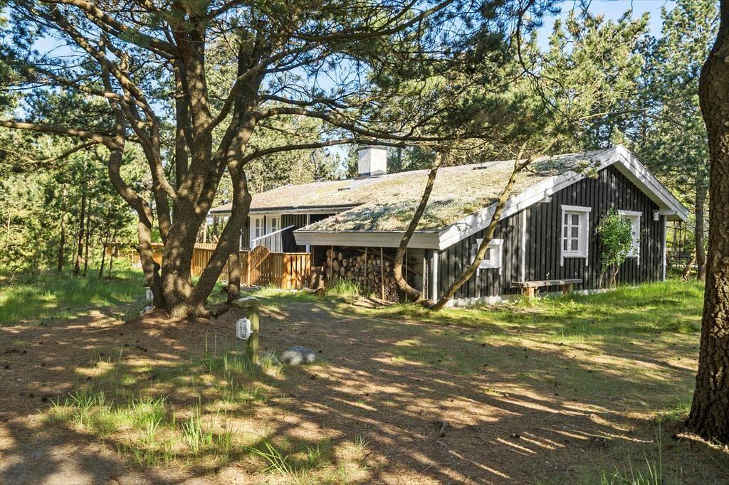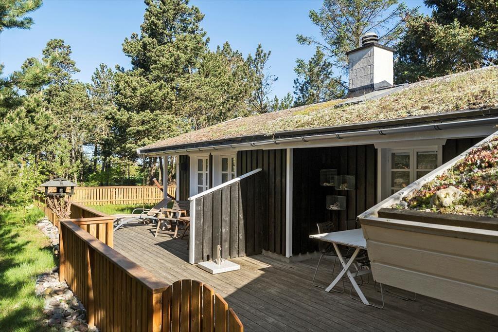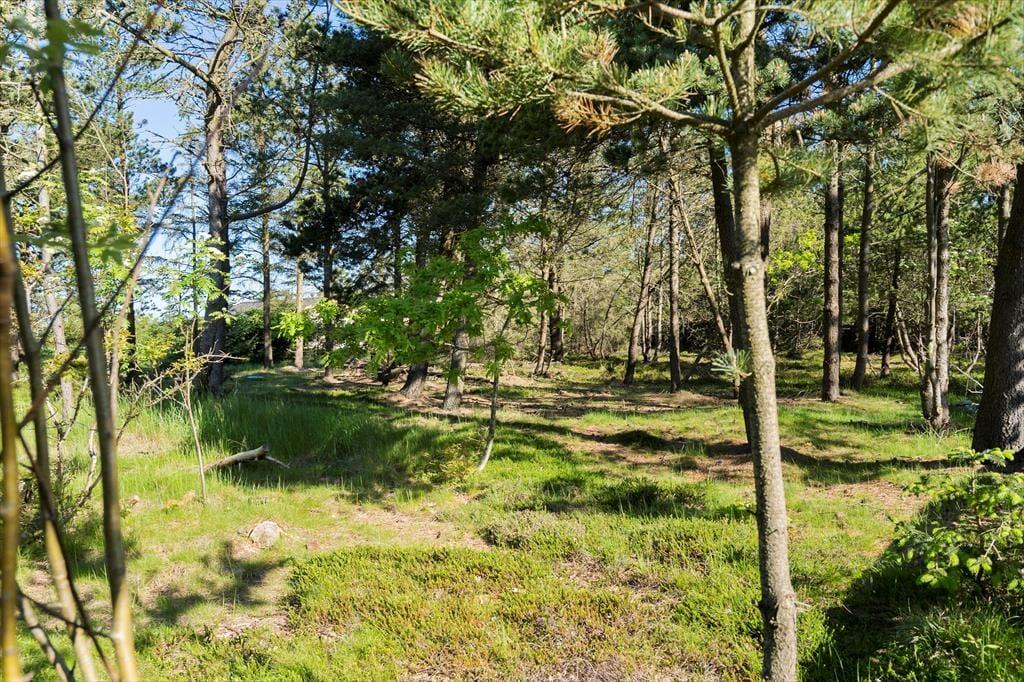 Sommerhuset ligger på en let kuperet naturgrund med lyng, marehalm og fyrretræer. På den store terrasse kan man nyde sommeren med solbadning, lækre grillmåltider og lange, lyse aftener. Har man hund med på ferien, vil man sætte pris på den integrerede løbegård.