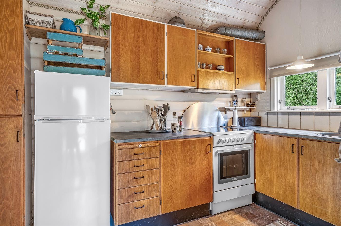 Køkkenet er udstyret med 1 køleskab. Der er 4 keramiske kogeplader, varmluftovn, mikrobølgeovn samt opvaskemaskine.