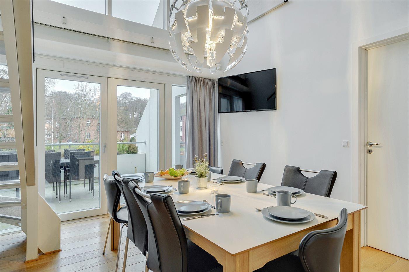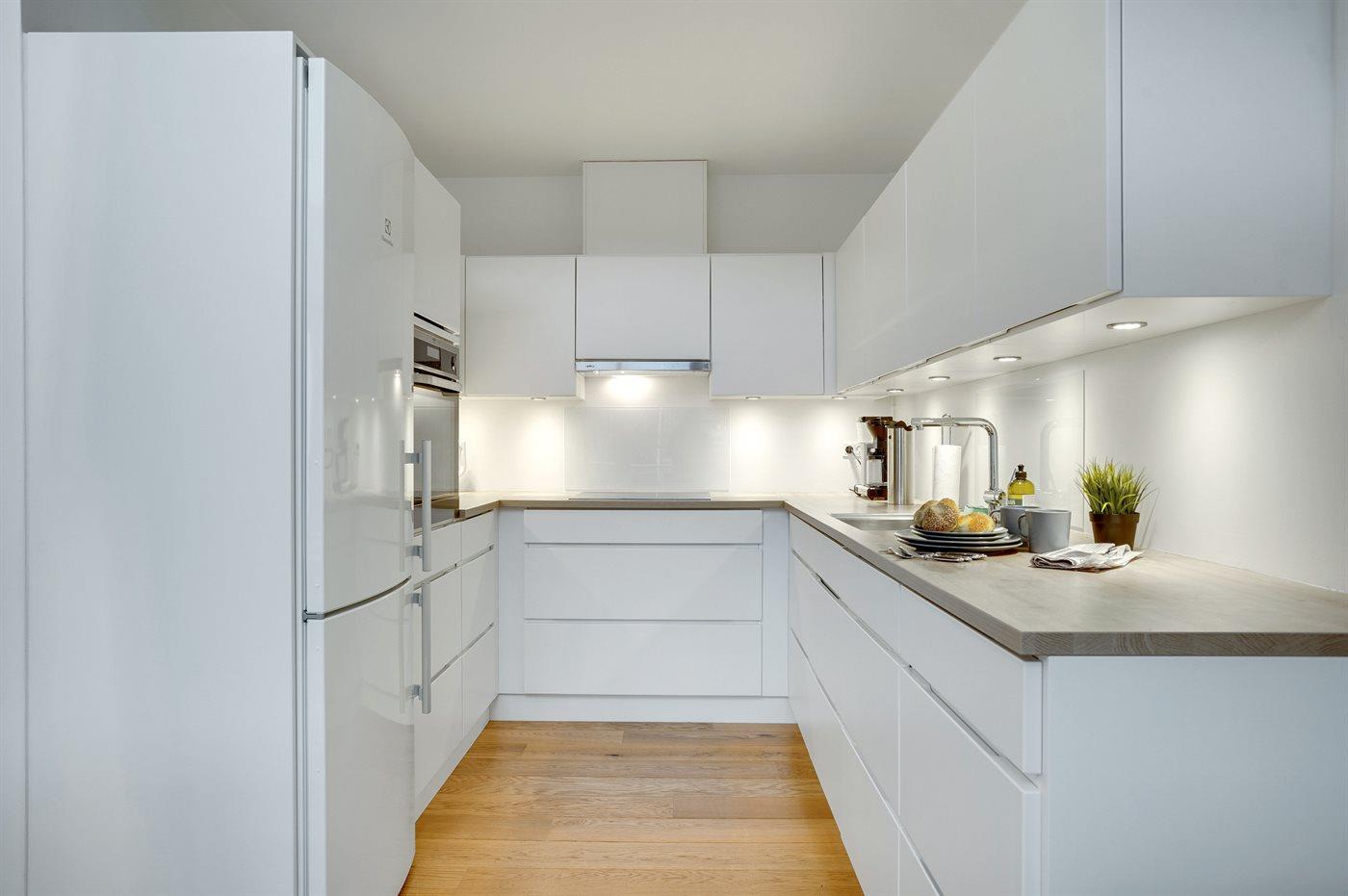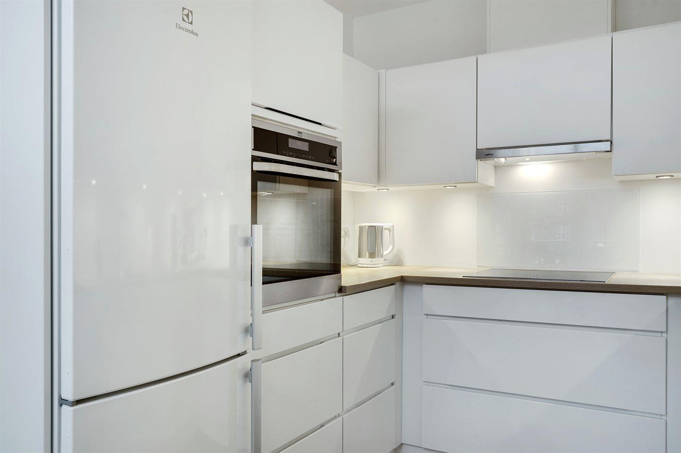 Køkkenet er udstyret med 1 køleskab. Der er 4 induktionskogeplader, varmluftovn samt opvaskemaskine.