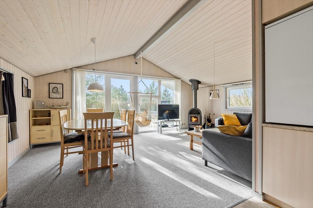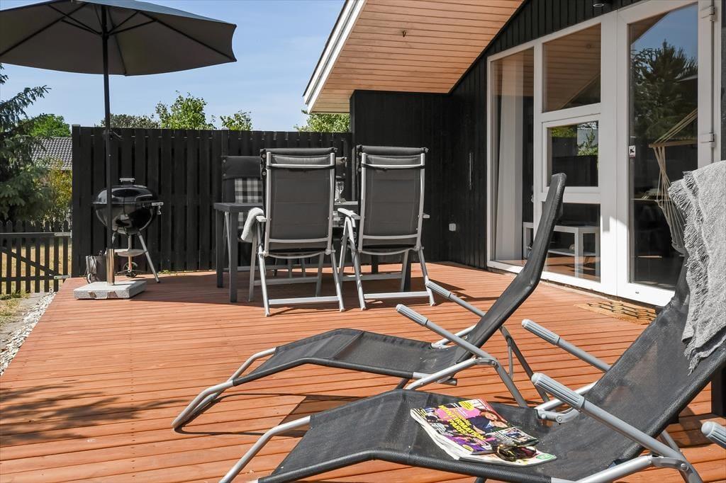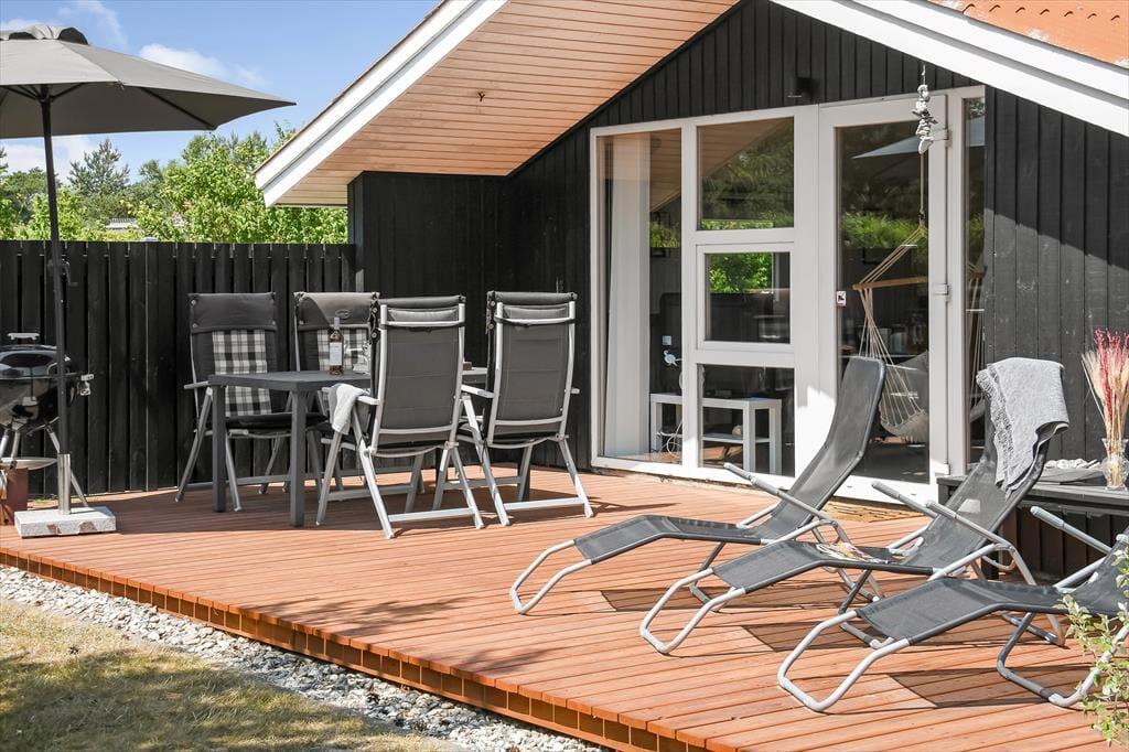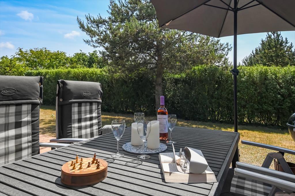 Vil I hellere nyde livet ude i det fri, kan I gå fra stuen og direkte ud på den delvist overdækkede terrasse. Den er sydvendt og dermed dejligt solrig en stor del af dagen, og havemøbler, liggestole og parasol sørger for, at I får den helt rette ramme om ferietilværelsen. Hvis I tager jeres hund med på ferie, kan den frit udfolde sig i den delvist indhegnede have.