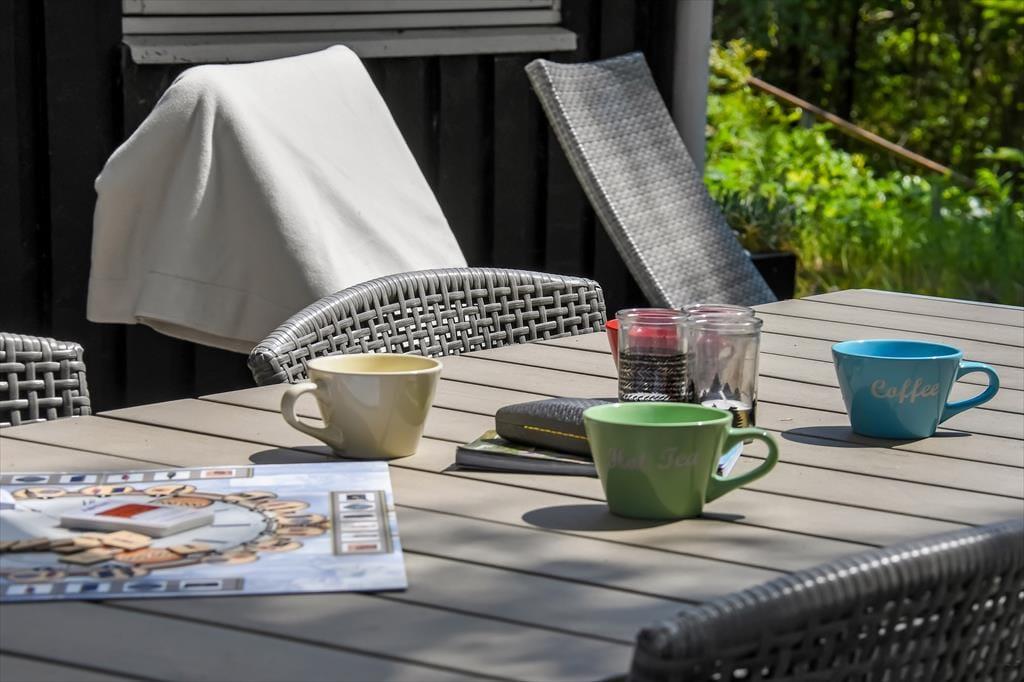 På den ugenerede naturgrund omkranses huset af både løv- og nåletræer, så der er noget kønt at kigge på hele året rundt. Når vejret er lunt og solrigt, kan I slå jer ned på terrasserne, der breder sig om flere af husets sider. Kommer I hjem med friskfangede fisk fra fjorden, kan I tilberede dem på grillen til aftenens udendørs festmåltid.