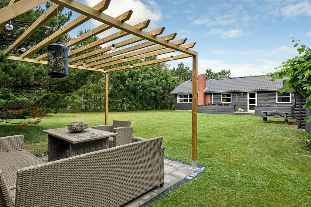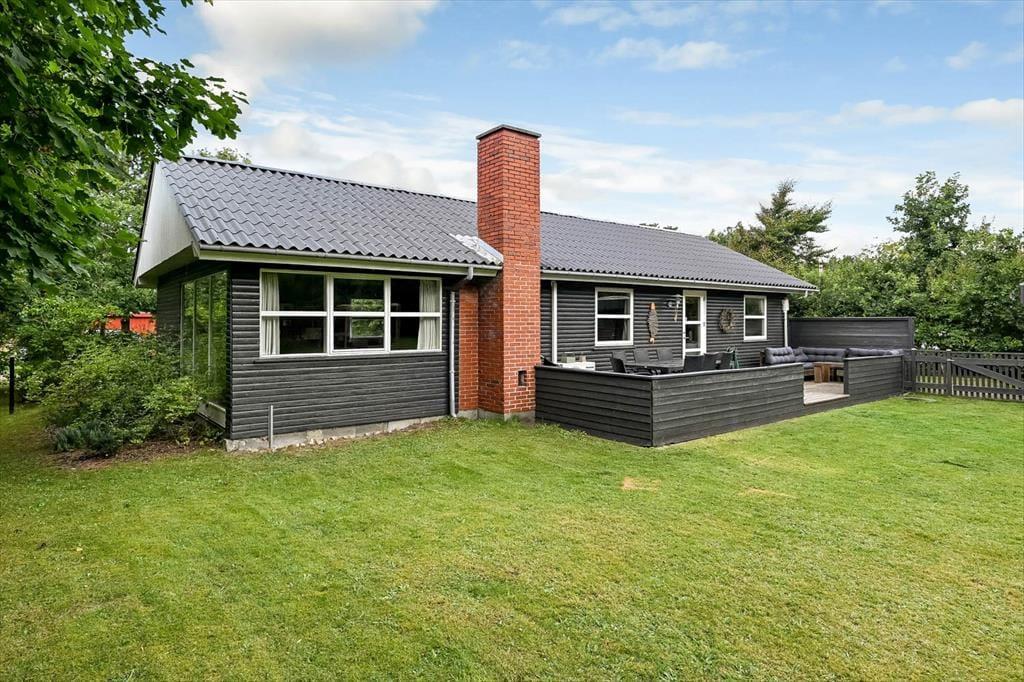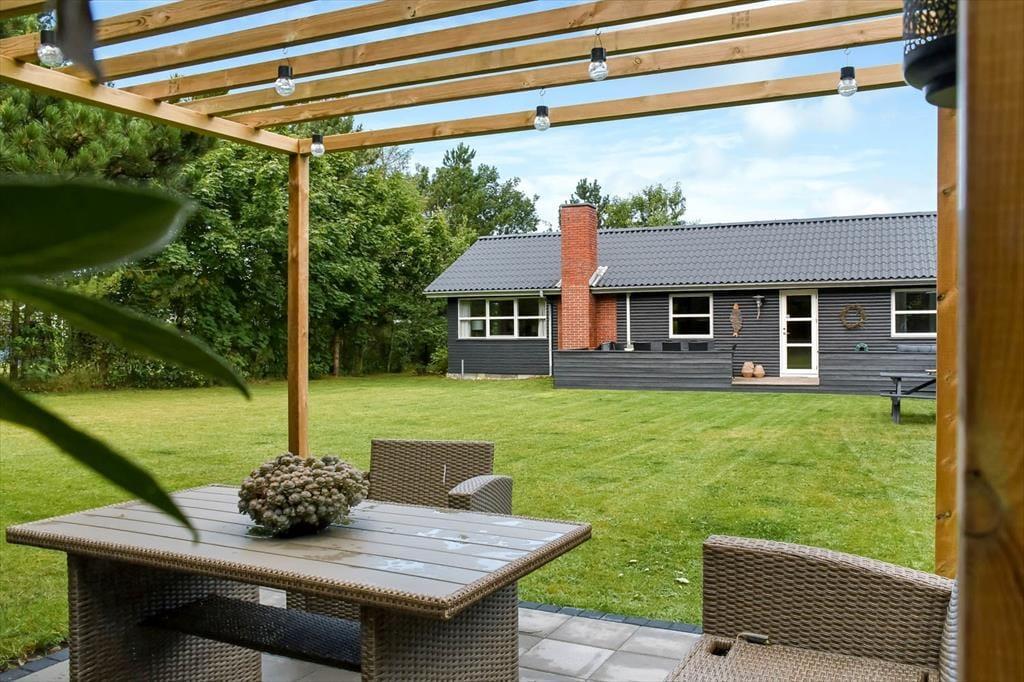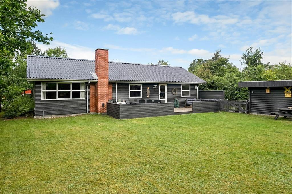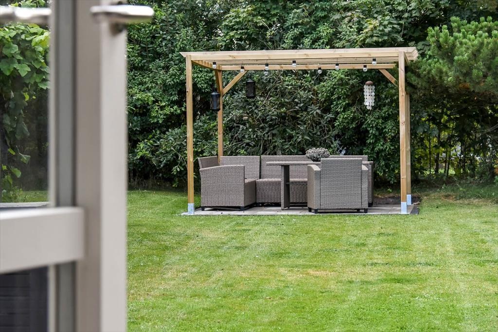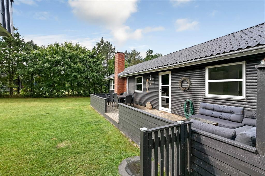 Sydøst for sommerhuset ligger en dejlig terrasse, der er udstyret med havemøbler, liggestole og grill. Det er herligt at sidde her og nyde solen og feriefreden på den ugenerede og indhegnede grund, der desuden byder på en stor græsplæne til leg og havespil.
