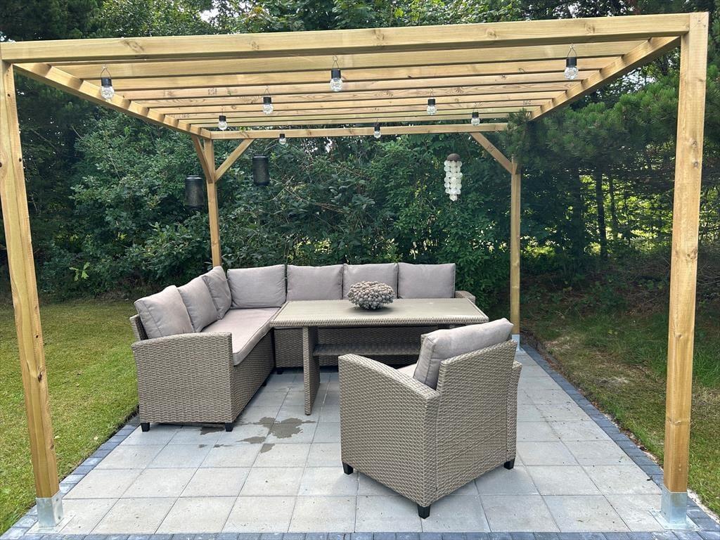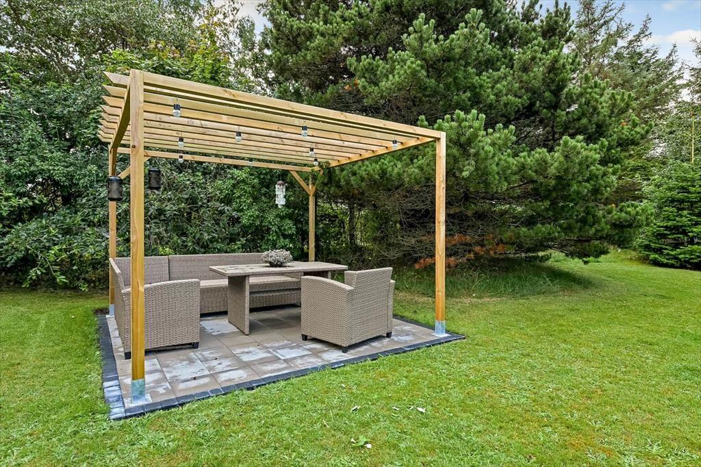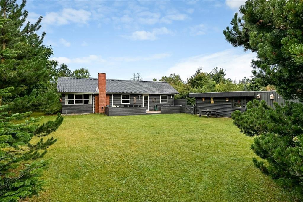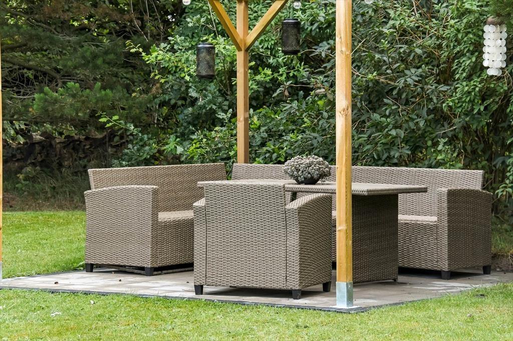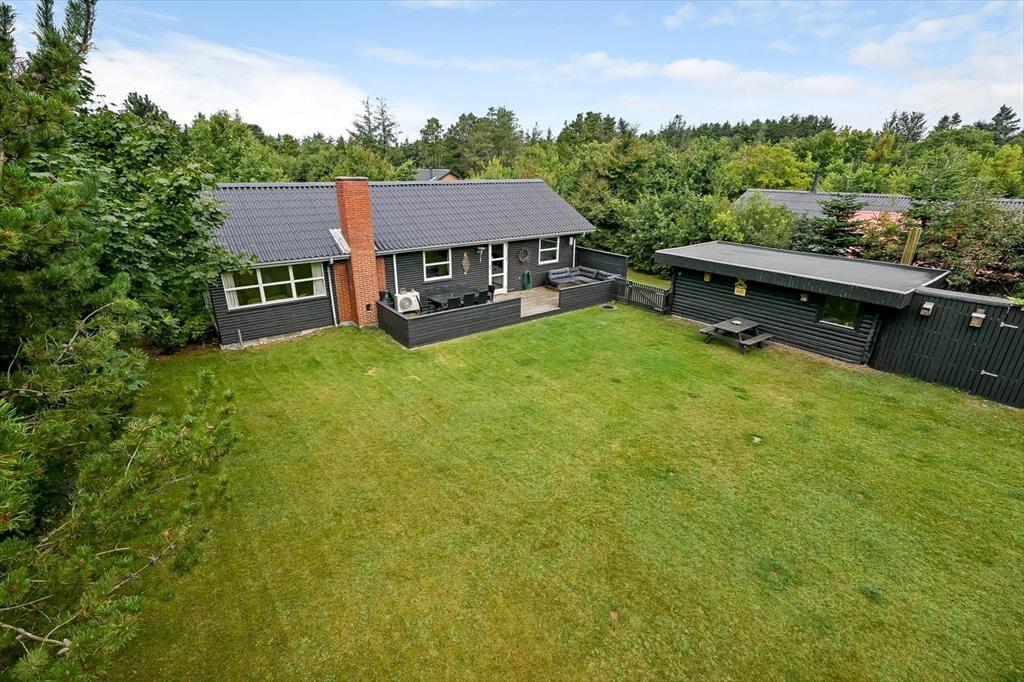 Sydøst for sommerhuset ligger en dejlig terrasse, der er udstyret med havemøbler, liggestole og grill. Det er herligt at sidde her og nyde solen og feriefreden på den ugenerede og indhegnede grund, der desuden byder på en stor græsplæne til leg og havespil.