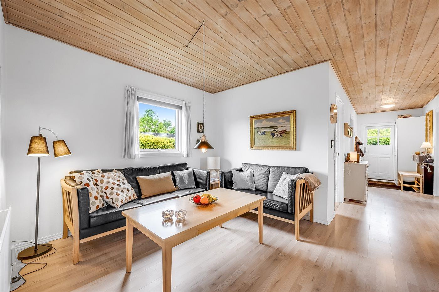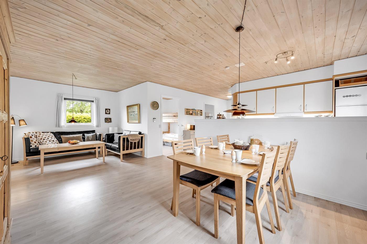 Sommerhusets hjerte er det store køkken-alrum, og herfra er der direkte adgang til den hyggelige udestue, hvor du kan tilbringe mange timer både sommer og vinter. Fra udestuen kan du åbne op til den ugenerede og lukkede træterrasse, hvorfra der er adgang til den indhegnede grund, hvor der er masser af muligheder for aktiviteter og samvær. Den indhegnede grund er også ideel hvis du medbringer en hund eller små børn på ferien.