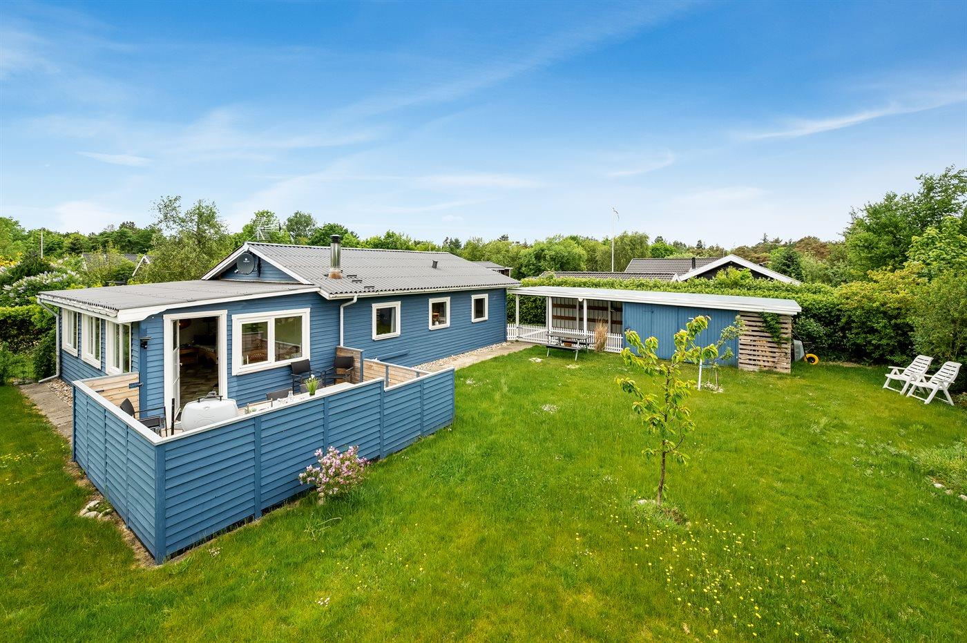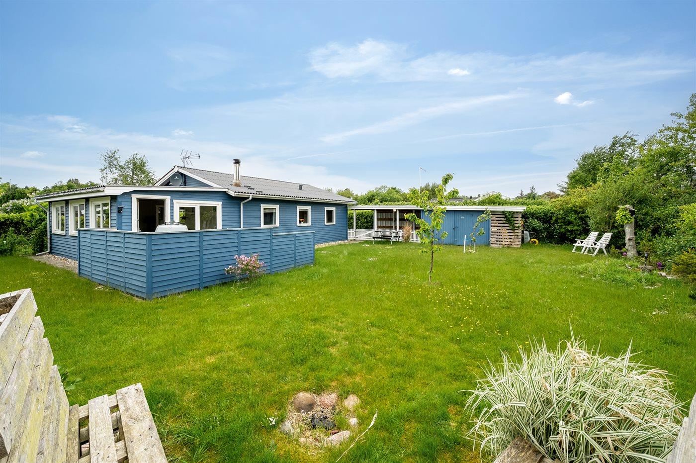 Ferieboligen er beliggende på en 900 m² stor naturgrund. Der er 11800 m til havet. Der er 650 m til fjorden. Nærmeste forretning er beliggende i en afstand af 4000 m. Til ferieboligen hører 15 m² terrasseareal. Desuden er der 30 m² overdækket terrasse. Ligeledes er der adgang til udestue. Der er redskabsrum. Bålsted. Der er carport til rådighed. Parkering ved ferieboligen.