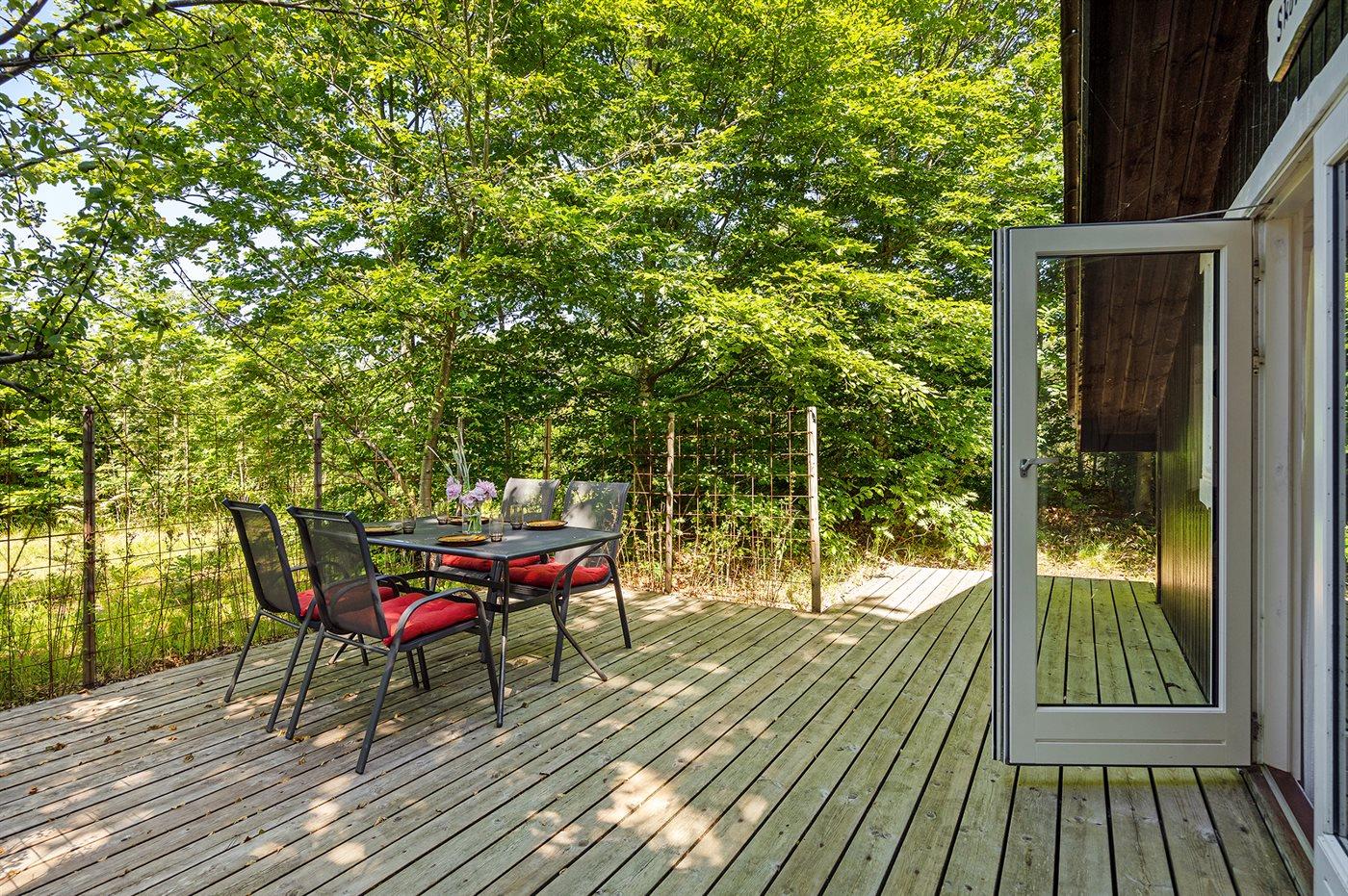 Ferieboligen er beliggende på en 1539 m² stor naturgrund. Der er 450 m til fjorden. Nærmeste forretning er beliggende i en afstand af 4500 m. Til ferieboligen hører 20 m² terrasseareal. Desuden er der 7 m² overdækket terrasse. Der ligger en legeplads i en afstand af 100 m. Der er garage til rådighed. Parkering ved ferieboligen.