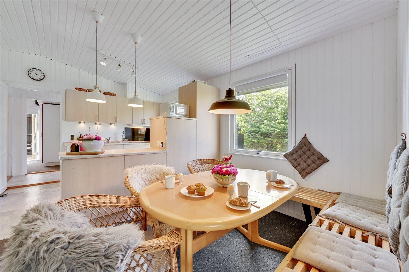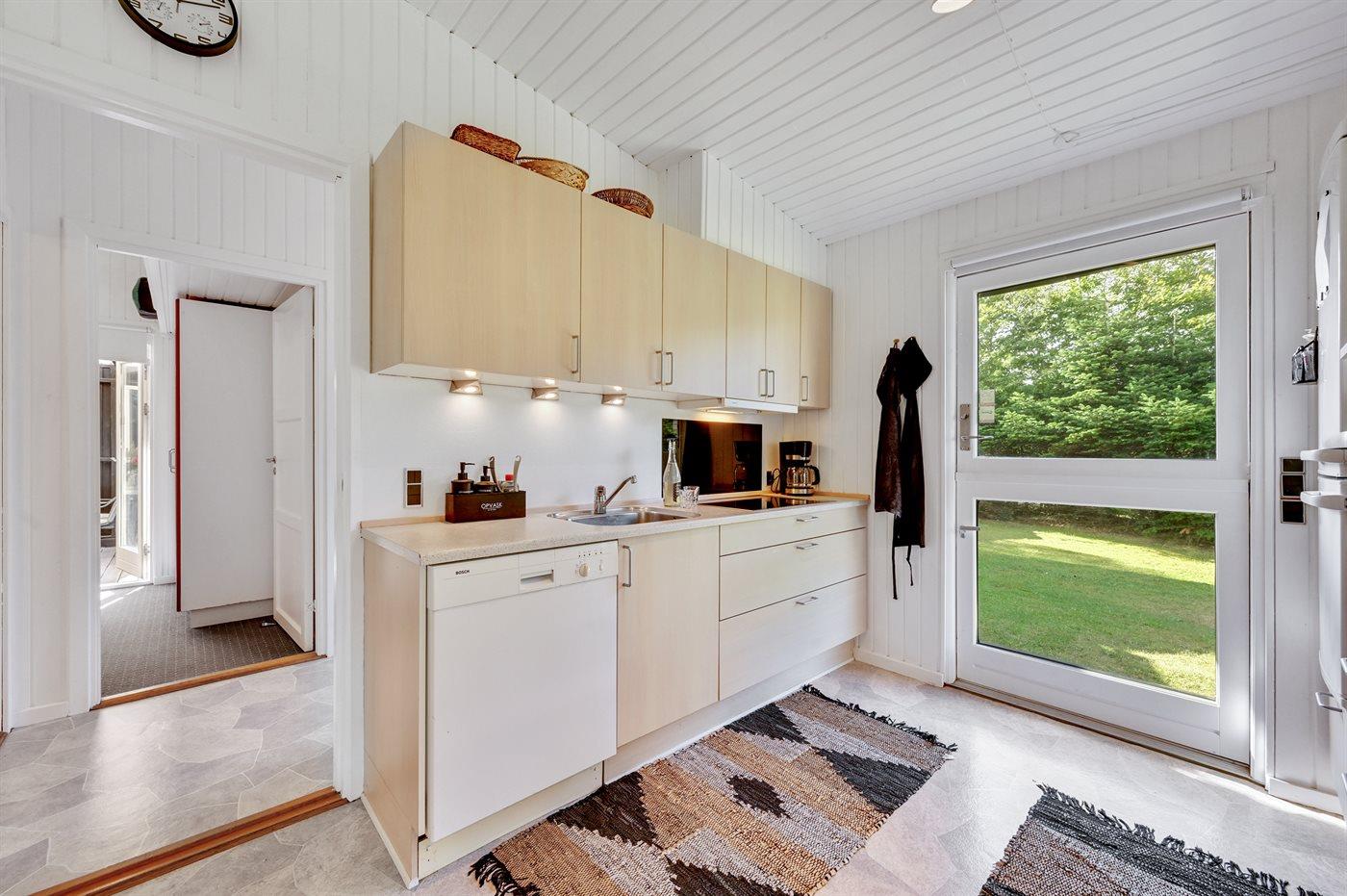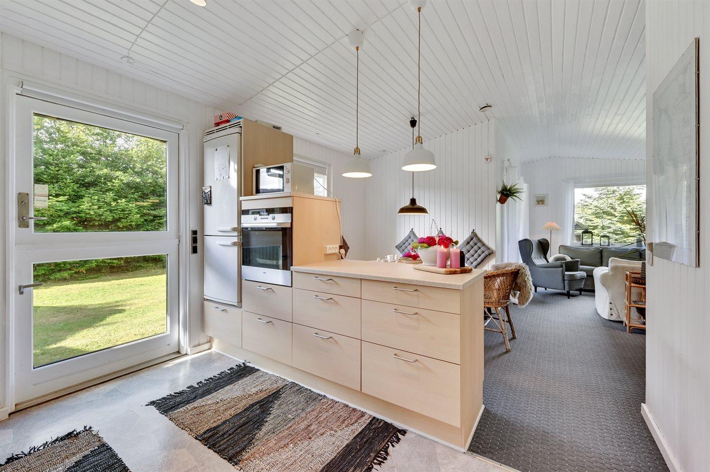 Køkkenet er udstyret med 1 køleskab. Der er 4 keramiske kogeplader, varmluftovn, mikrobølgeovn samt opvaskemaskine.