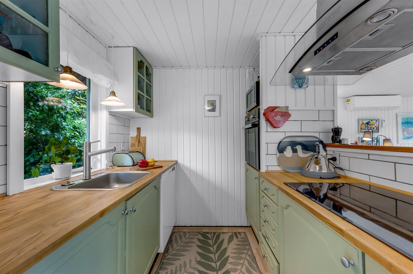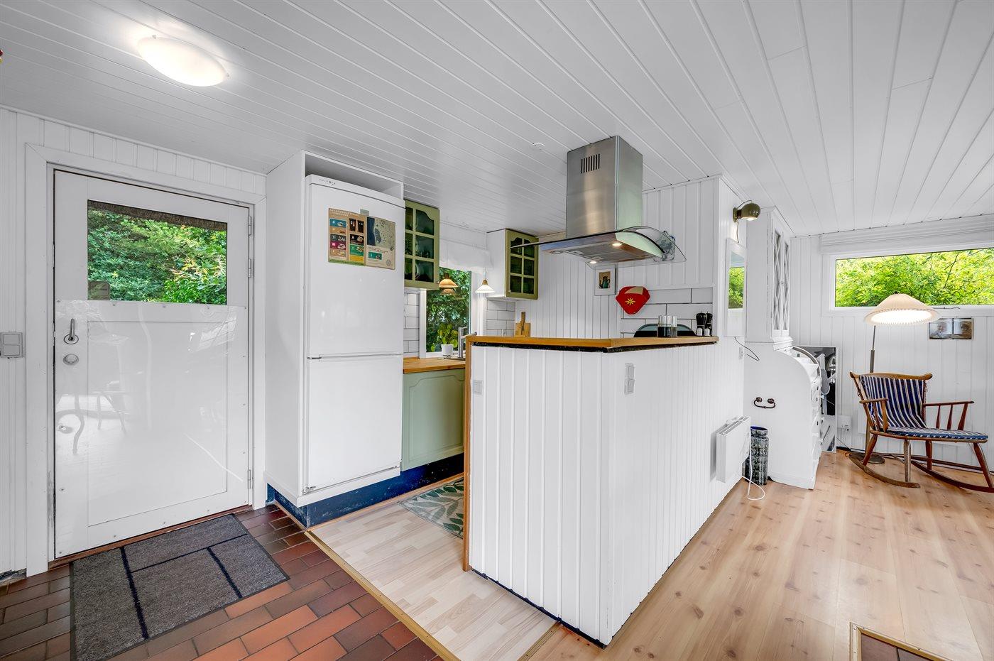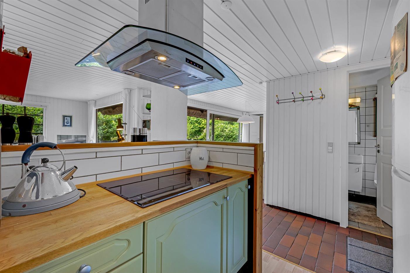 Køkkenet er udstyret med 1 køleskab. Der er 4 induktionskogeplader, varmluftovn, mikrobølgeovn samt opvaskemaskine.