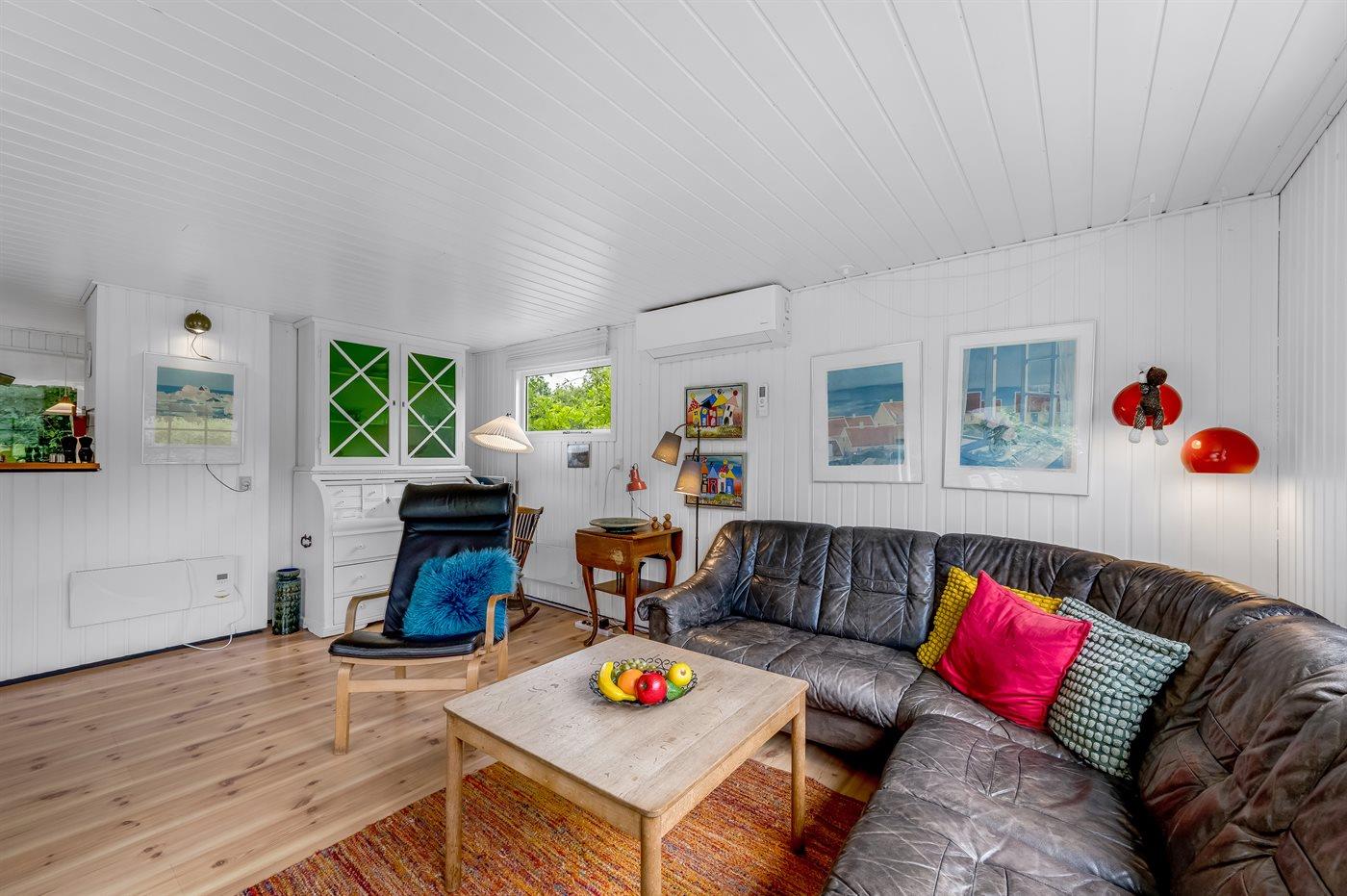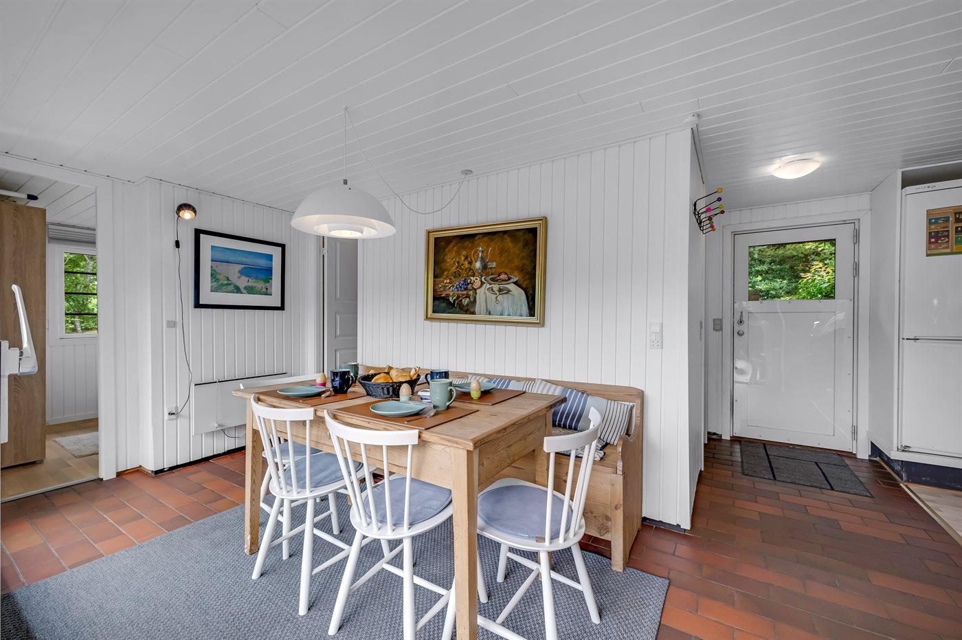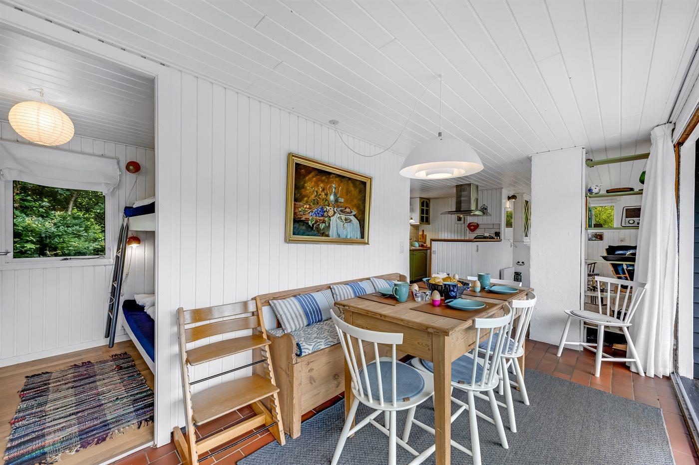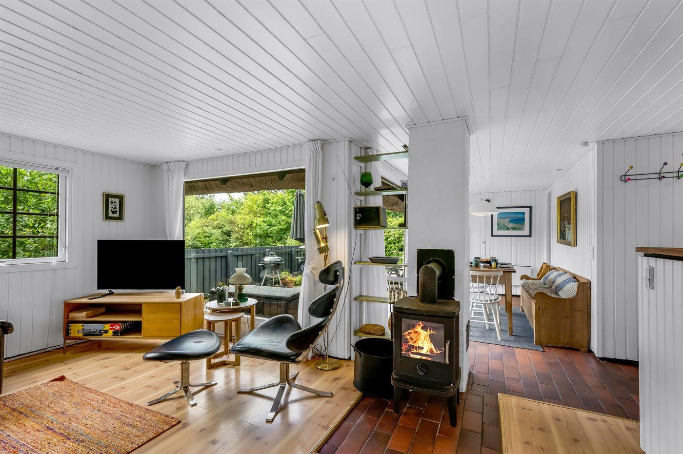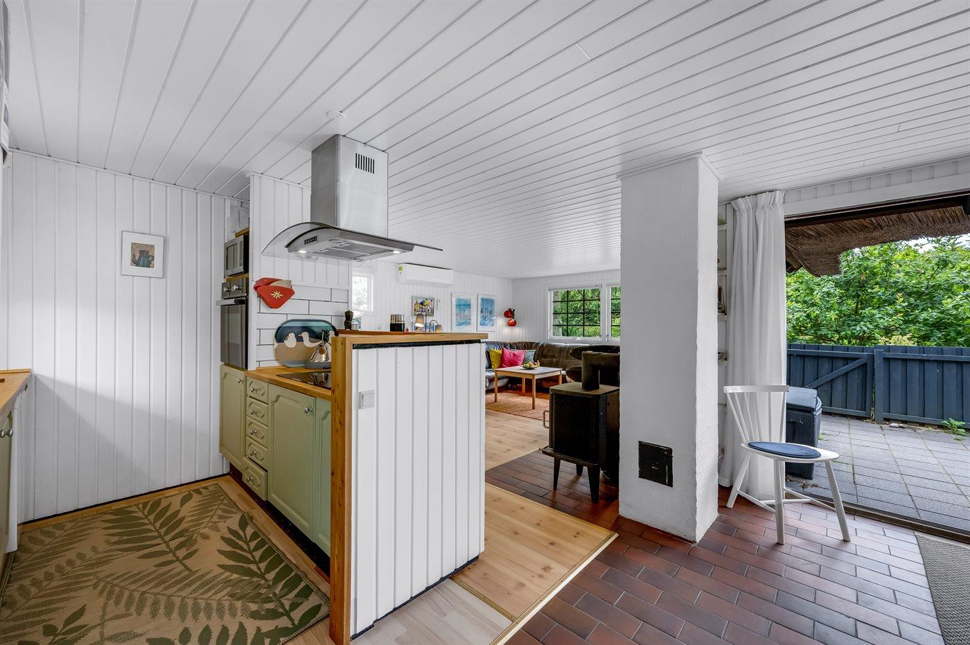 Indenfor er sommerhuset løbende renoveret, og i det hyggelige køkken kan I hjælpe hinanden med at tilberede lækker mad, eller I kan slappe af i sofaen med en god bog og lytte til brændeovnens knitren i baggrunden. To af sommerhusets sengepladser findes i det hyggelige, stråtækte anneks.