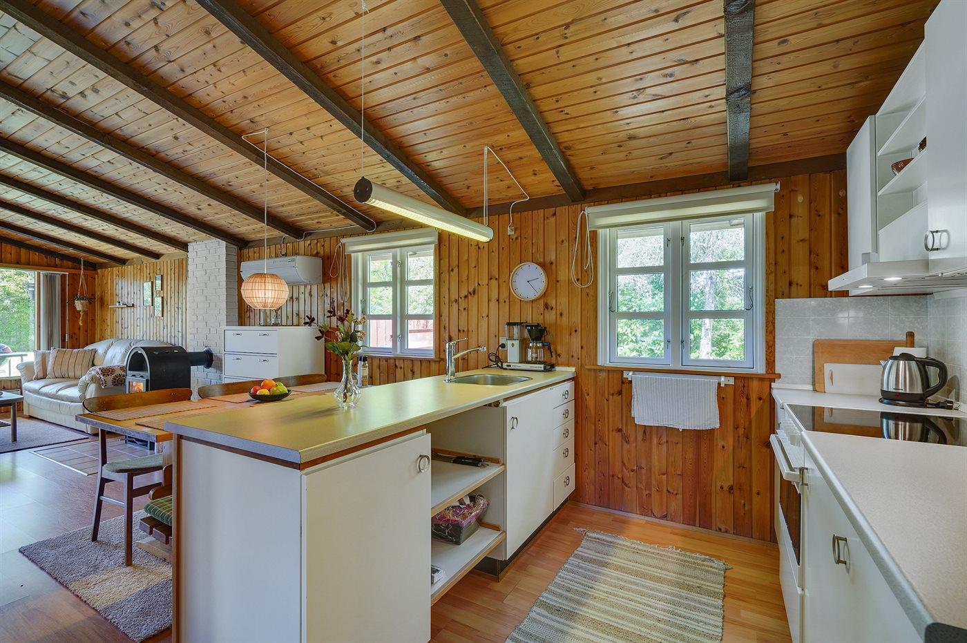Hyggeligt sommerhus med udestue, sauna og brændeovn nær fjord og skov i rolige omgivelser.