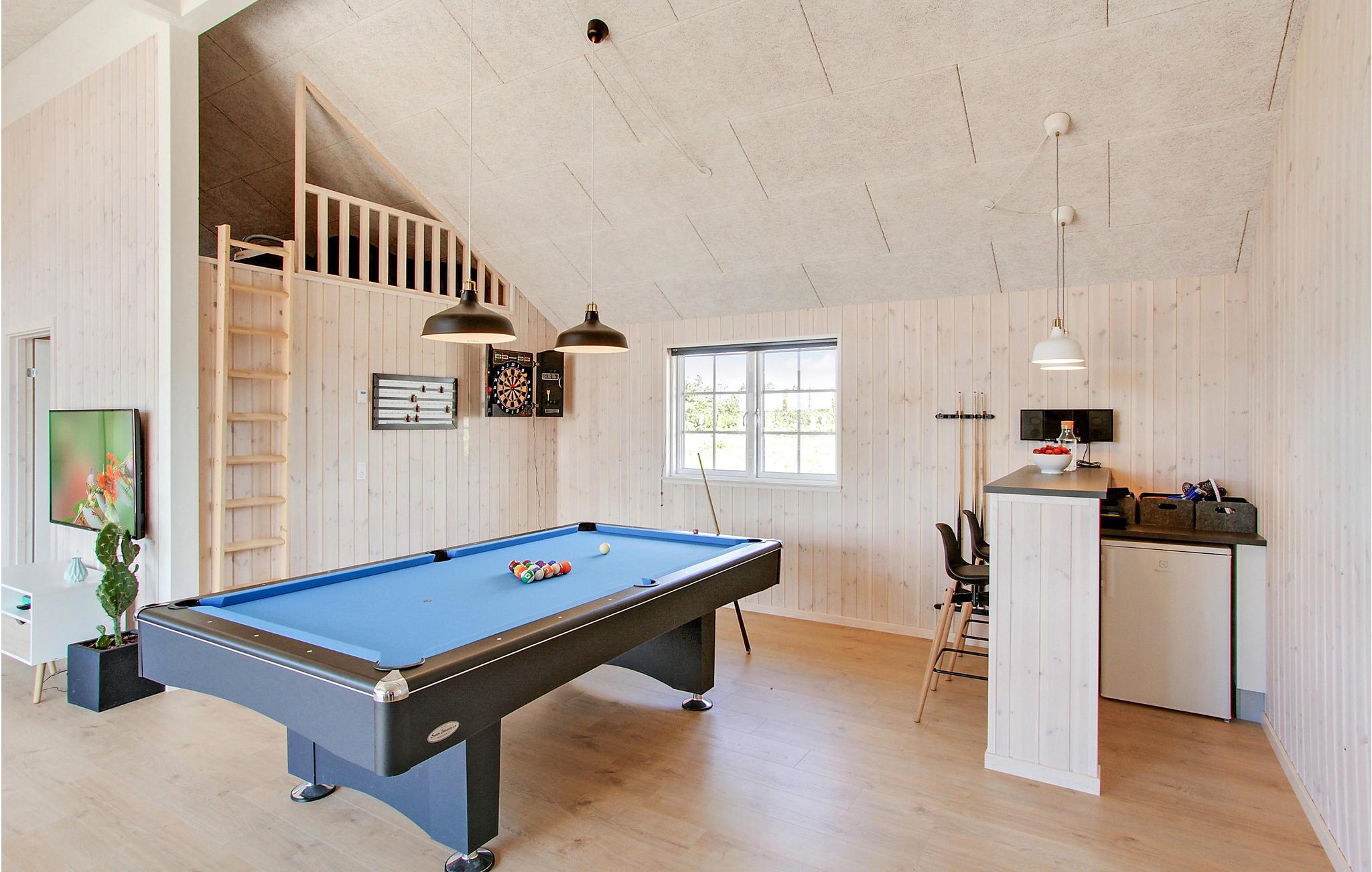 I feriebyen Henne Strand, ligger dette pragtfulde swimmingpoolhus på en kuperet naturgrund. Huset er med sine mange aktivitetsmuligheder den perfekte ramme for en succesfuld ferie året rundt. Feriehuset byder på al tænkelig komfort og luksus, og er bygget op omkring to soveafdelinger med hvert sit badeværelse, som gør det meget velegnet til flere familier, der ønsker at holde ferie sammen. Børnene vil ofte foretrække at sove på den store hems, hvor der er indrettet fire sovepladser. Huset er udstyret med lydisolerede lofter, hvilket gør det meget behageligt at opholde sig i. I husets poolafdeling er der swimmingpool med vandrutsjebane og modstrømsanlæg til svømmetræning. Endvidere er der et seks personers spabad samt sauna og et badeværelse. I det store aktivitetsrum kan I spille både billard/bordtennis, dart, bordfodbold og Playstation4. I baren er der rig mulighed for at mikse spændende drinks, eller servere kolde øl og sodavand fra barens køleskab. Køkkenet er særdeles velindrettet og udstyret med en ekstra stor kogeplade, to opvaskemaskiner samt to køle-/fryseskabe, så der uden problemer kan være mange kokke og køkkenskrivere om den fælles madlavning. Terrassen er sydvendt og helt privat. På den delvis overdækkkede terrasse står en grill til tilberedning af lækre feriemåltider.