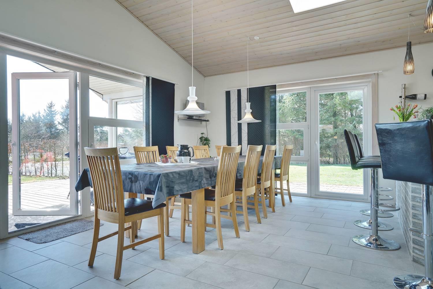 I får rig mulighed for at nyde hinandens selskab i husets lyse opholdsrum med integreret køkken, brændeovn og ovenlysvinduer, og når I trænger til en privat stund, kan I trække jer tilbage til de fire soveværelser, som alle er rummelige og udstyret med komfortable dobbeltsenge. Der er desuden sauna og to badeværelser i huset det ene med spa. Sommerhuset har varmepumpe, hvilket giver et meget lavt energiforbrug under opholdet. Der er gulvvarme i hele huset undtagen i soveværelserne.