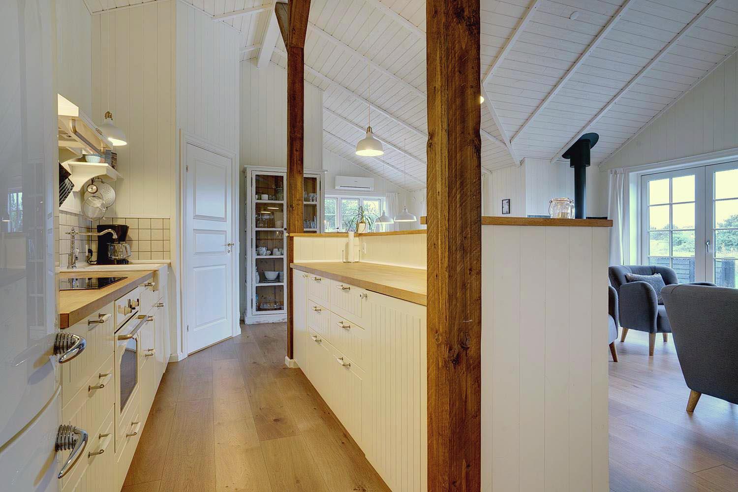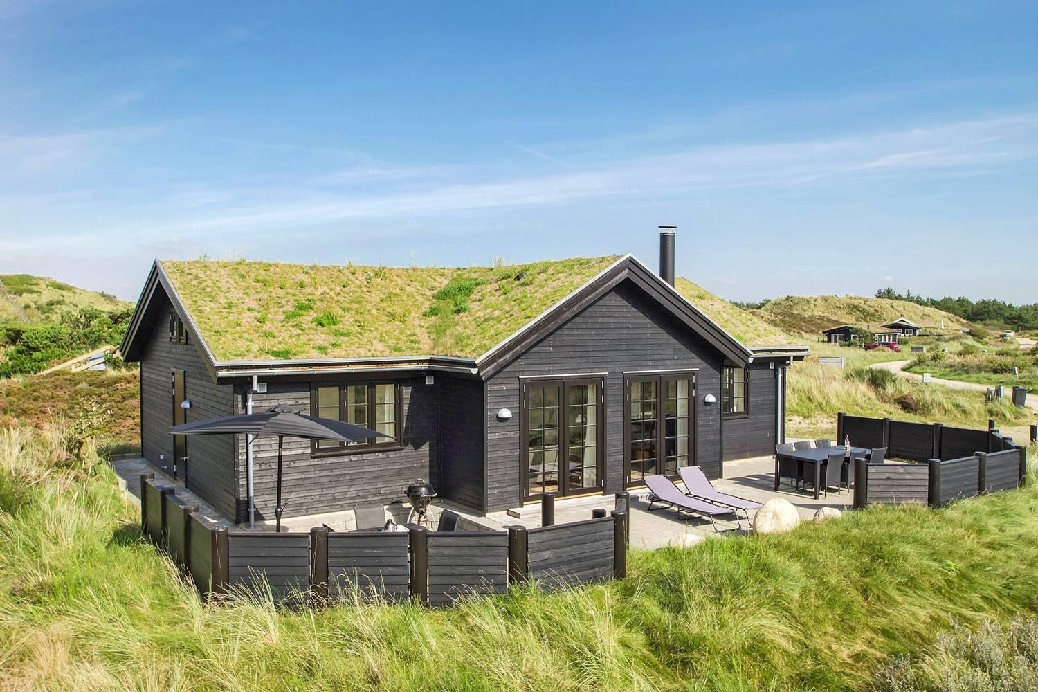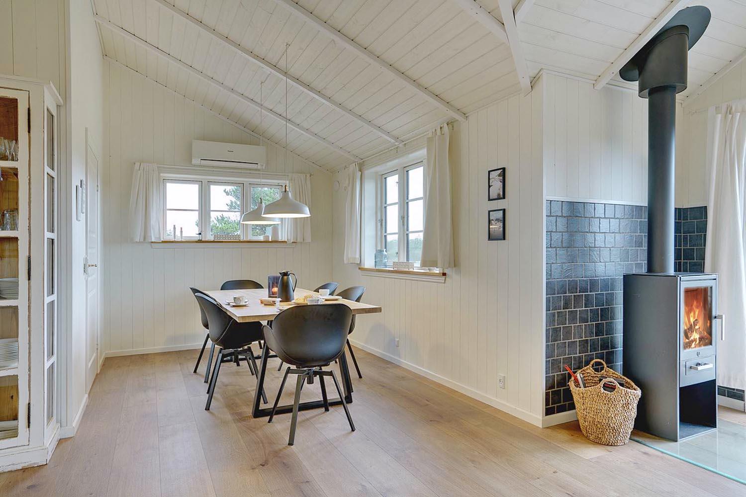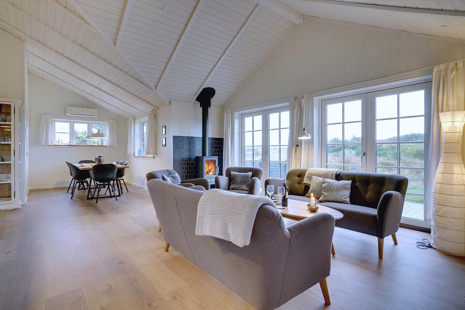 Bjælkehus med græstag, beliggende på åben naturgrund i rolige natur omgivelser. Gode terrasseforhold, delvis indhegnet og flere terrasser med havemøbler. Flisebelagt gangsti omkring hele huset. Indendørs er der højt til loftet og synlige bjælker. Huset er lyst, hvidt og venligt indrettet og gammel stil, kombineret med nutidens trend. Godt indgangsparti med vaskemaskine og tørretumbler. I denne afdeling er der ligeledes et værelse med enkeltsenge. Desuden findes 2 værelser med dobbeltsenge meget hyggeligt indrettet. Landkøkken med opvaskemaskine og separat fryser i åben forbindelse til spiseplads med langbord og stue med siddegruppe, tv og brændeovn. 2 dejlige badeværelser, det ene med spa og den anden med sauna, men begge med gulvvarme. Stor hems med madras, hvor børnene kan hygge sig. Energi rigtig og miljøvenlig varmepumpe. Der er naturligvis WIFI, så I kan holdes opdateret i ferien. Depotrum på 2,5 m2 til opbevaring. Et charmerende hus med en gennemgående og landelig stil.