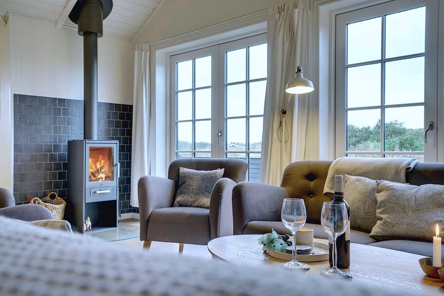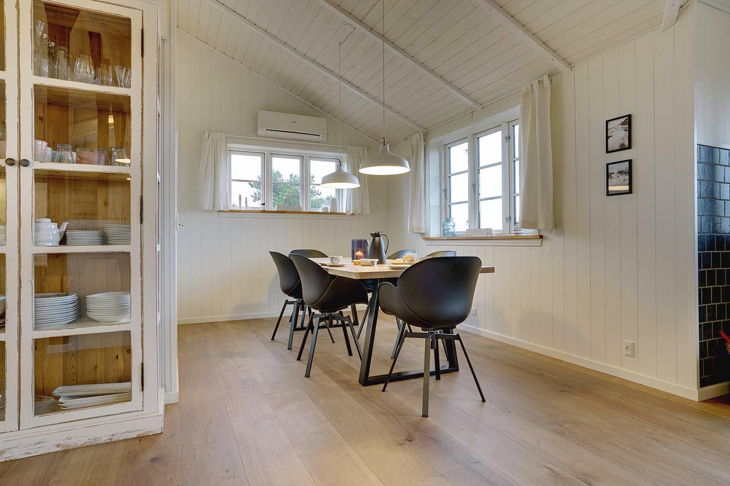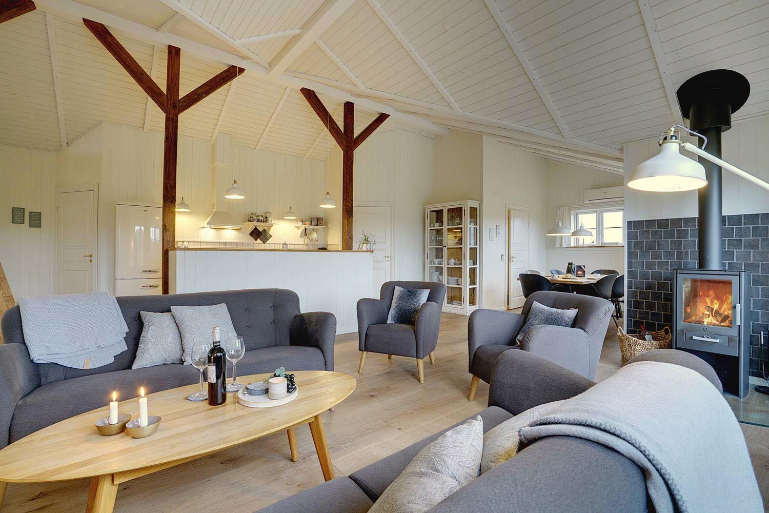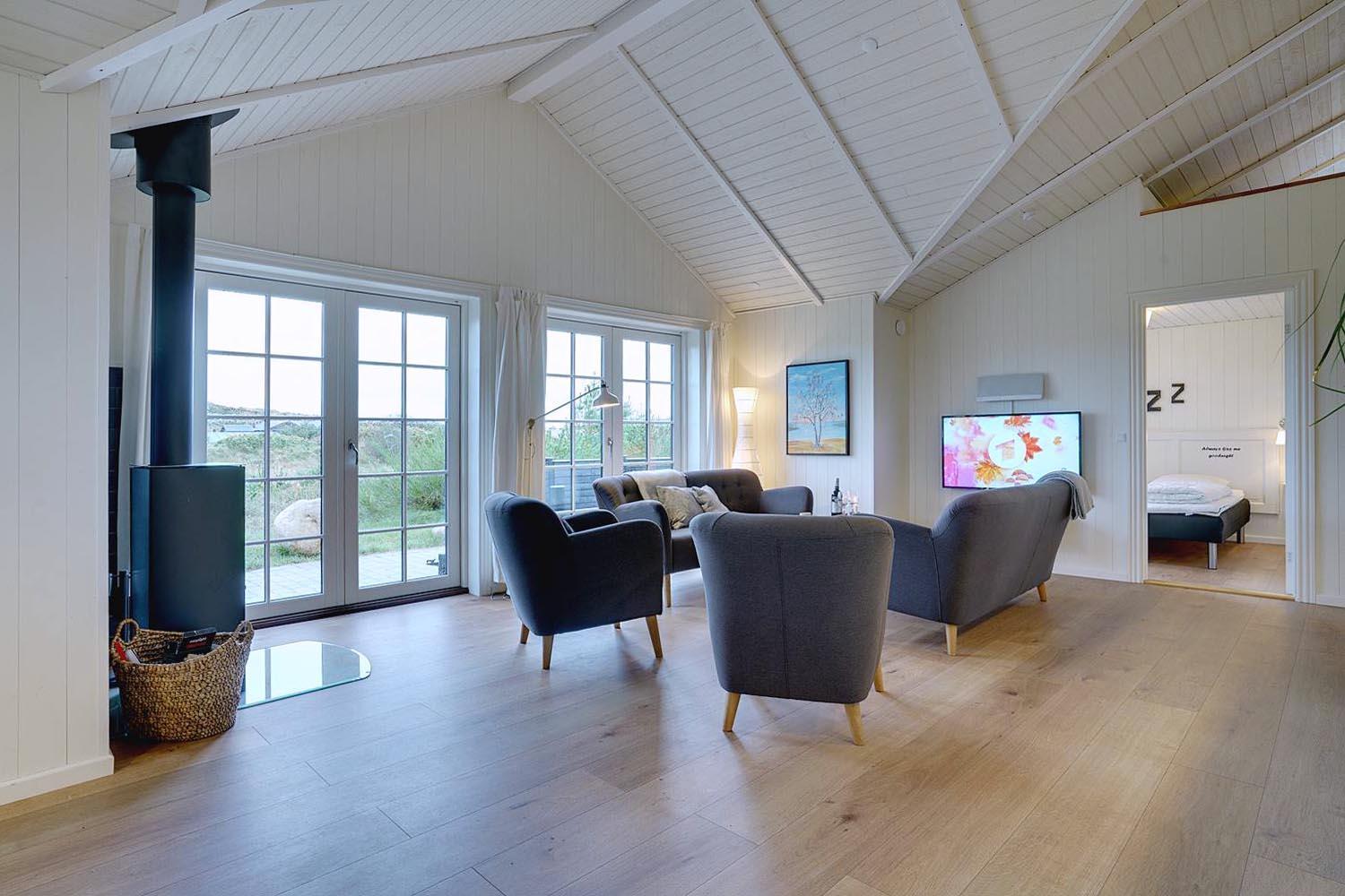Bjælkehus med græstag, beliggende på åben naturgrund i rolige natur omgivelser. Gode terrasseforhold, delvis indhegnet og flere terrasser med havemøbler. Flisebelagt gangsti omkring hele huset. Indendørs er der højt til loftet og synlige bjælker. Huset er lyst, hvidt og venligt indrettet og gammel stil, kombineret med nutidens trend. Godt indgangsparti med vaskemaskine og tørretumbler. I denne afdeling er der ligeledes et værelse med enkeltsenge. Desuden findes 2 værelser med dobbeltsenge meget hyggeligt indrettet. Landkøkken med opvaskemaskine og separat fryser i åben forbindelse til spiseplads med langbord og stue med siddegruppe, tv og brændeovn. 2 dejlige badeværelser, det ene med spa og den anden med sauna, men begge med gulvvarme. Stor hems med madras, hvor børnene kan hygge sig. Energi rigtig og miljøvenlig varmepumpe. Der er naturligvis WIFI, så I kan holdes opdateret i ferien. Depotrum på 2,5 m2 til opbevaring. Et charmerende hus med en gennemgående og landelig stil.