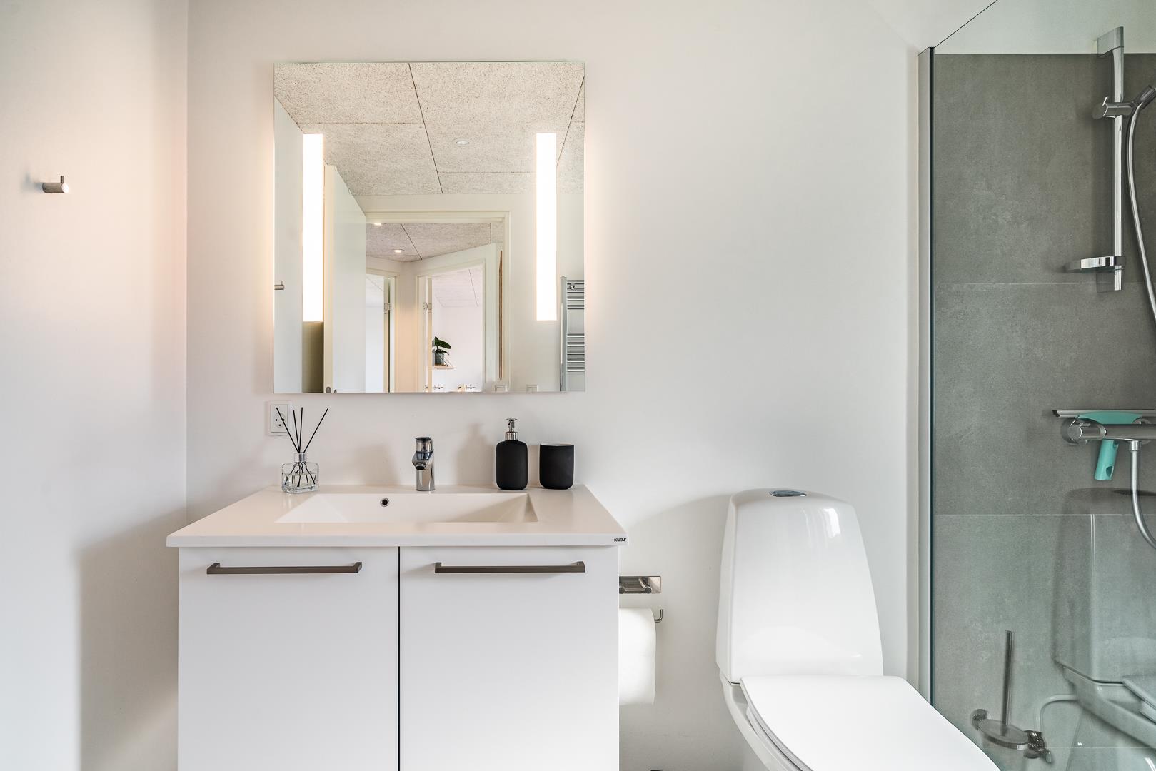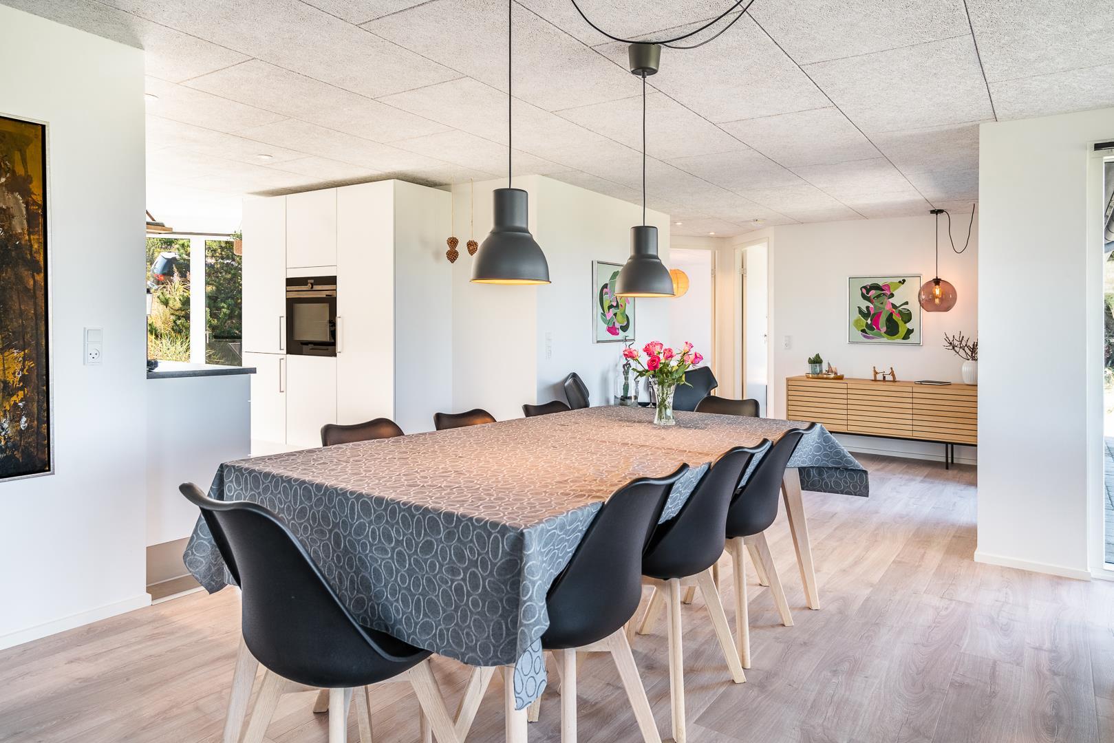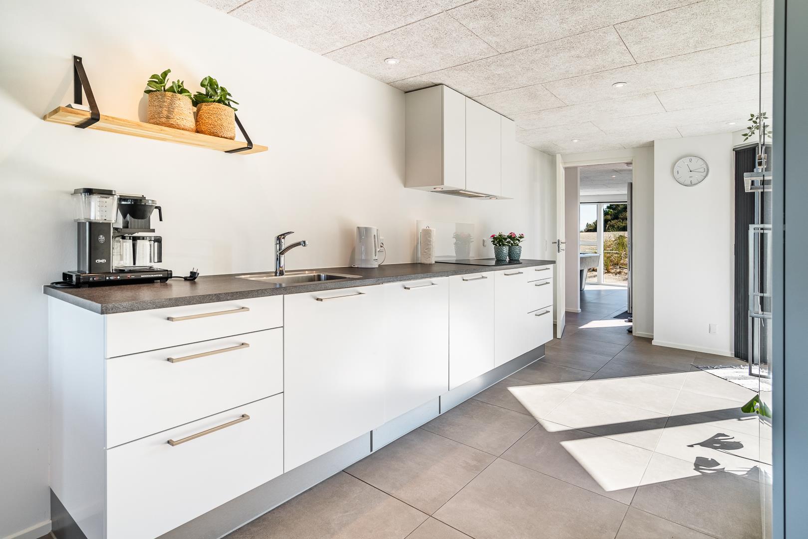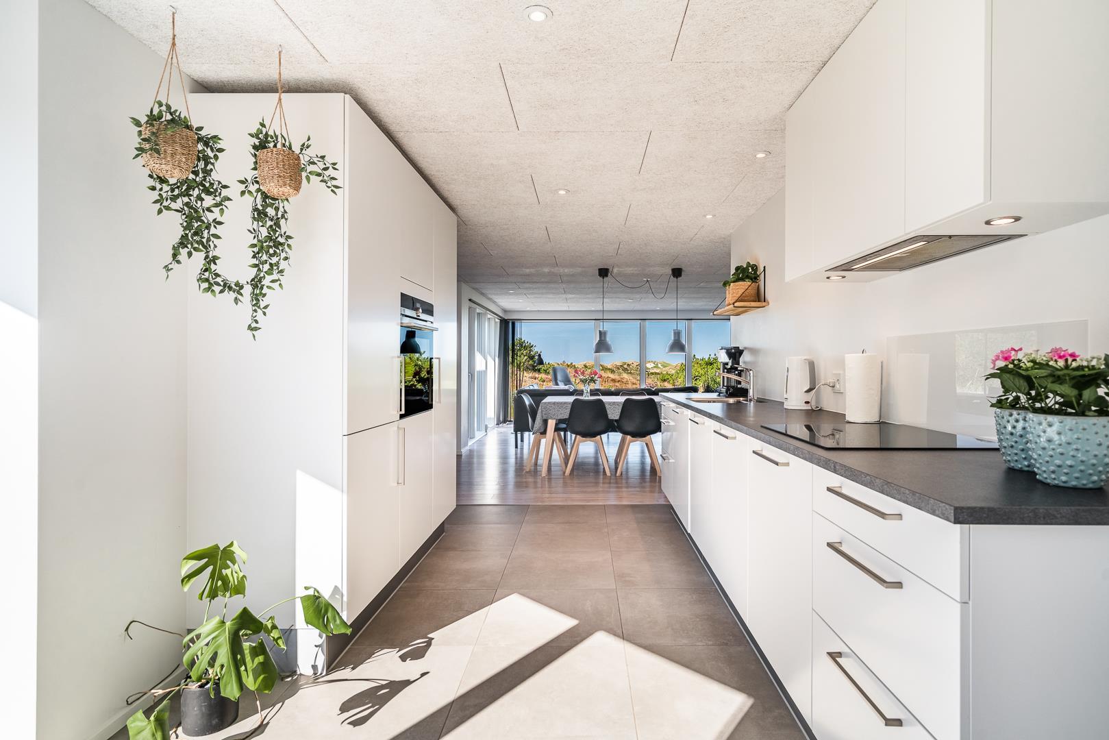 Det åbne køkken ligger i direkte forbindelse med stuen, så det er let at være sammen, selv når der laves mad. Alt i køkkenet er gennemtænkt og brugervenligt – så både morgenmaden og aftensmåltidet glider ubesværet ind i feriedagen. Her finder I alt I har brug for – herunder bl.a. opvaskemaskine.