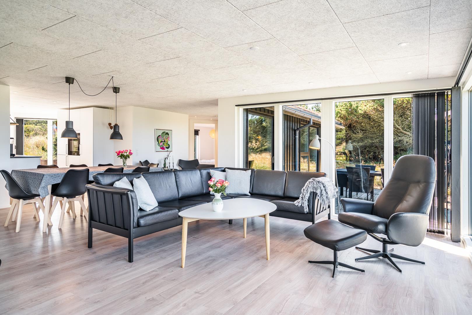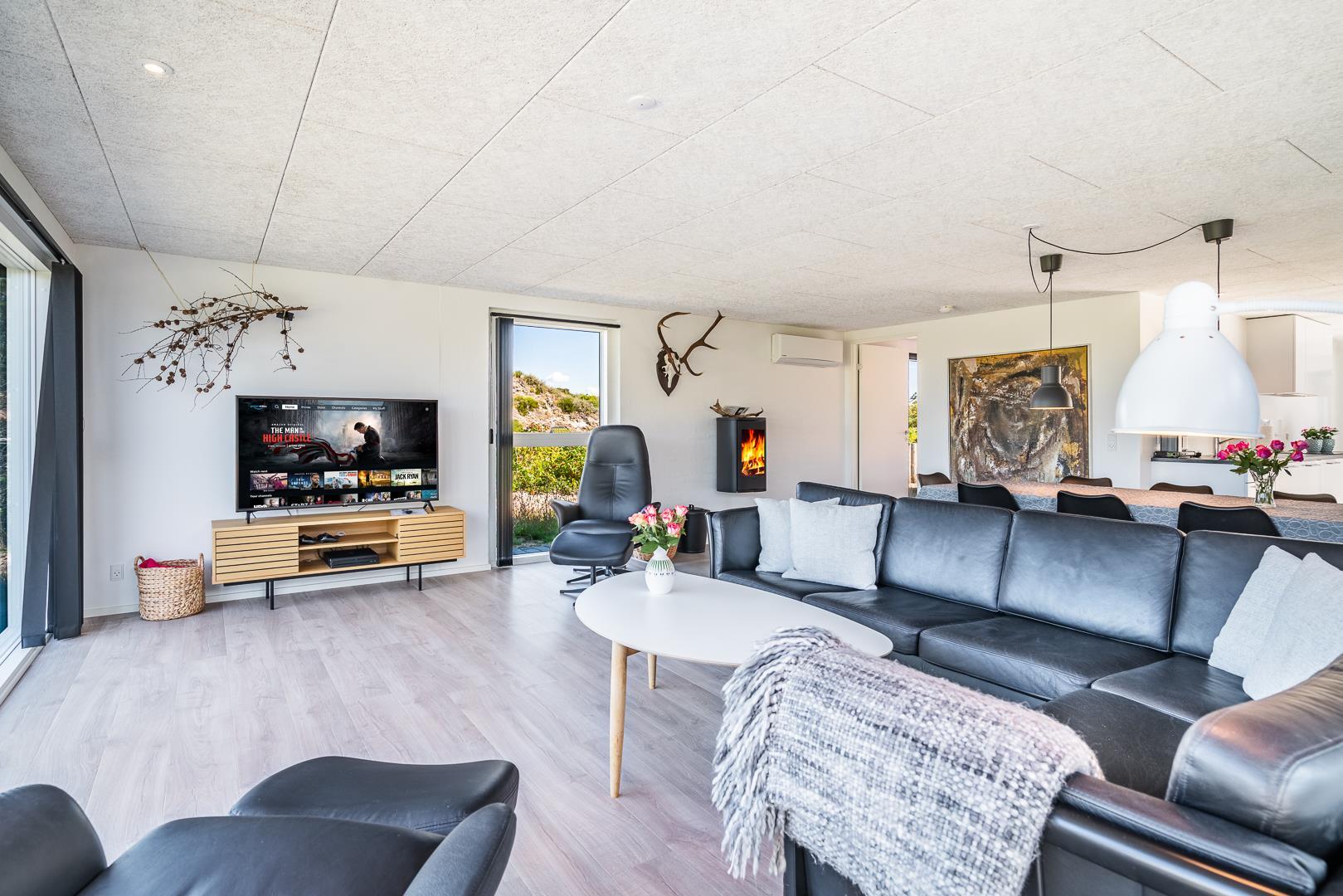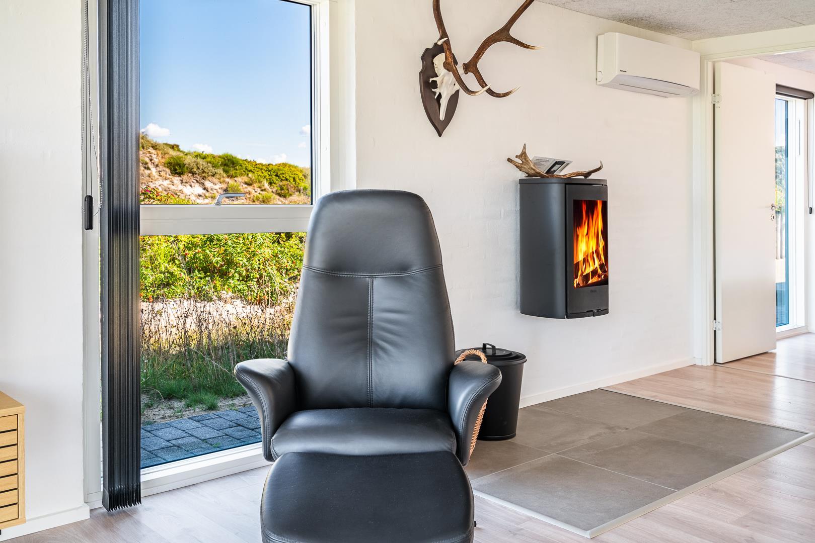 Når hele familien er samlet under ét tag, skal der være plads til både leg, ro og fælles oplevelser – og det får I her. Sommerhuset er indrettet med et stort opholdsrum i hjertet af boligen, hvor I kan slappe af foran brændeovnen, spille spil eller bare nyde at være sammen. De store vinduer skaber en rolig og lys stemning med udkig til naturen udenfor.