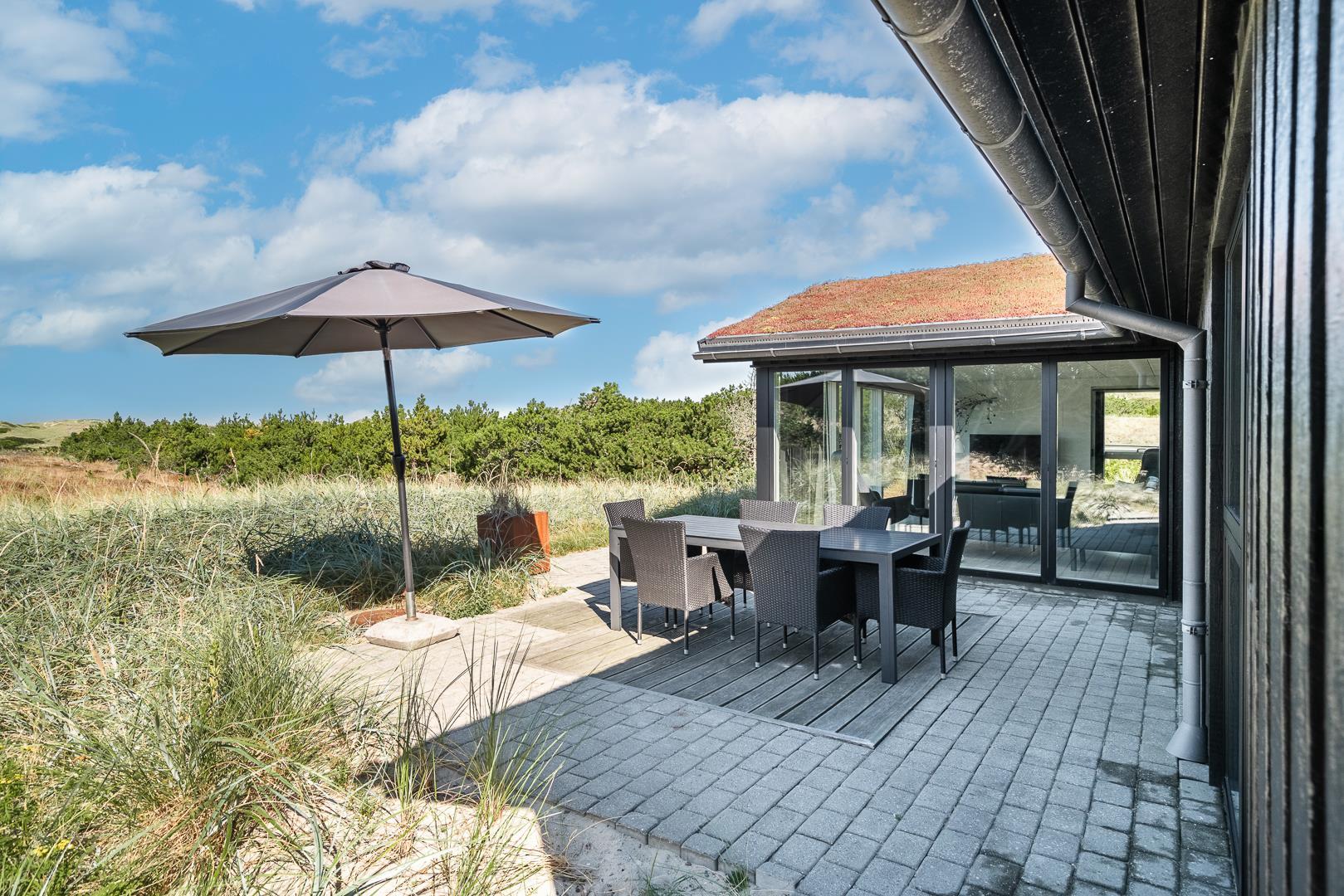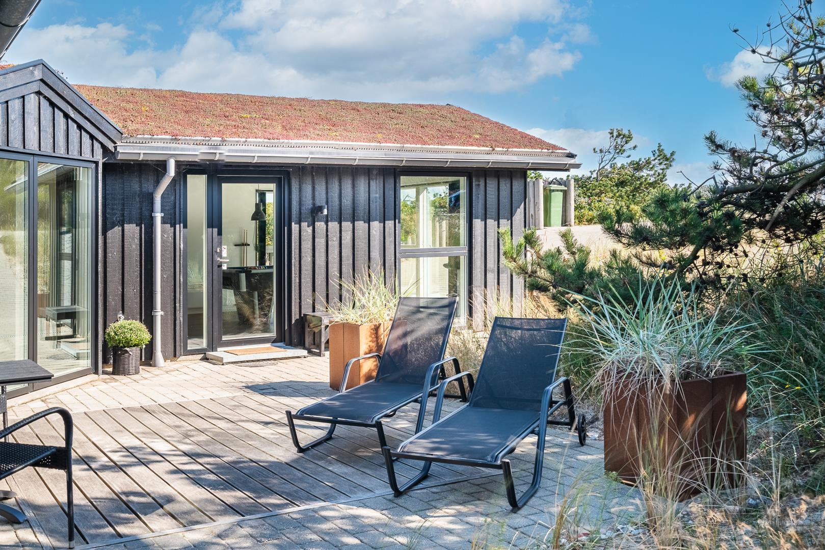 Udendørs område omkring sommerhuset på Timianvej 26 er skabt til afslapning i rolige, naturskønne rammer. Den store terrasse ligger med direkte udsigt til de vestjyske klitter og indbyder til både solbadning, måltider i det fri og hyggelige grillaftener. Her får I jeres eget private spot midt i naturen – med fred og frisk havluft som baggrund.