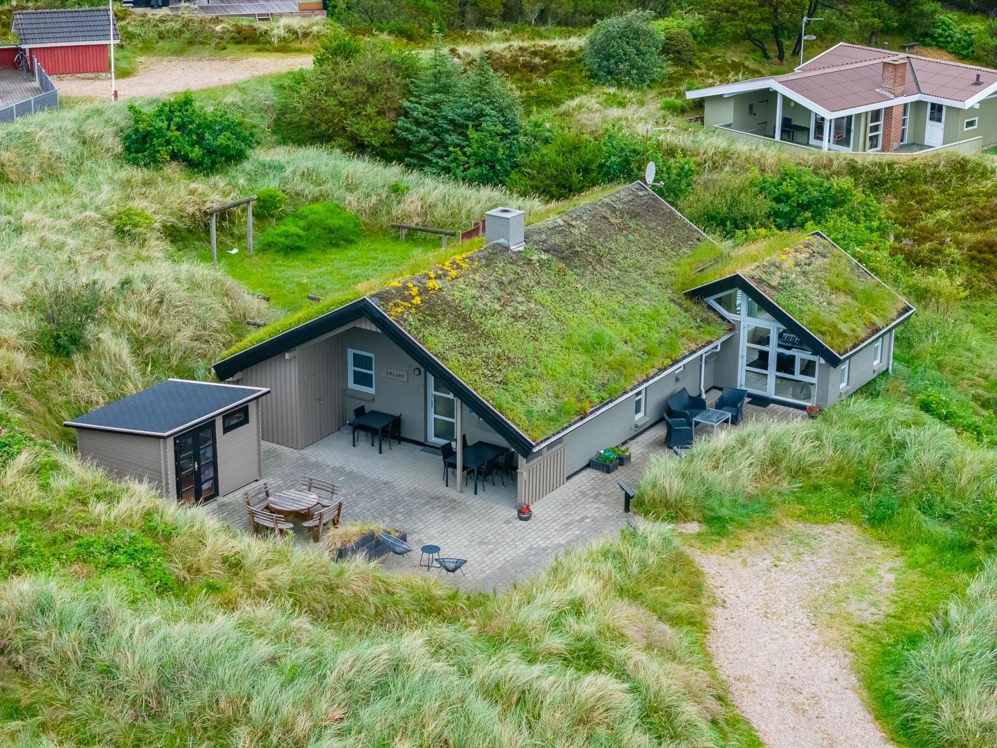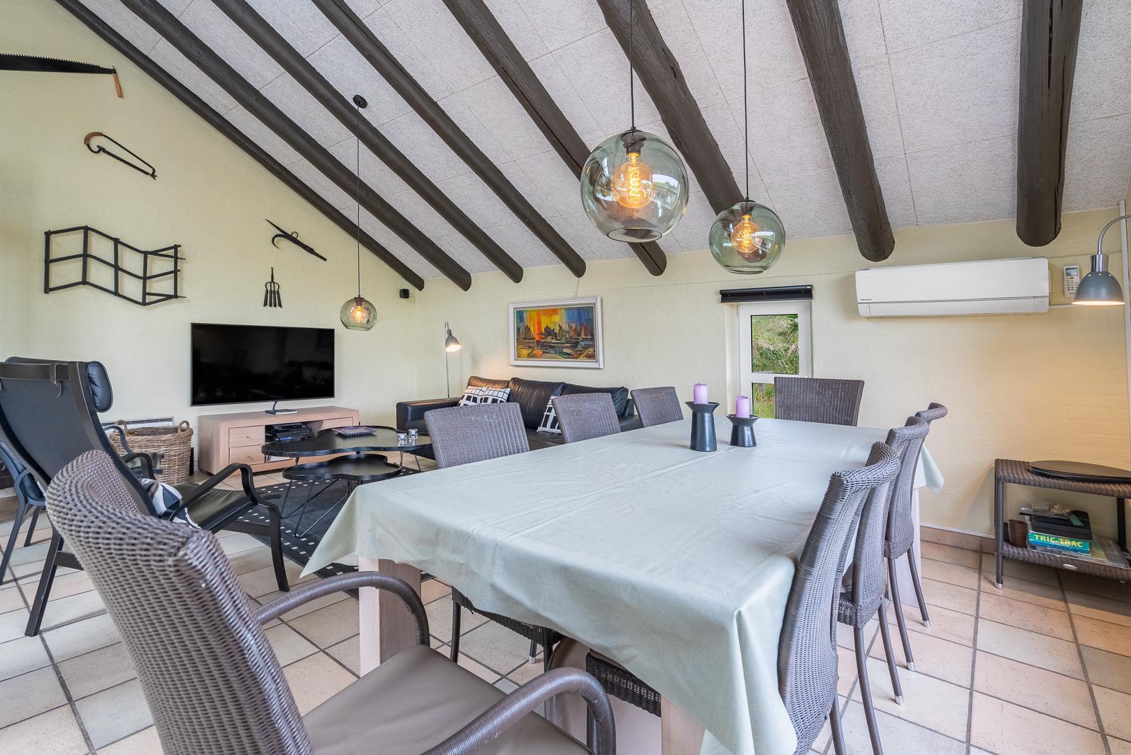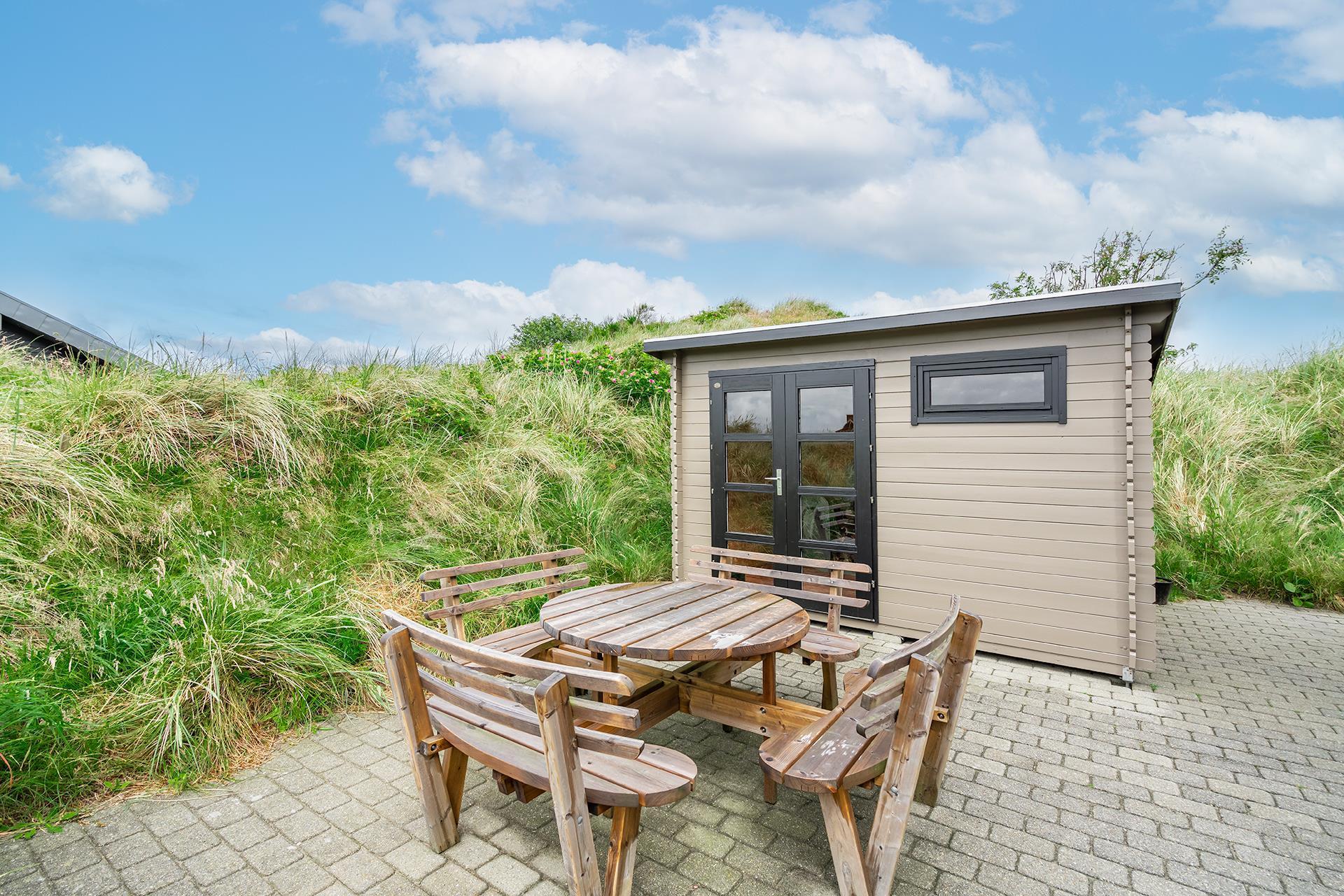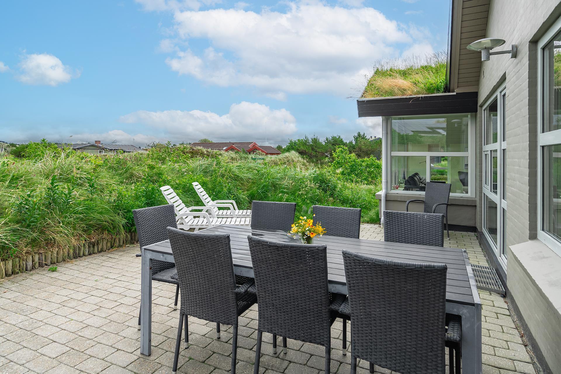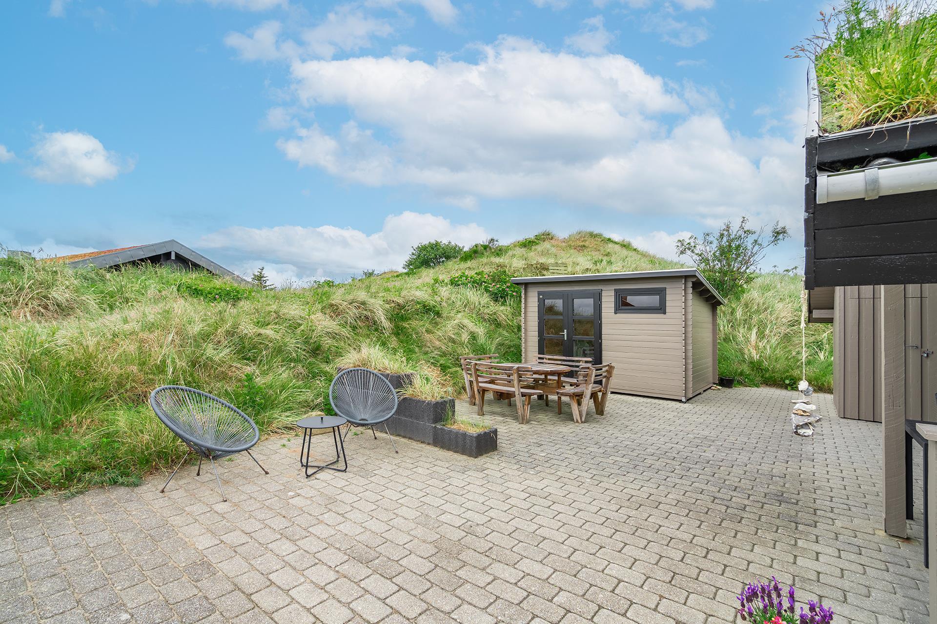 Udenfor finder du en dejlig stor og delvist overdækket terrasse – så her er gode muligheder for at nyde solens varme stråler eller finde en plads i skyggen hvis det skulle blive for varmt. Et dejligt sommerhus til familien i Henne Strand - ideelt placeret tæt på både strand og bymidte.