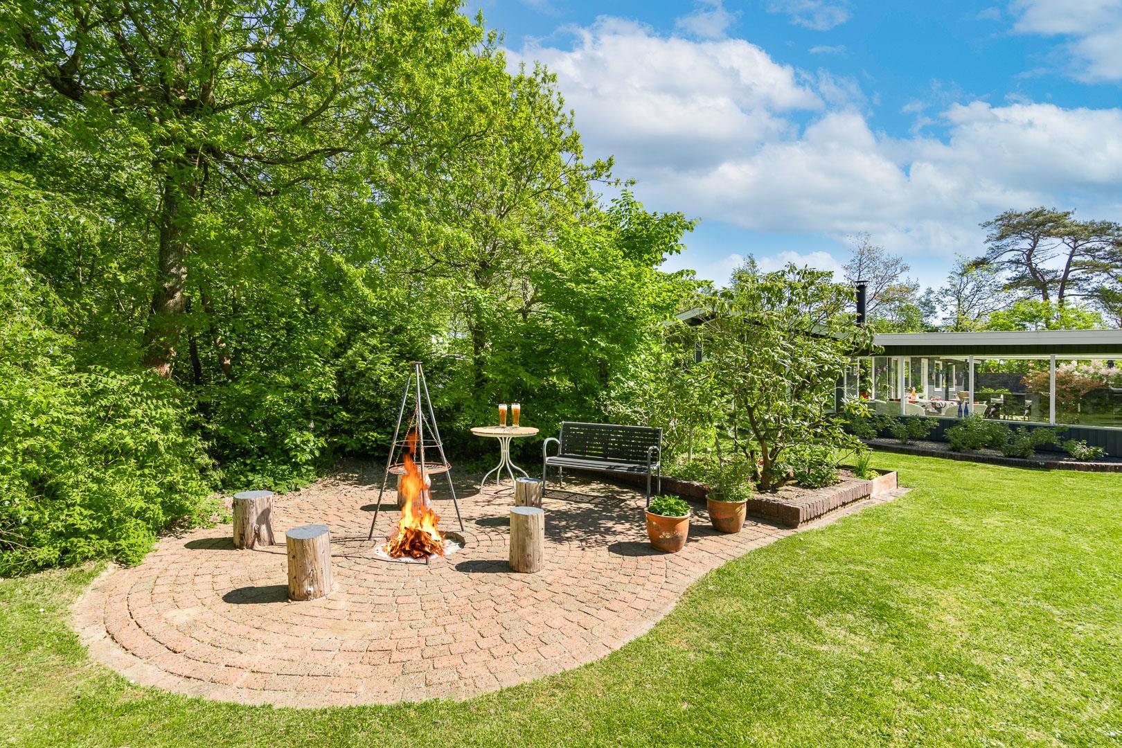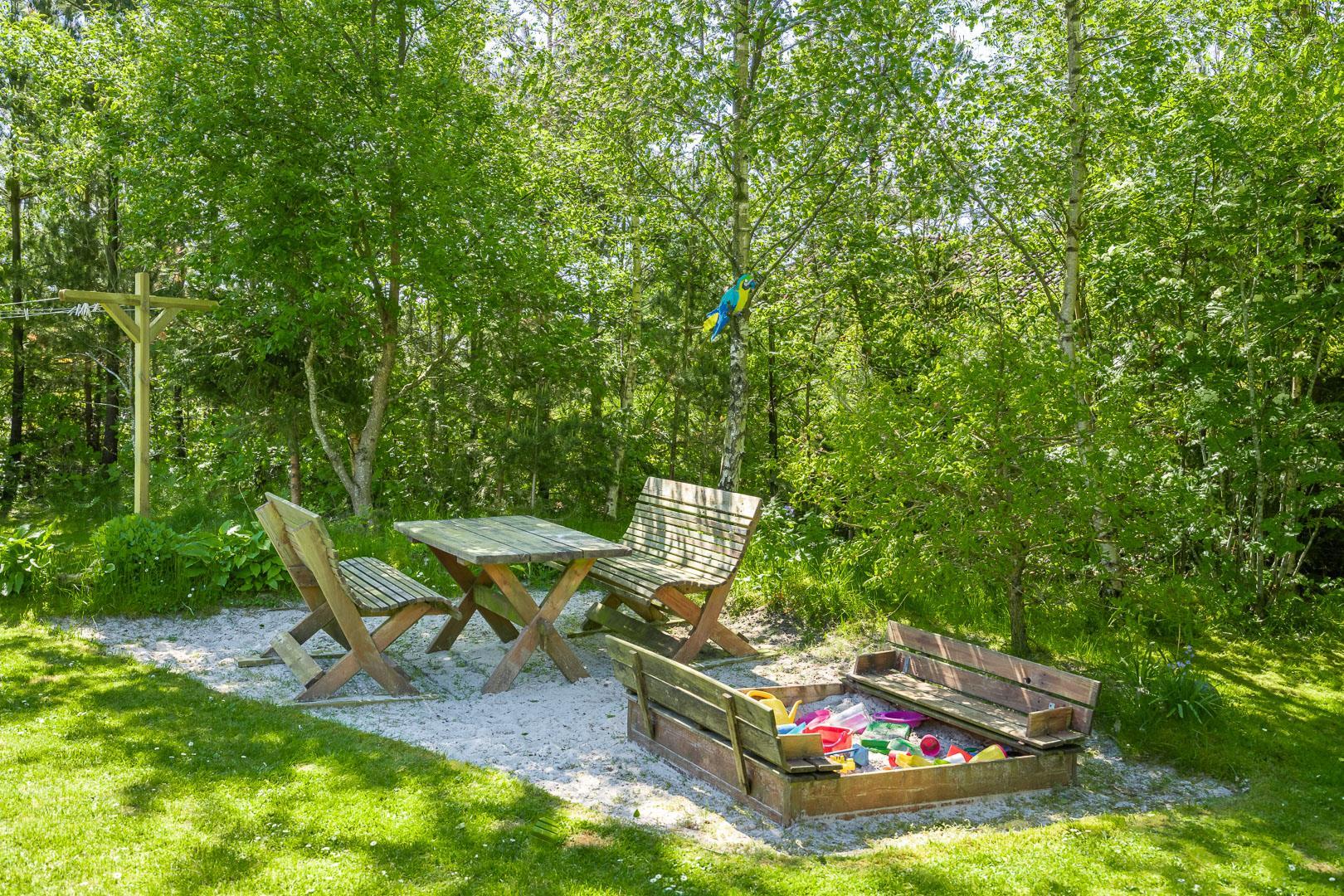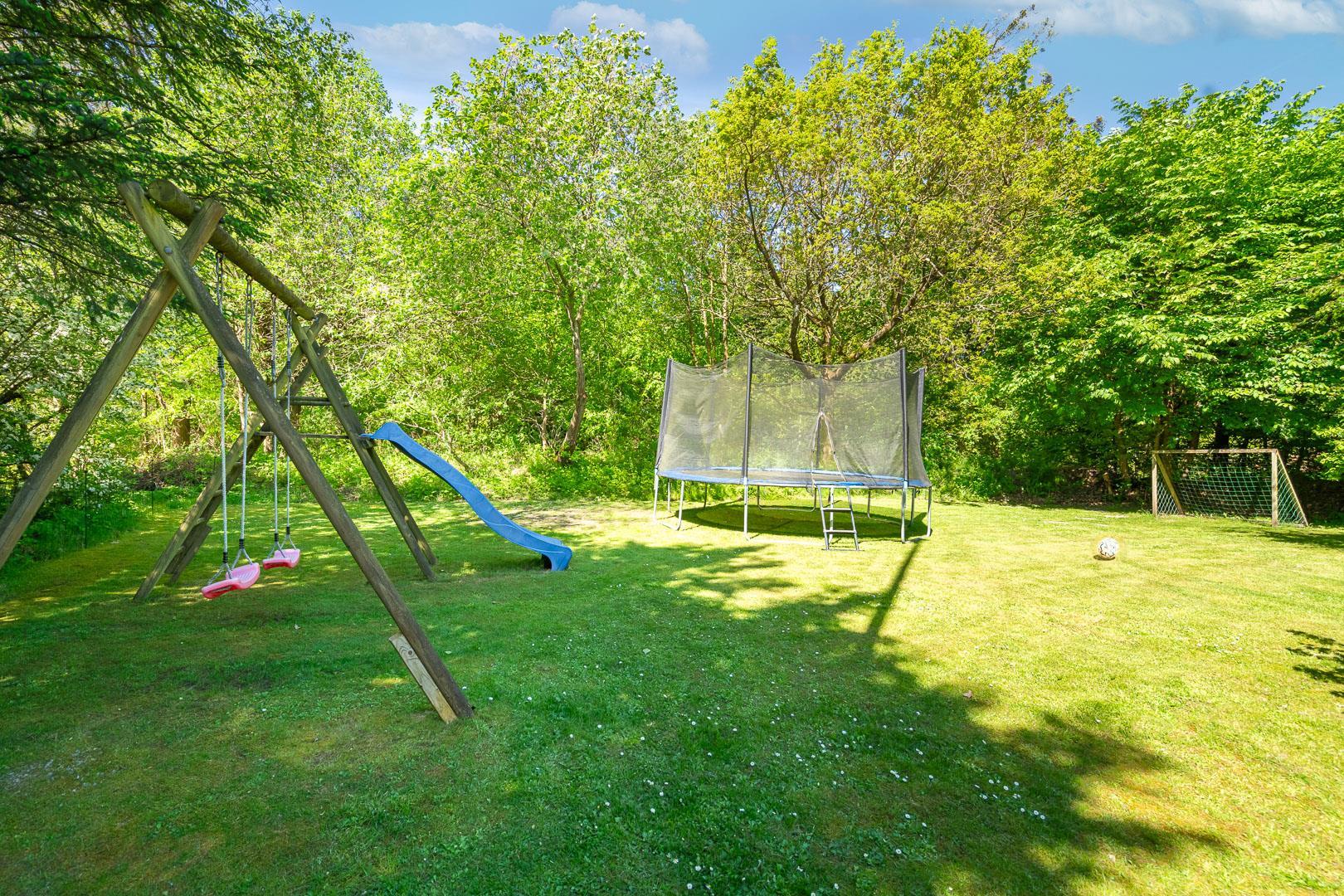 Udendørs er der noget for enhver smag, med en bred vifte af aktiviteter for både børn og voksne. Mens de voksne kan nyde livet på terrassen, kan børnene boltre sig på gyngestativet, trampolinen eller i sandkassen. Et bål sted tilbyder mulighed for hyggelige udendørs ferieoplevelser, og den delvist indhegnede grund gør det ideelt for firbenede familiemedlemmer.
