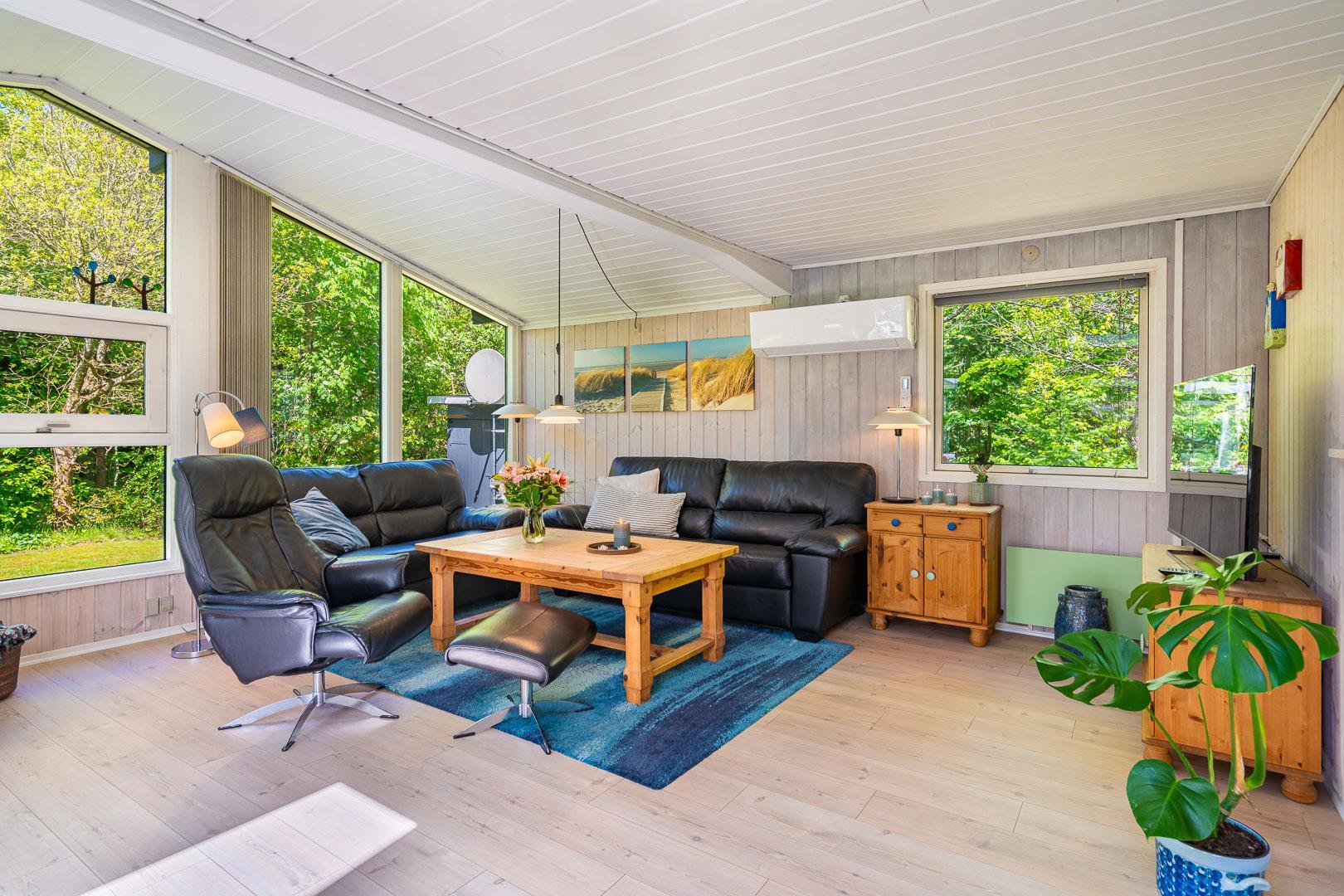 Træd ind i den rummelige og lyse stue, der smelter sammen med spisestuen og det veludstyrede køkken. Centralt placeret finder du en hyggelig brændeovn og en praktisk varmepumpe, der sikrer behagelige temperaturer uanset årstid. Fra stuen er der udgang til en særdeles skøn og overdækket terrasse, hvor du kan slappe af og nyde den betagende udsigt over den smukke naturgrund.