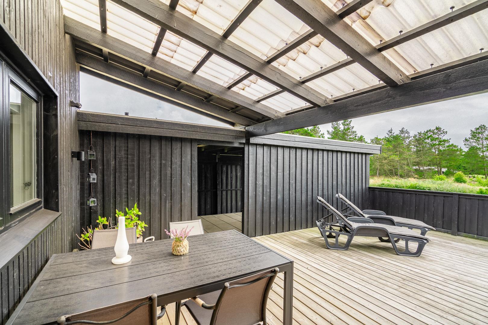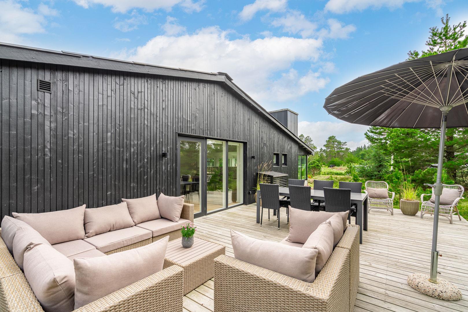 Sommerhuset ligger på en stor og dejlig naturgrund, og det fantastiske udendørs miljø byder på flere indbydende træterrasser, udstyret med alt hvad hjertet begærer af havemøbler og endda en udebruser til de varme sommerdage. En af terrasserne ligger direkte ved indgangen og er delvist overdækket, mens de andre to terrasser fordeler sig omkring sommerhuset og er forbundet med en charmerende gangbro af træ. Her finder du mange hyggekroge og gode læ forhold, som gør at du har rig mulighed for at til at ligge og slappe af og fordybe dig i en god bog eller sidde og spille et spil med resten af familien.