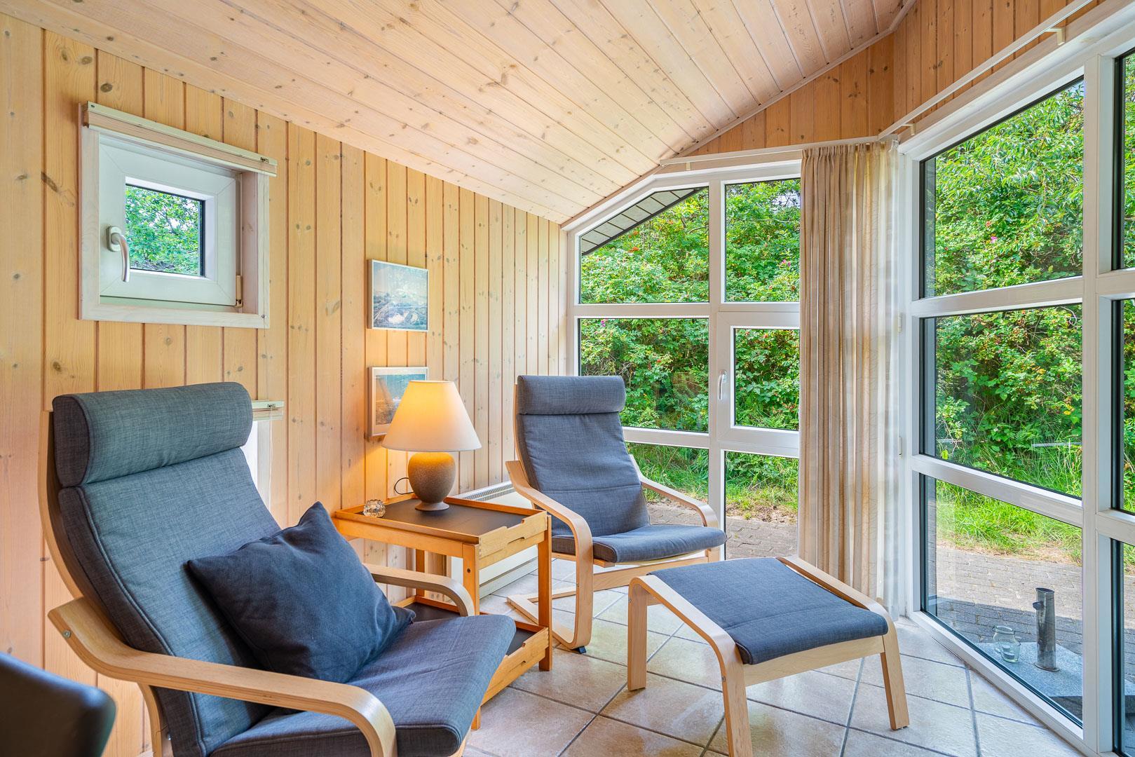 Velholdt feriehus på ugeneret klitgrund nær vandet med spa, sauna og stor terrasse.