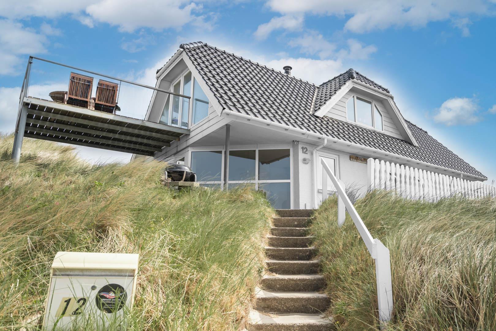 Det charmerende feriehus passer perfekt ind i de idylliske omgivelser. Det er nærmest bygget ind i en en klit, hvilket både skaber læ og gode udsigtspunkter på grunden.