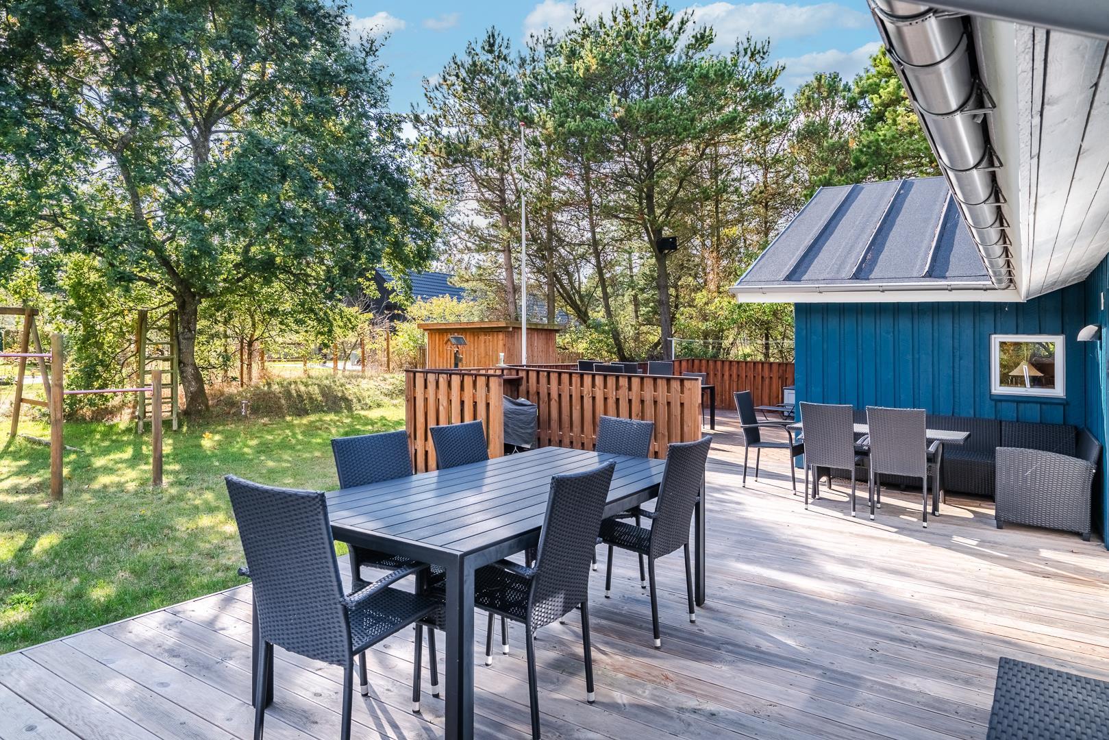 Hyggeligt og skønt feriehus med komfortable møbler beliggende på skøn, stor og ugeneret naturgrund velegnet til familier med børn. Her er blandt andet fodboldbane med 2 mål samt et utal af andre legeredskaber. Der er lavet en Krolfbane på grunden. Huset fremtræder overalt lyst og venligt. Feriehuset er blevet tilbygget med ekstra badeværelse med spa og 2 soverum. Der er en Krolfbane på grunden. Huset ligger i det dejlige feriehus område Henne by. Der er cykelstier, som går direkte Filsø og til Vesterhavet. I dette pragtfulde og velpassede feriehus er rammerne skabt til en god ferie.