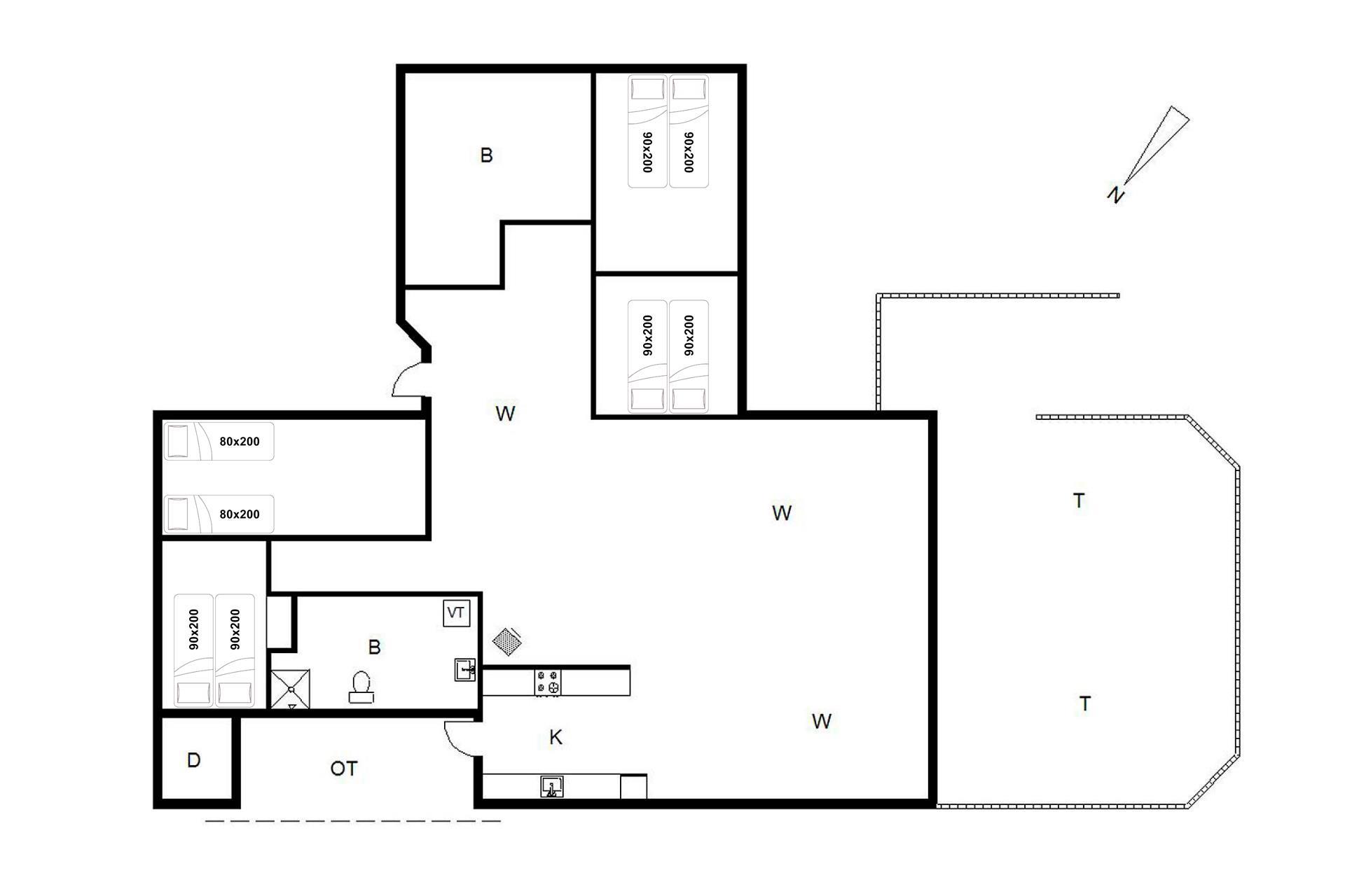 Sengestørrelse: 3 dobbeltsenge med 2 madrasser 90 x 200 cm + 2 enkeltsenge 80 x 200 cm.