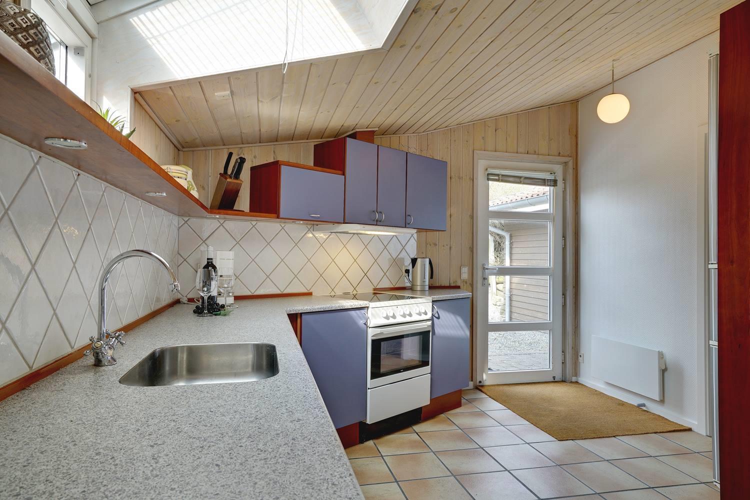 Dejligt feriehus som er blevet moderniseret, er beliggende på en sydvendt grund på en blind stikvej tæt på havet og centrum. Stort, lækkert køkken/alrum med klinkegulv. Fra stuen er der udgang til terrassen, som er delvis overdækket, og hvor også sandkassen er placeret. Gyngen befinder sig bag huset. Badeværelse med god, stor sauna og spabad. Toilet er lavet i separat rum. 3 soverum med nye senge.