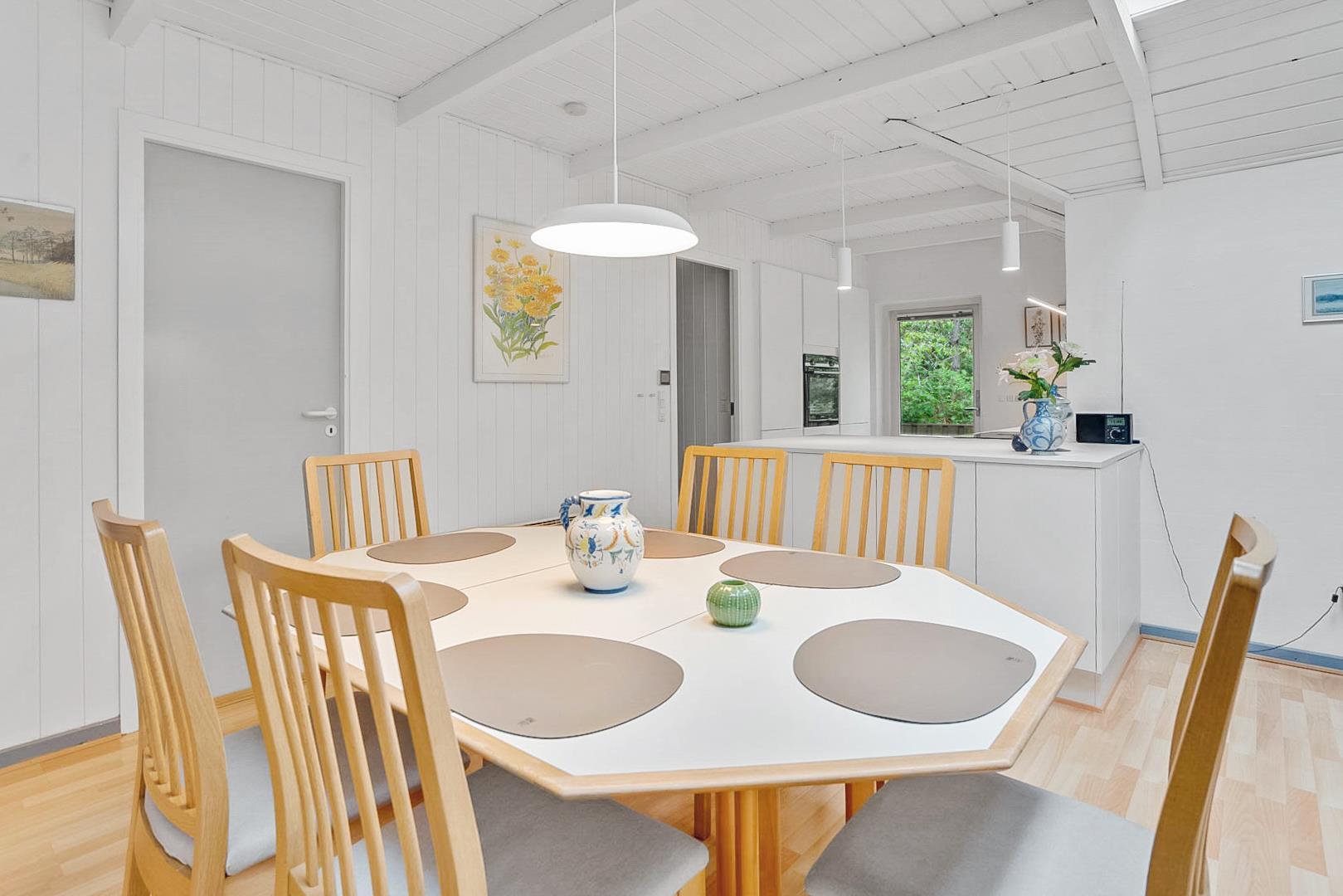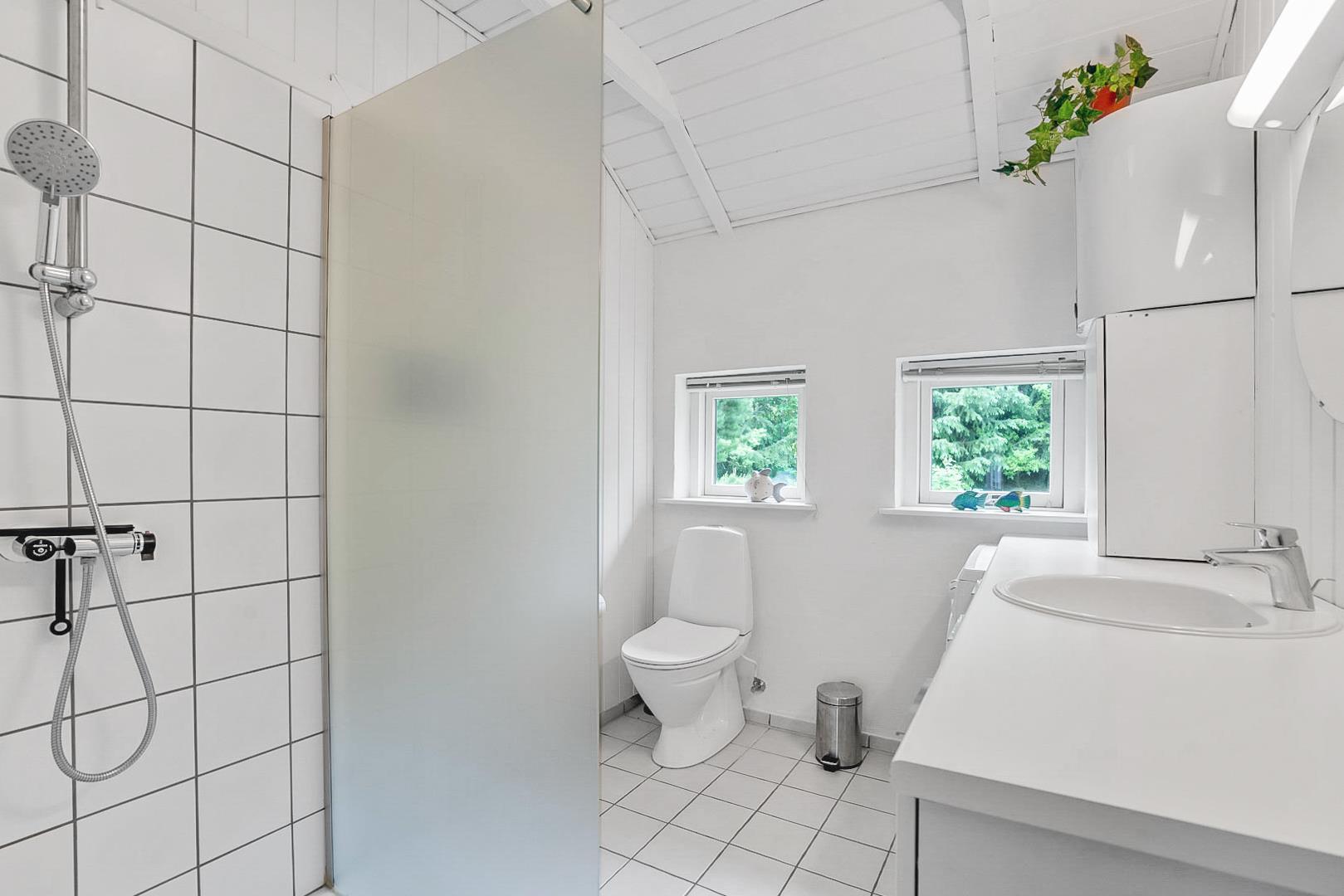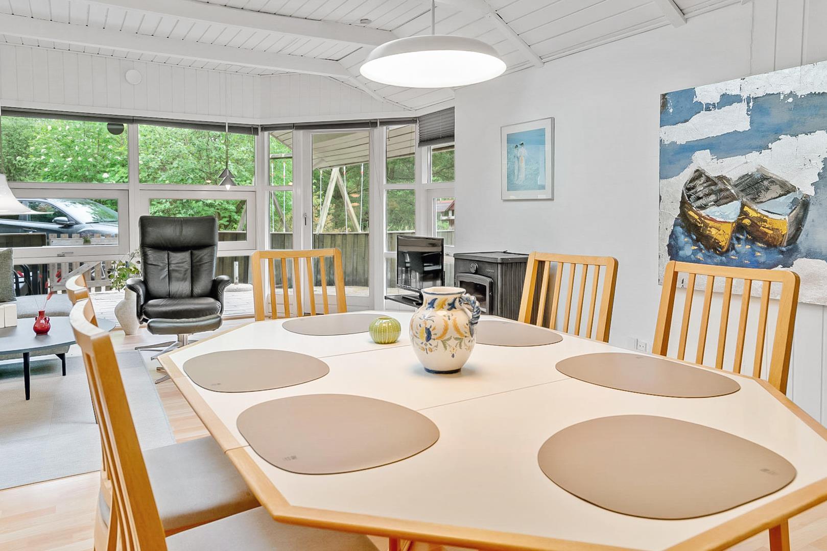 Udenfor er sommerhuset omkranset af en terrasse, der delvist er overdækket. Her kan du nyde solen til enhver tid på dagen, uanset vejret. Terrassen er det ideelle sted at fordybe sig i en god bog eller bare nyde stilheden og udsigten over den omkringliggende natur.