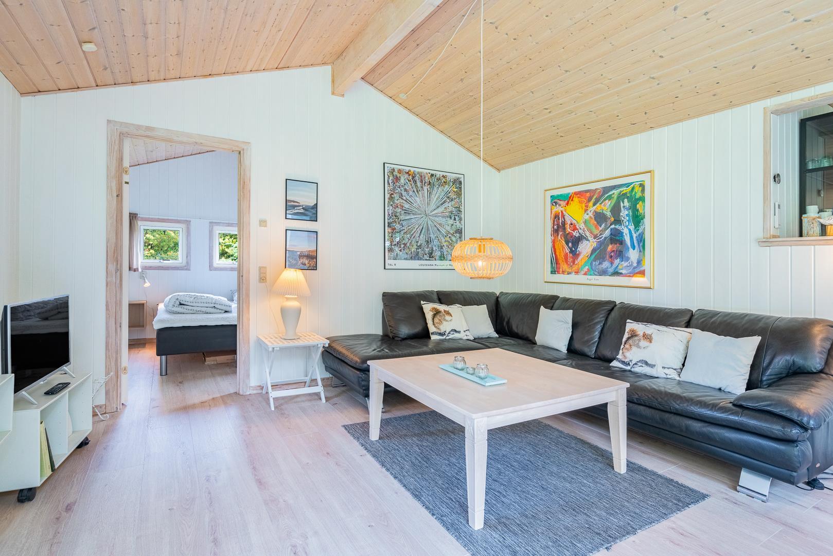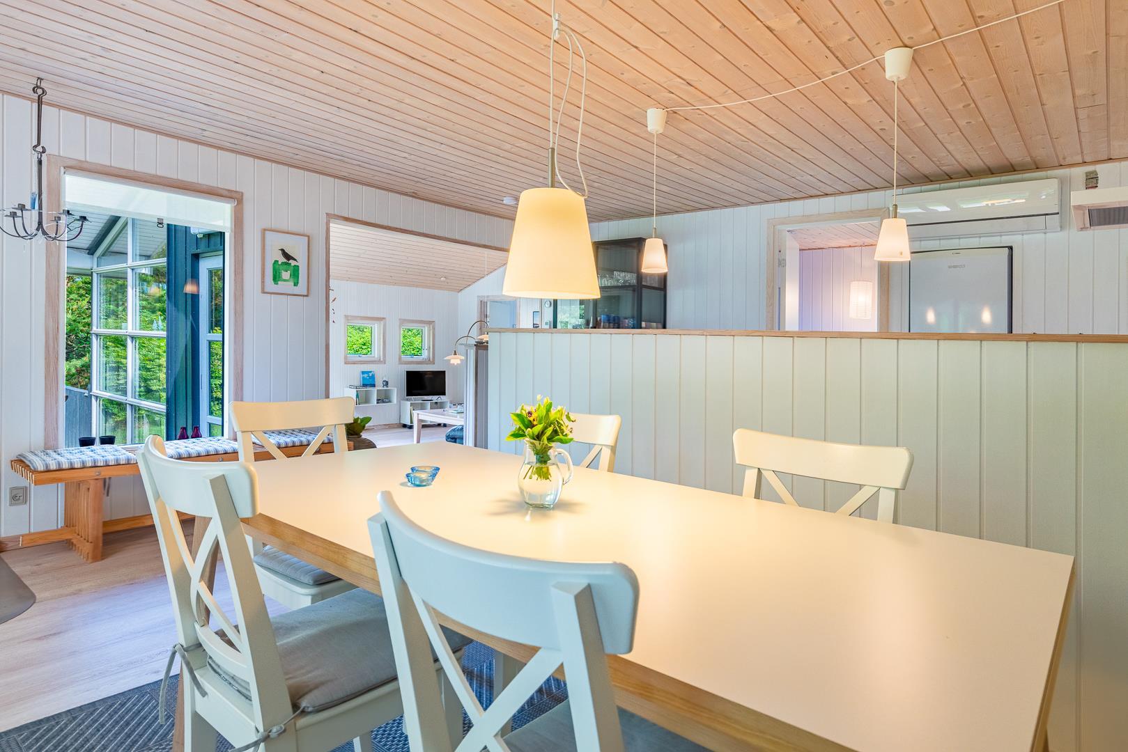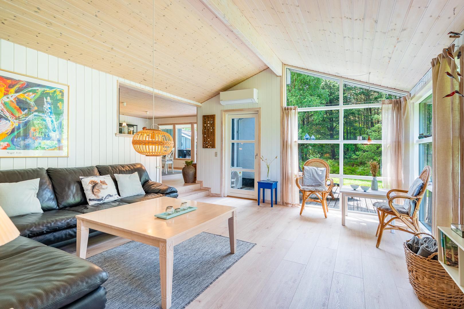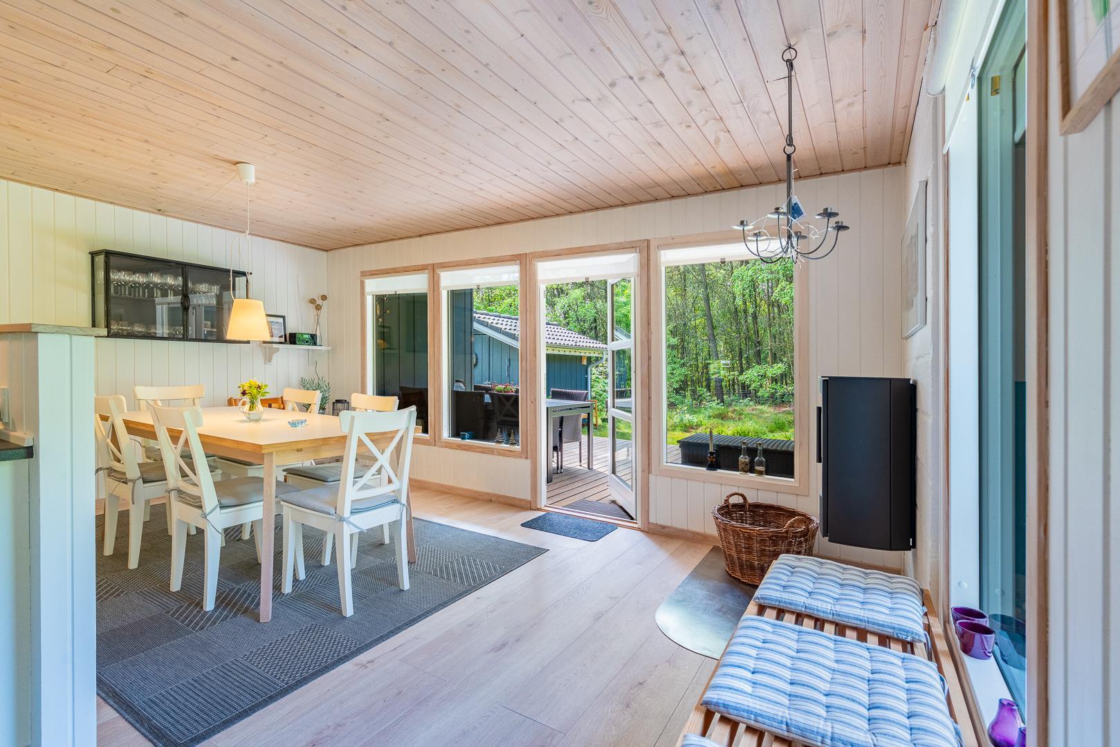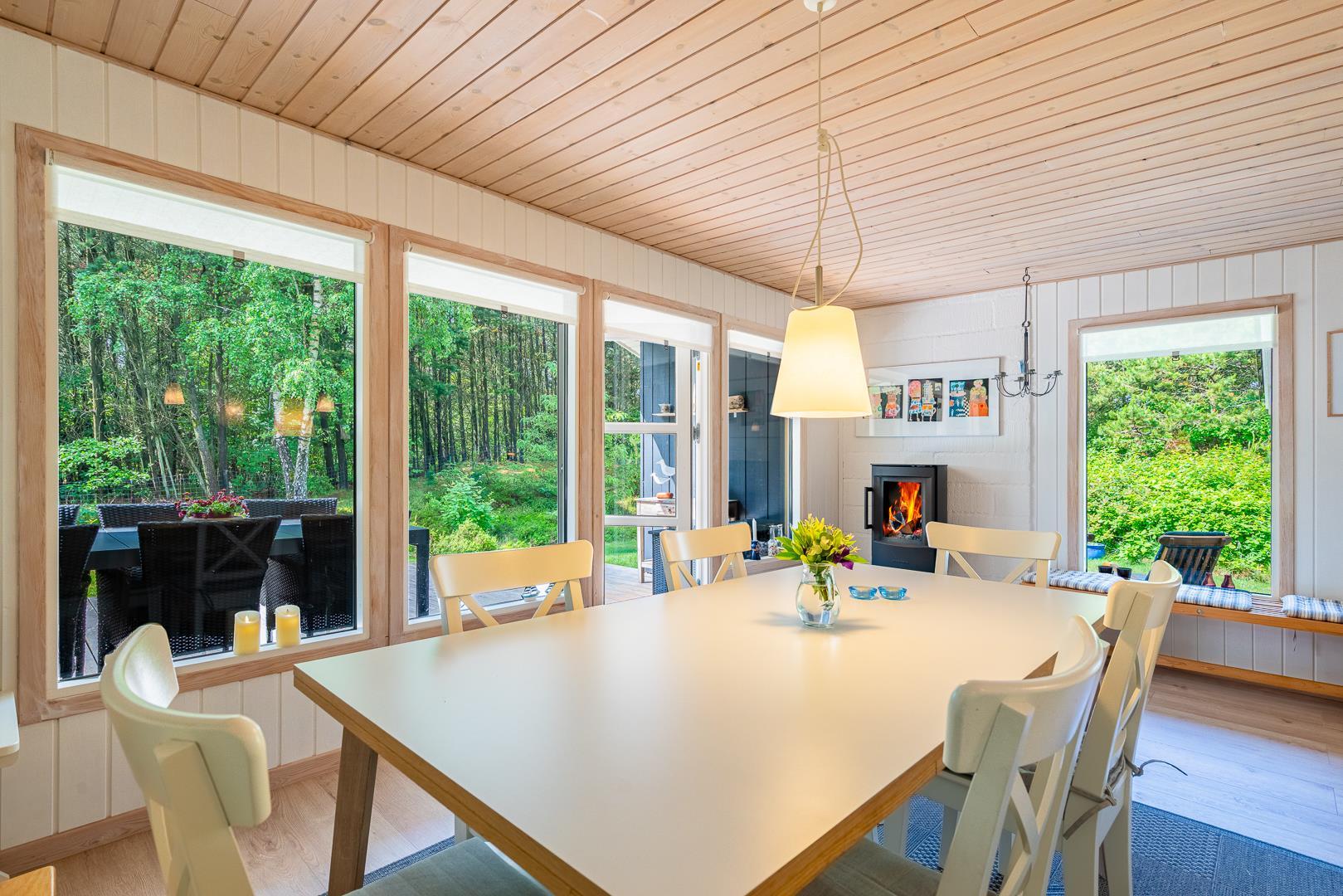 Stuen har store vinduespartier, som giver et lyst og åbent rum med masser af dagslys. På køligere aftener giver brændeovnen varme og stemning, mens en moderne varmepumpe sørger for komfort hele året.