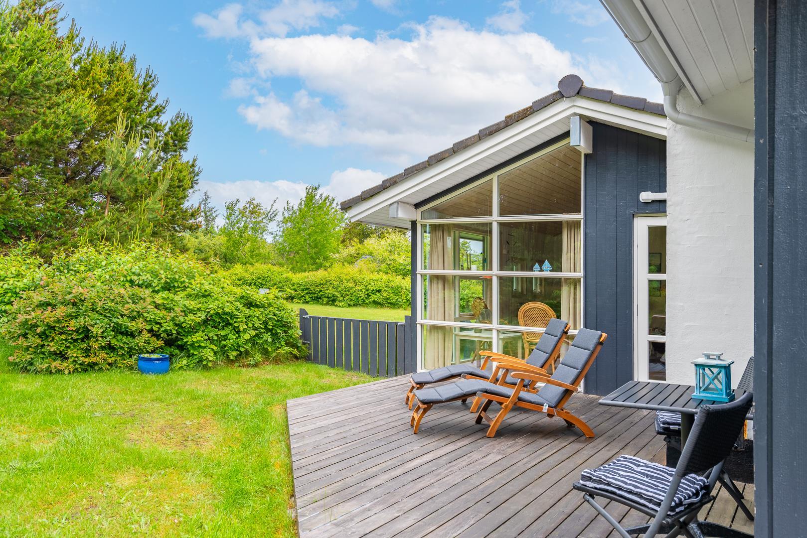 Udenfor finder I en sikker, indhegnet have, hvor børn og hund trygt kan lege. På den overdækkede terrasse er der mulighed for at nyde frokost eller bare slappe af med en kop kaffe. En gynge i haven sørger for børnenes underholdning.