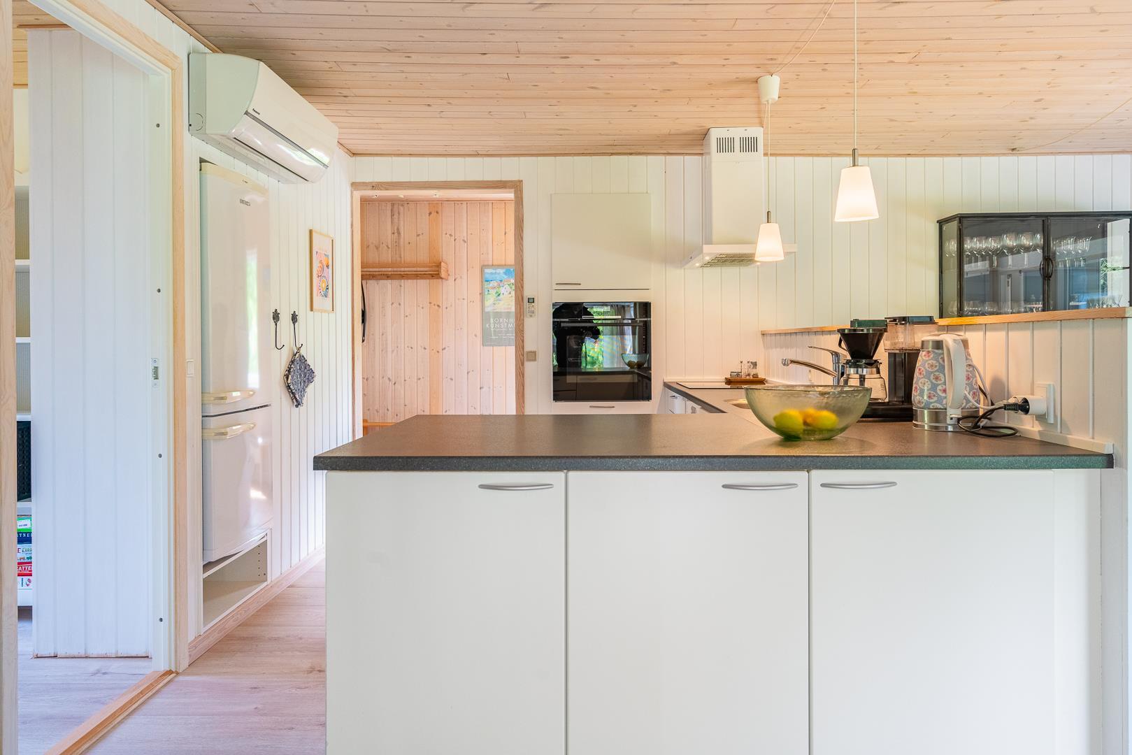 Det åbne køkken rummer alt, hvad I har brug for – inkl. opvaskemaskine – så det er nemt at nyde måltiderne sammen uden besvær bagefter.