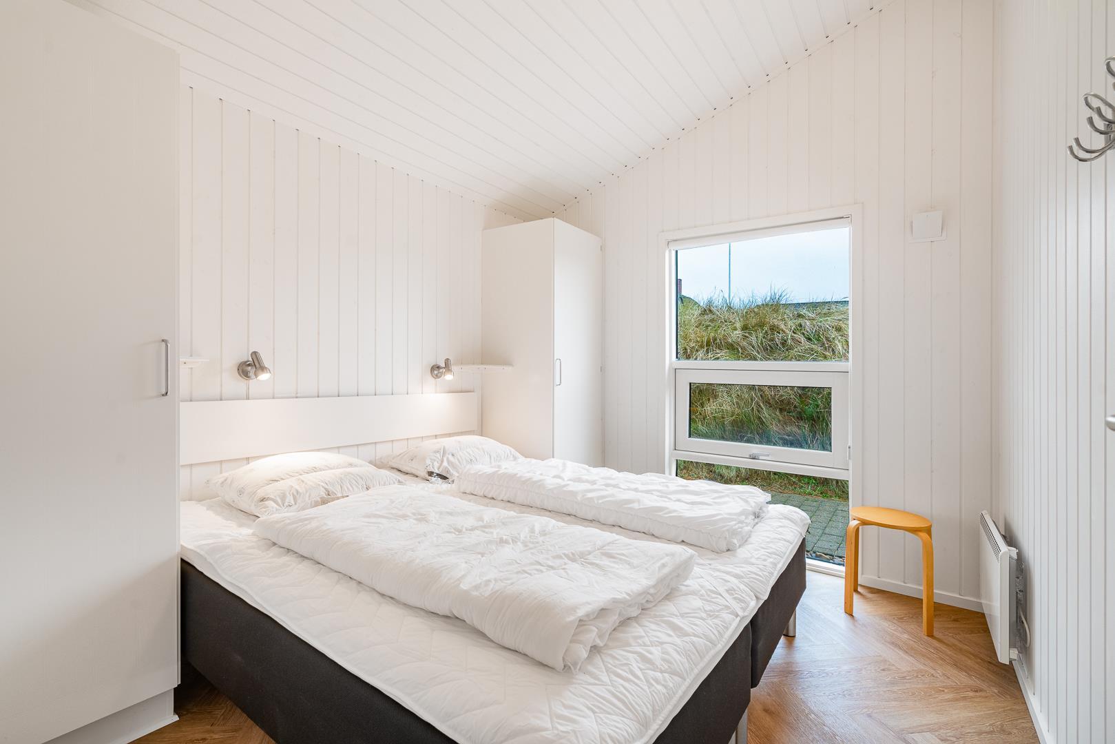 Dette skønne sommerhus har plads til 6 personer fordelt på 3 fine og velindrettede dobbeltværelser med faste skabe. Her er alt lyst og moderne indrettet – køkkenet er kombineret med stuen, så alle kan være sammen uanset om sidder ved brændeovnen, ser TV (danske og tyske kanaler), bruger husets gratis internet eller laver mad i køkkenet. Der er et meget stort lækkert badeværelse med bruseniche, vaskemaskine og tørretumbler - her har I jeres egen wellnessafdeling med sauna og badekar. Desuden er der et ekstra gæstetoilet.
