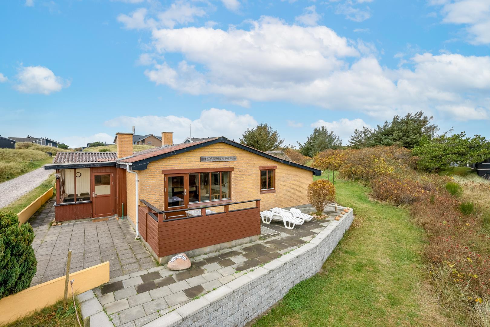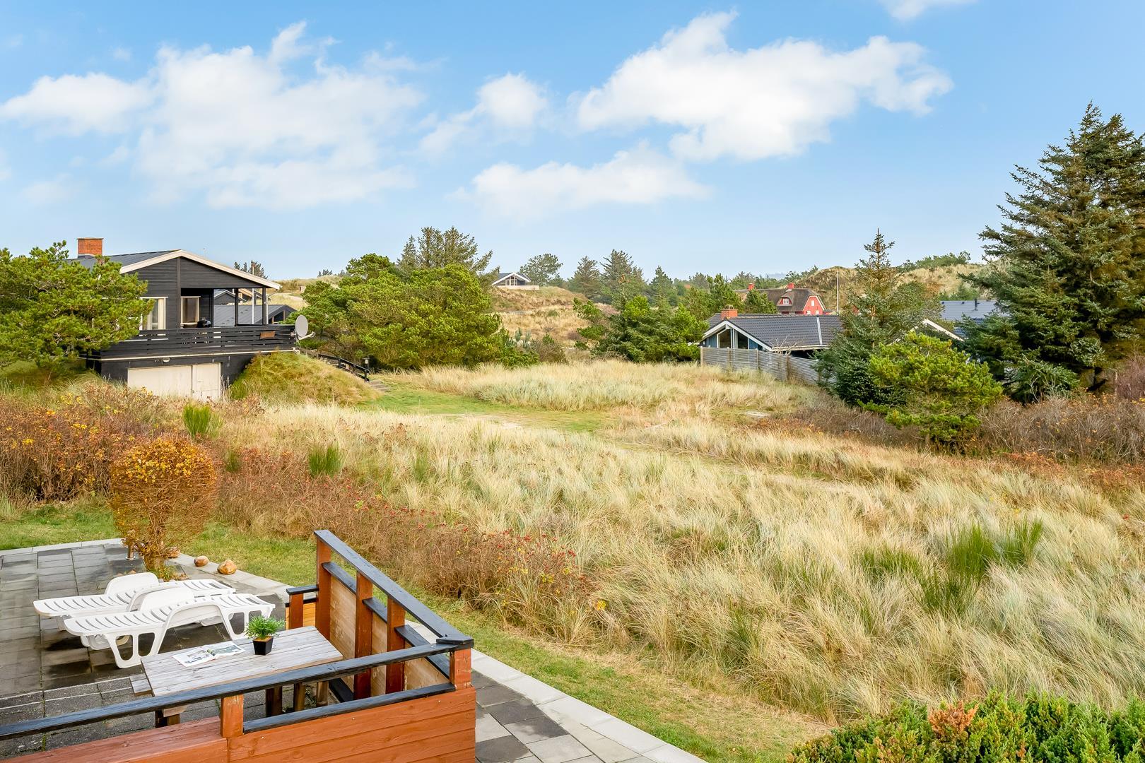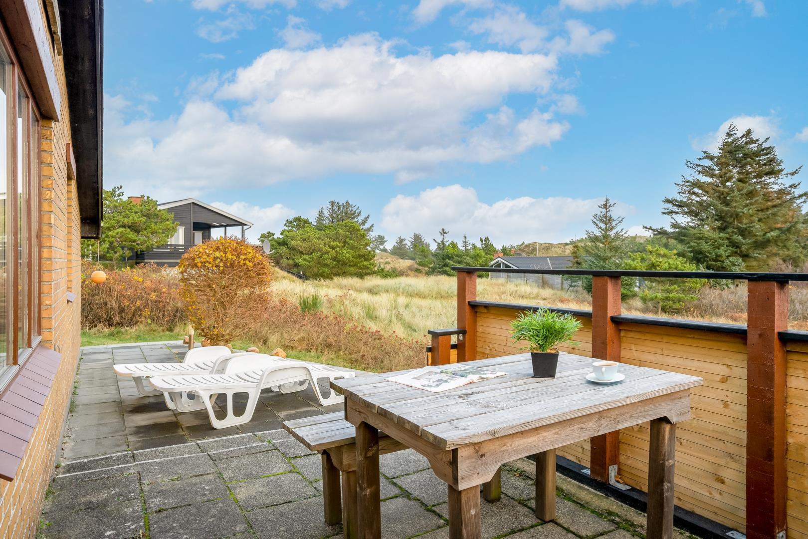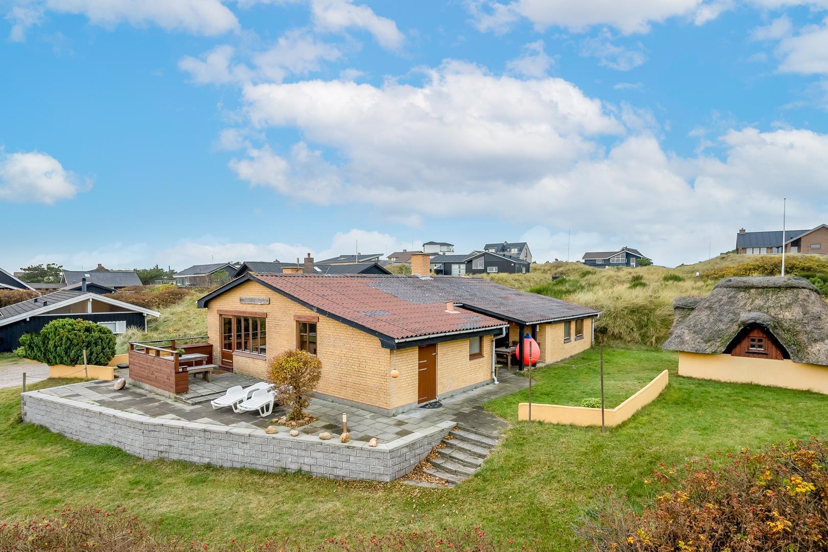 Omkring feriehuset er der flere gode terrasser. Der er gåafstand til Henne Strand by samt vestkystens bedste badestrand.