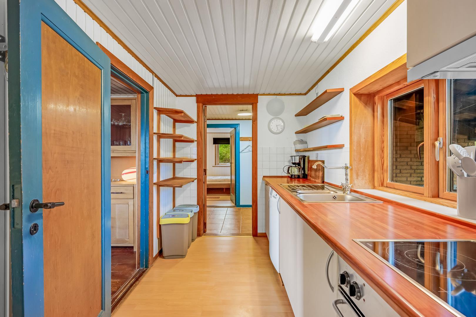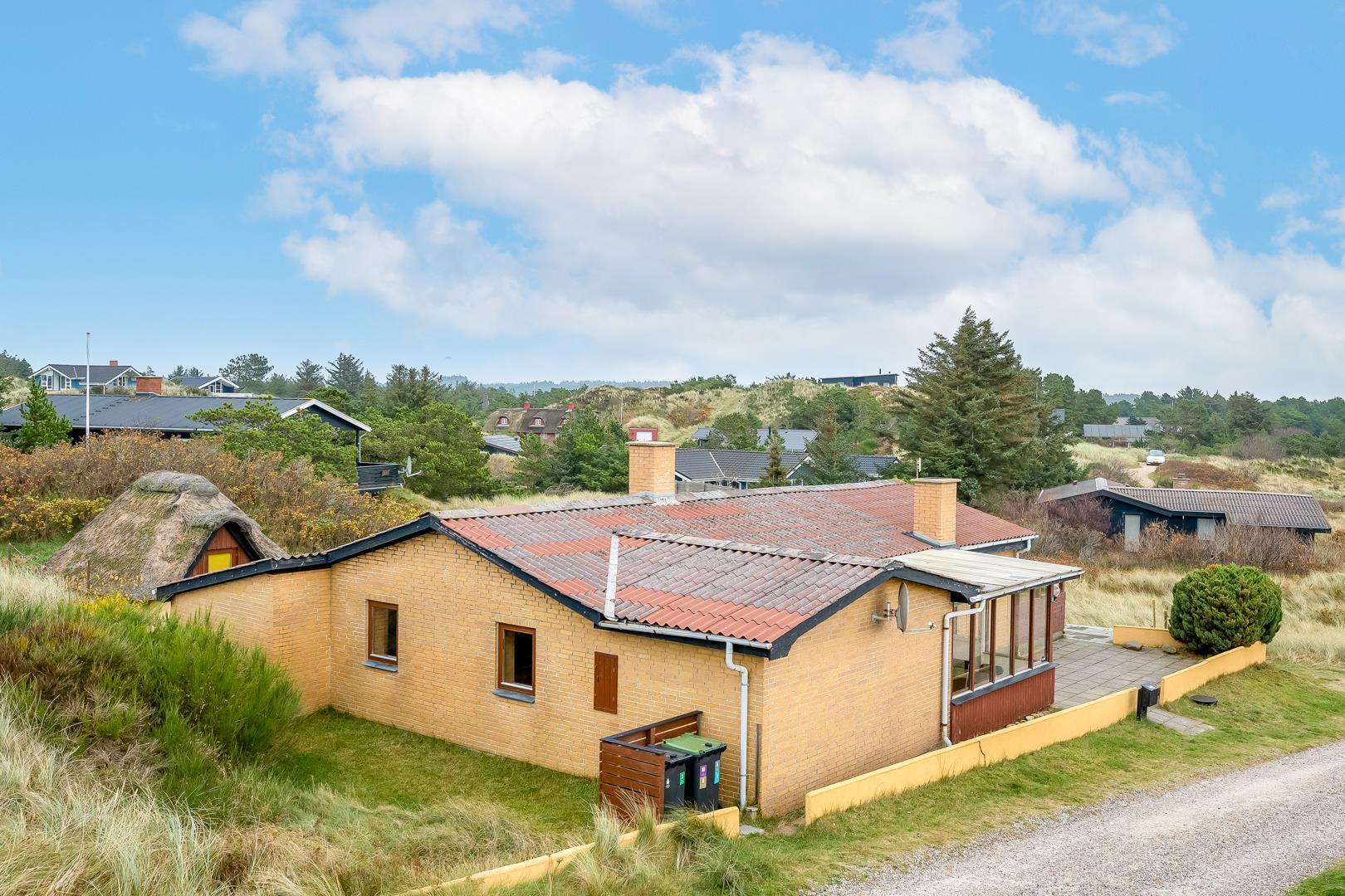 Rummeligt helmuret feriehus beliggende på en dejlig, større ugeneret kuperet klitgrund. Feriehuset er meget personligt indrettet råder over 2 badeværelser og køkken afd. Der er bl.a. 2 db. senge i huset.